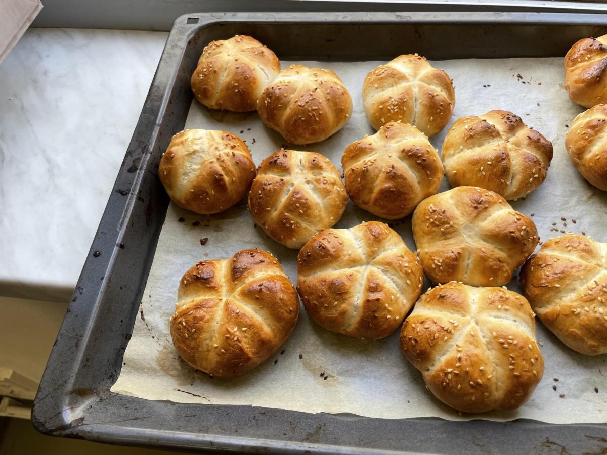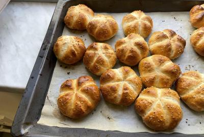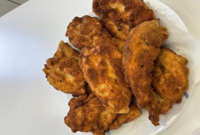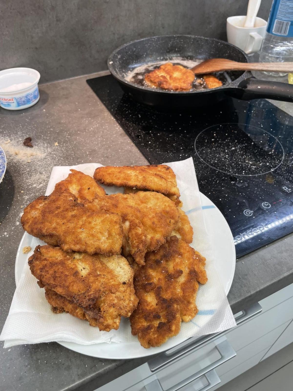 menu: kuřecí řízky, vařené brambory, piškot a kynuté housky - Kaiserky