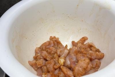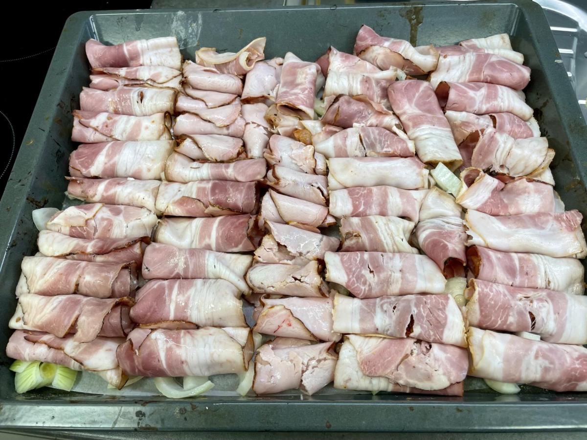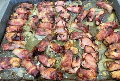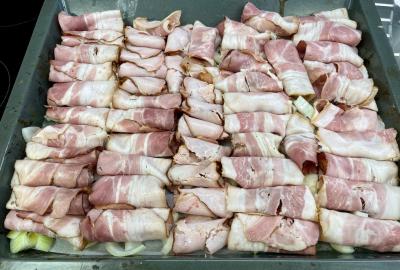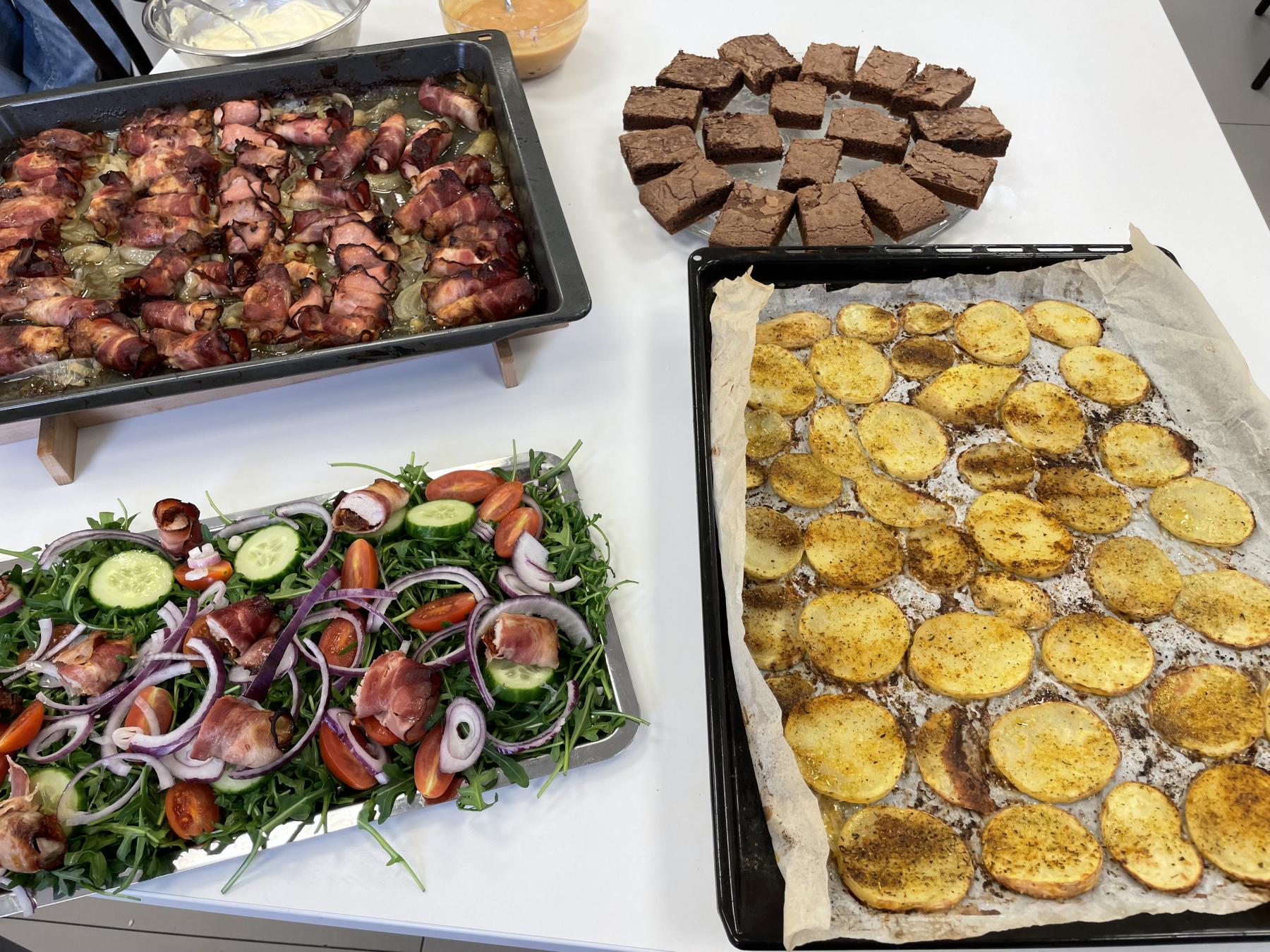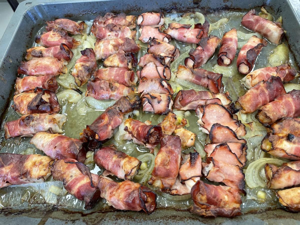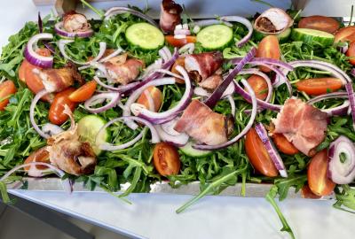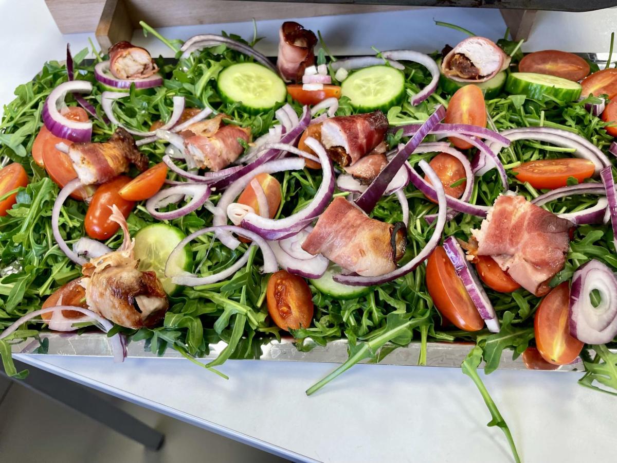 Kuřecí se sušeným rajčetem v slaninovém kabátku, americké brambory, Brownies, zeleninový salát a dva dipy...