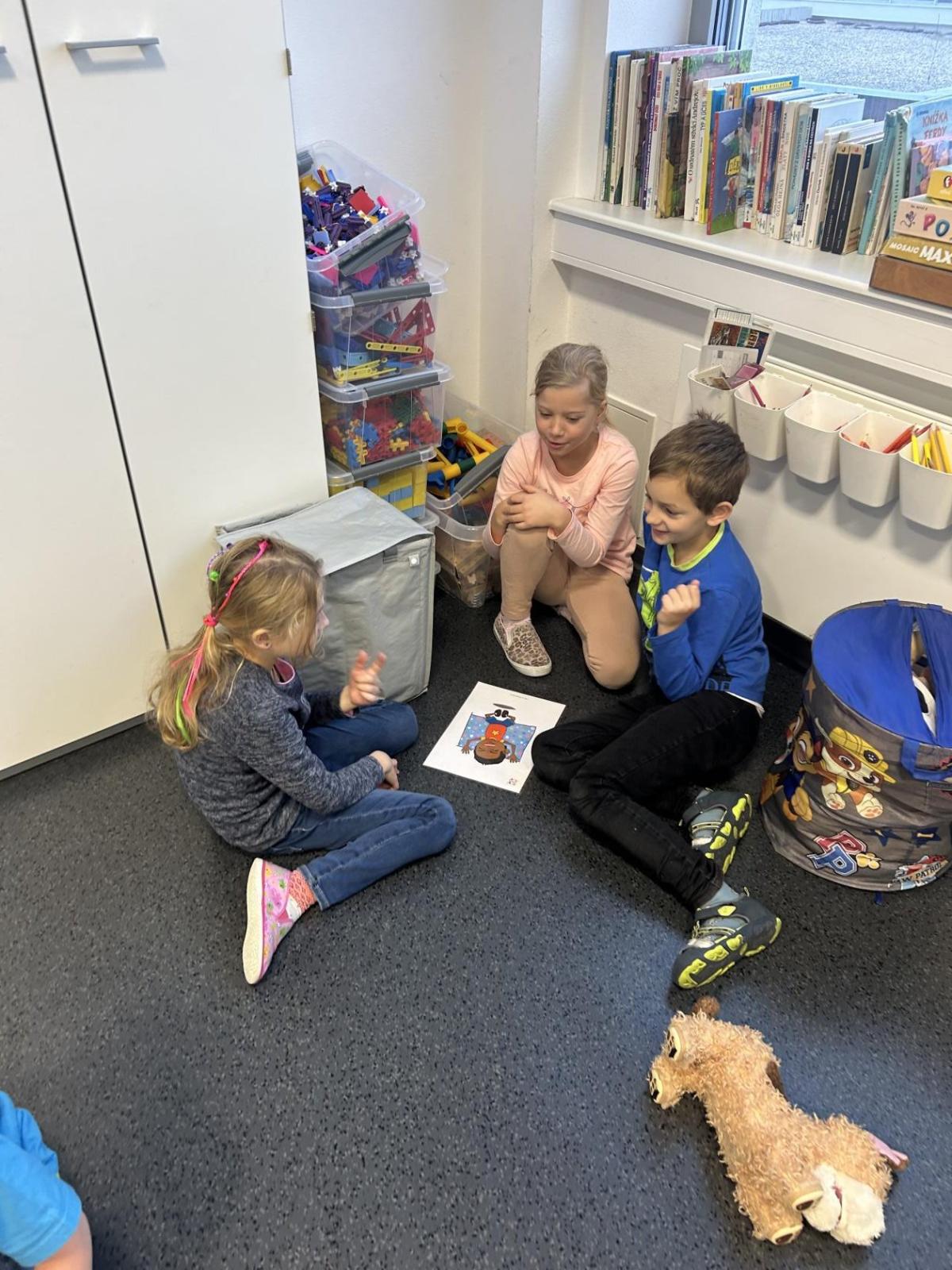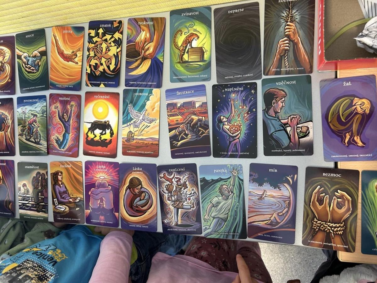 V další části jsme si hráli hru, při které měly děti propojovat emoci s jejím možným projevem nebo situací, ve které se může objevit. Postupně jsme tak došli k tomu, že emoce nám pomáhají porozumět sobě i ostatním.
