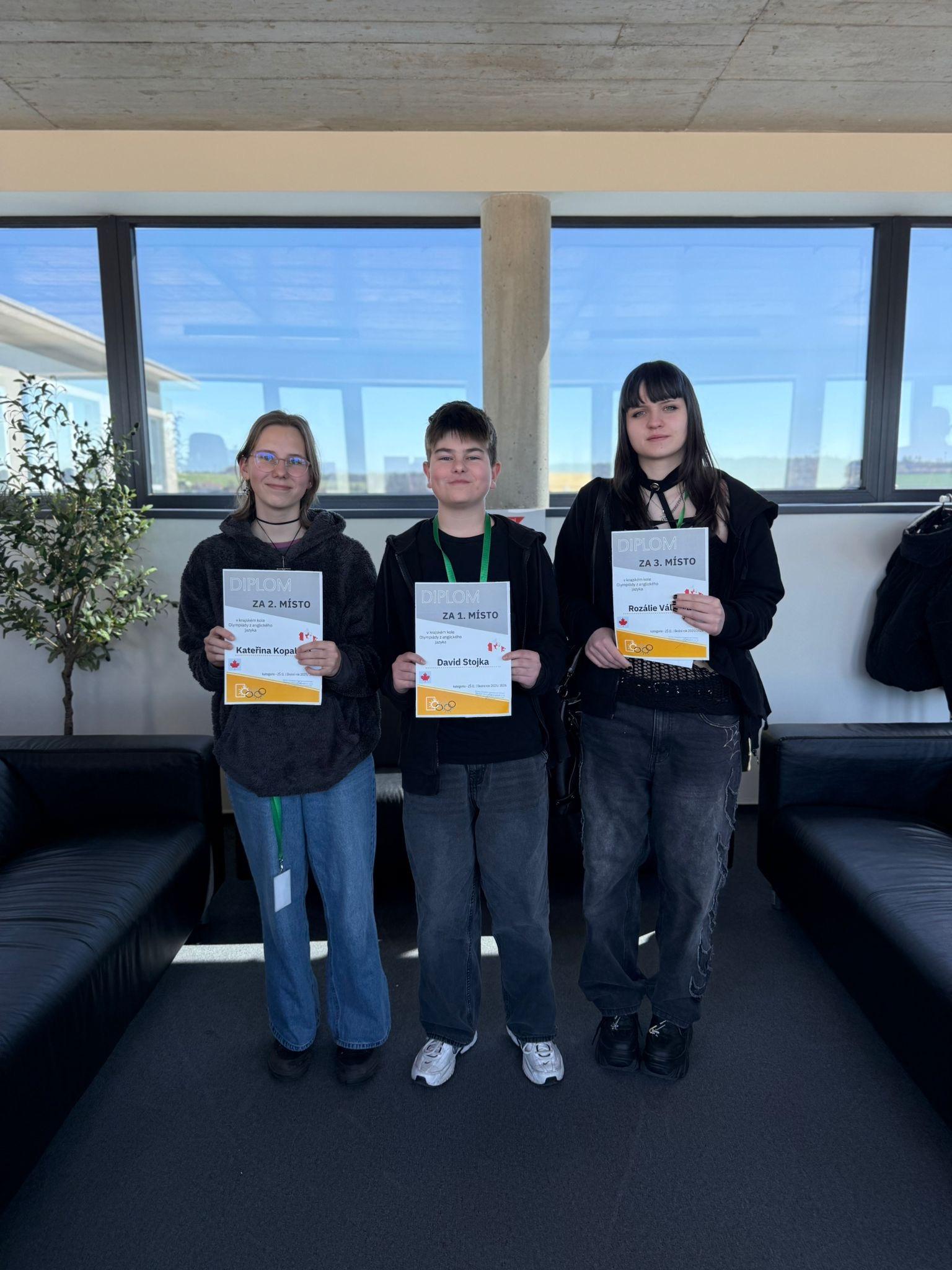 Naše žákyně Katka Kopalová z 9.C dosáhla skvělého úspěchu, když se v krajském kole olympiády v anglickém jazyce v kategorii ZŠ II, konaném 8. dubna 2026 v Sunny Canadian International School v Jesenici, umístila na výborném 2. místě – srdečně gratulujeme a děkujeme za skvělou reprezentaci školy.
