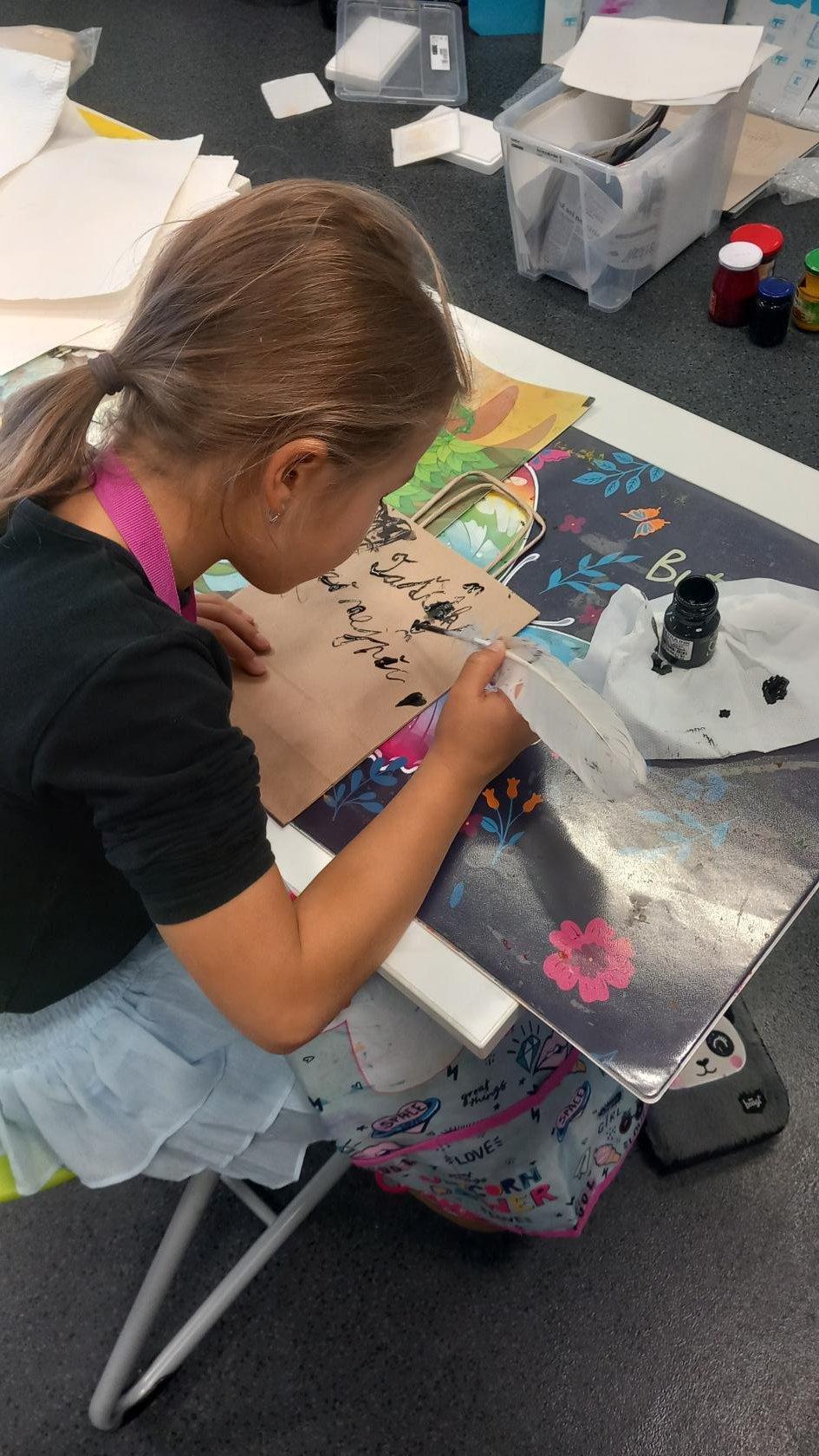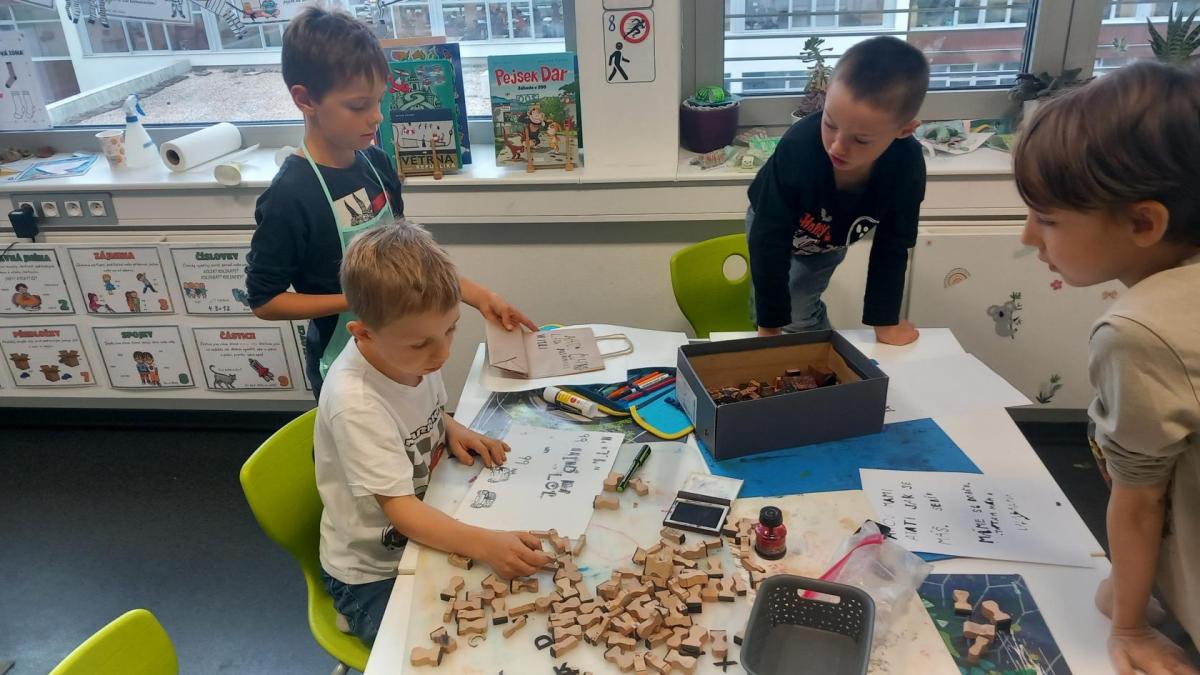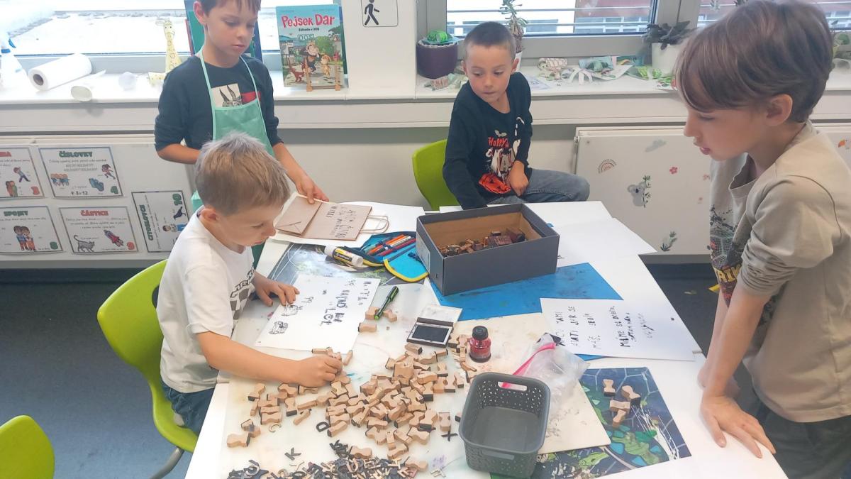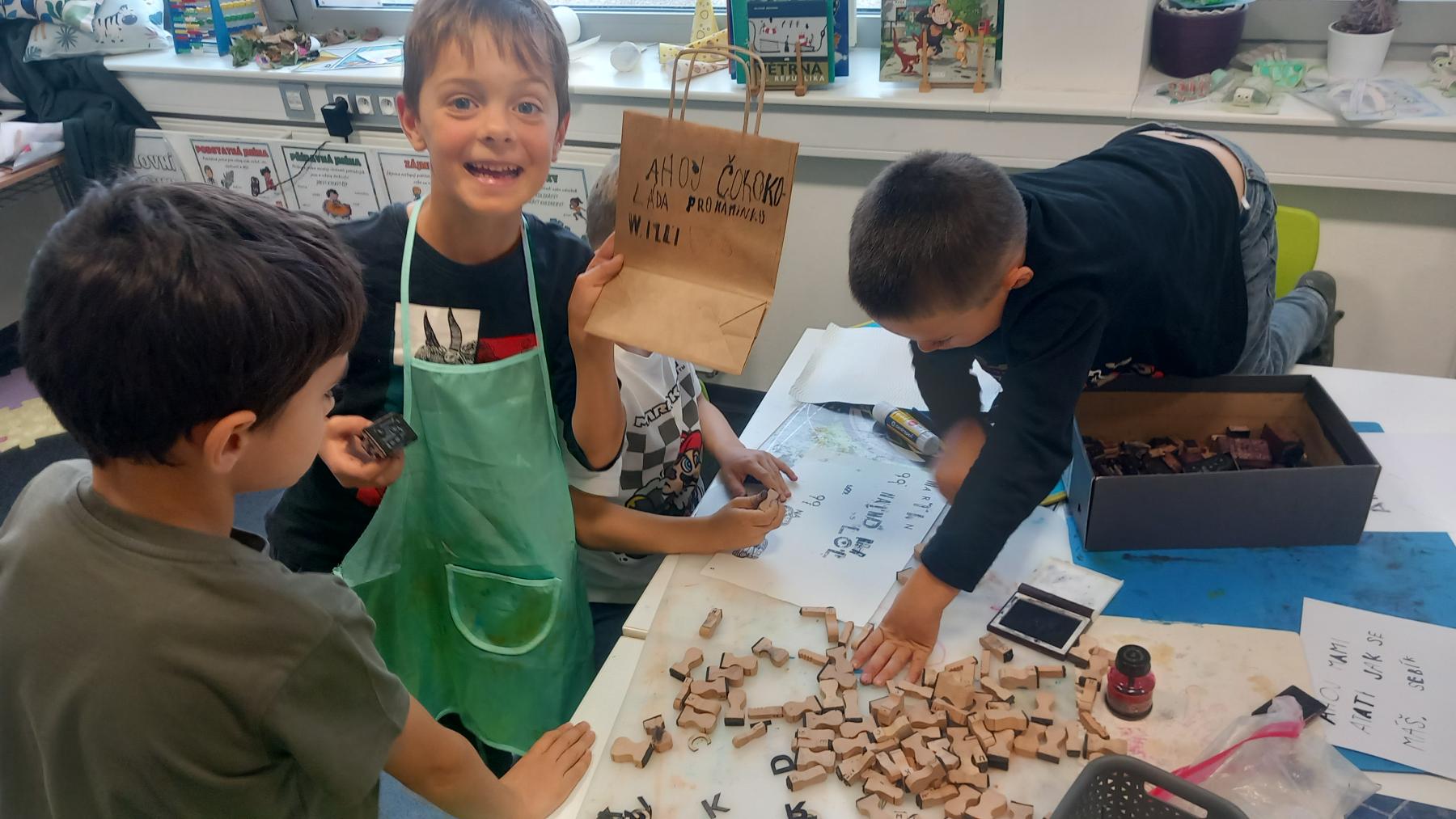 Měsíc jsme na projektové výuce probírali způsoby komunikace a vývoj písma od jeskynních maleb až po současné fungování offsetové tiskárny v závodech s metodou CMYK. Závěrečný workshop projektu měl u dětí velký úspěch. Rozdělili jsme si třídu na několik stanovišť, kde bylo možné si vyzkoušet různé metody písma, psacích nástrojů a tiskařských technik. Jak se psalo písařům na hradě, jak to měl Gutenberg vychytané a co nám přinesla moderní technika? Jaké tiskařské metody máme dnes a jak se asi psalo našim babičkám a dědečkům ve škole? To vše jsme si vyzkoušeli a vytvořili si malé dárečky. Jen ten úklid :D