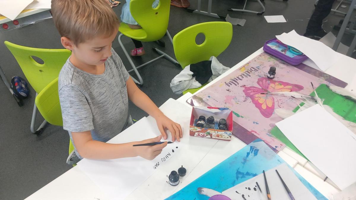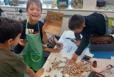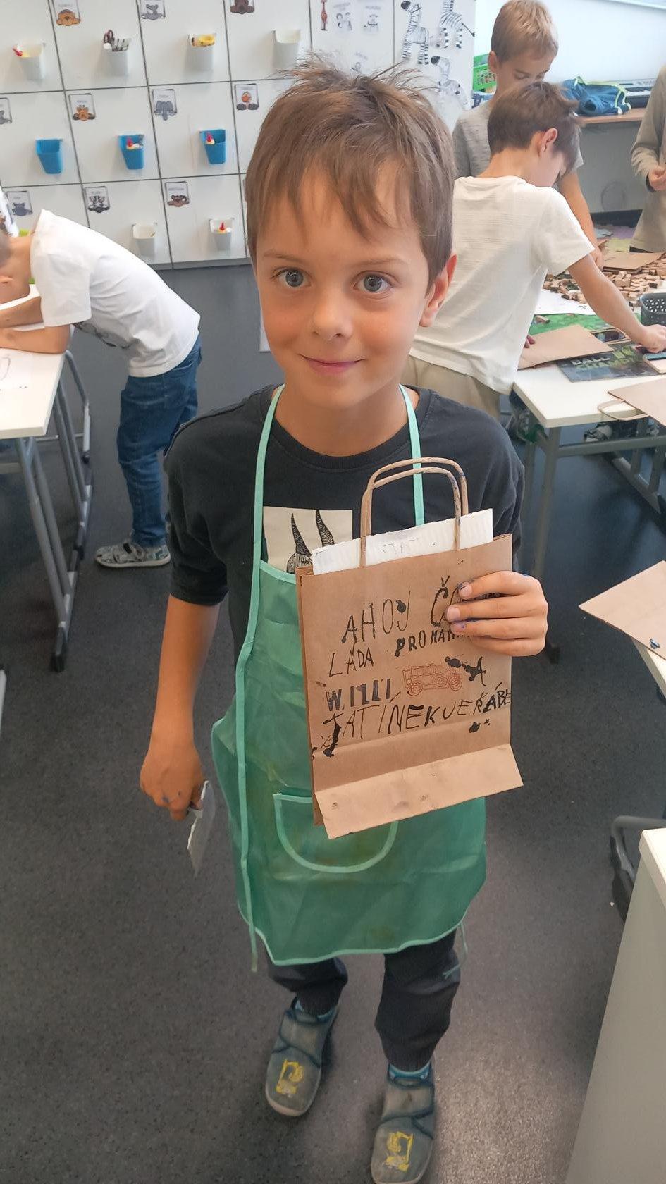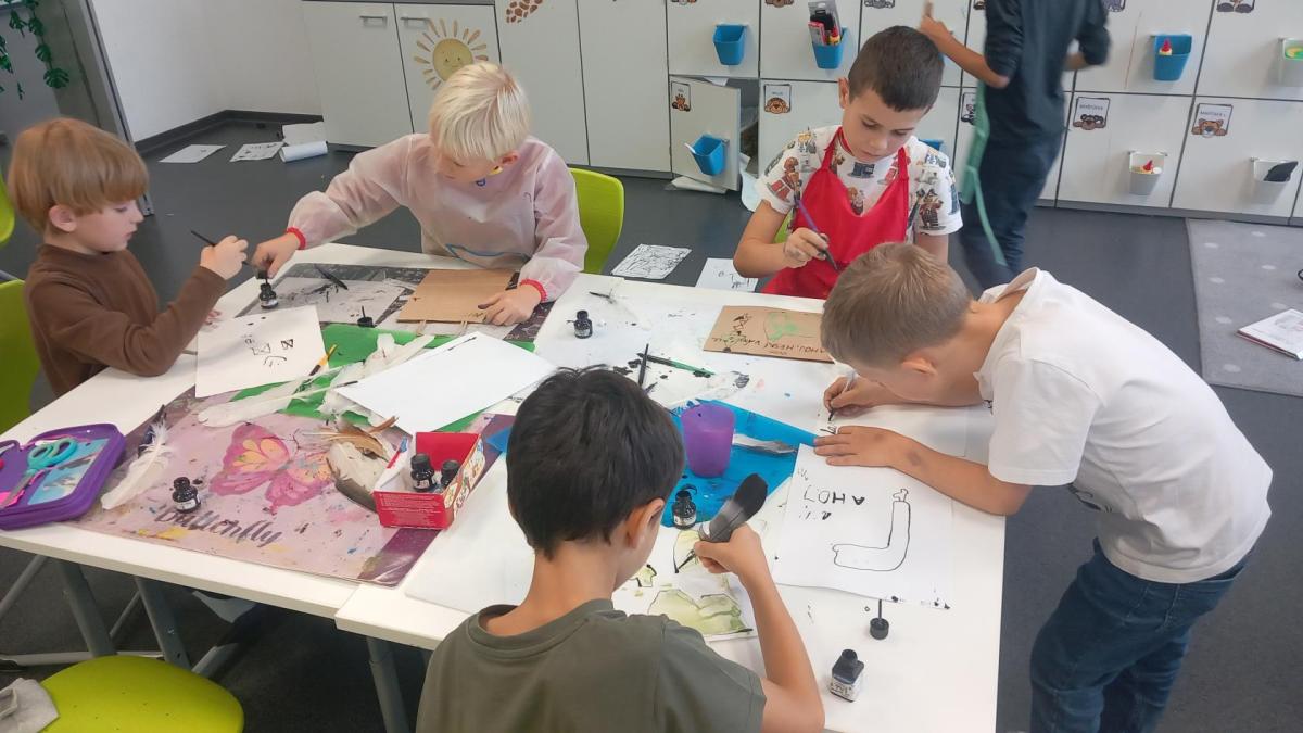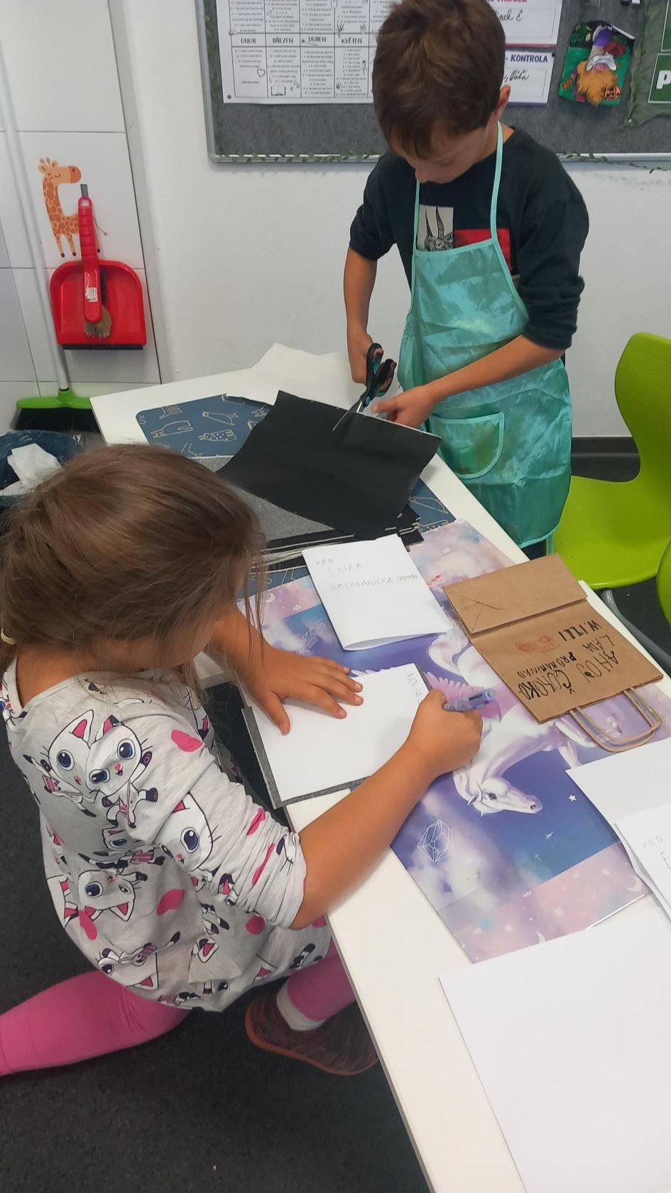 Měsíc jsme na projektové výuce probírali způsoby komunikace a vývoj písma od jeskynních maleb až po současné fungování offsetové tiskárny v závodech s metodou CMYK. Závěrečný workshop projektu měl u dětí velký úspěch. Rozdělili jsme si třídu na několik stanovišť, kde bylo možné si vyzkoušet různé metody písma, psacích nástrojů a tiskařských technik. Jak se psalo písařům na hradě, jak to měl Gutenberg vychytané a co nám přinesla moderní technika? Jaké tiskařské metody máme dnes a jak se asi psalo našim babičkám a dědečkům ve škole? To vše jsme si vyzkoušeli a vytvořili si malé dárečky. Jen ten úklid :D