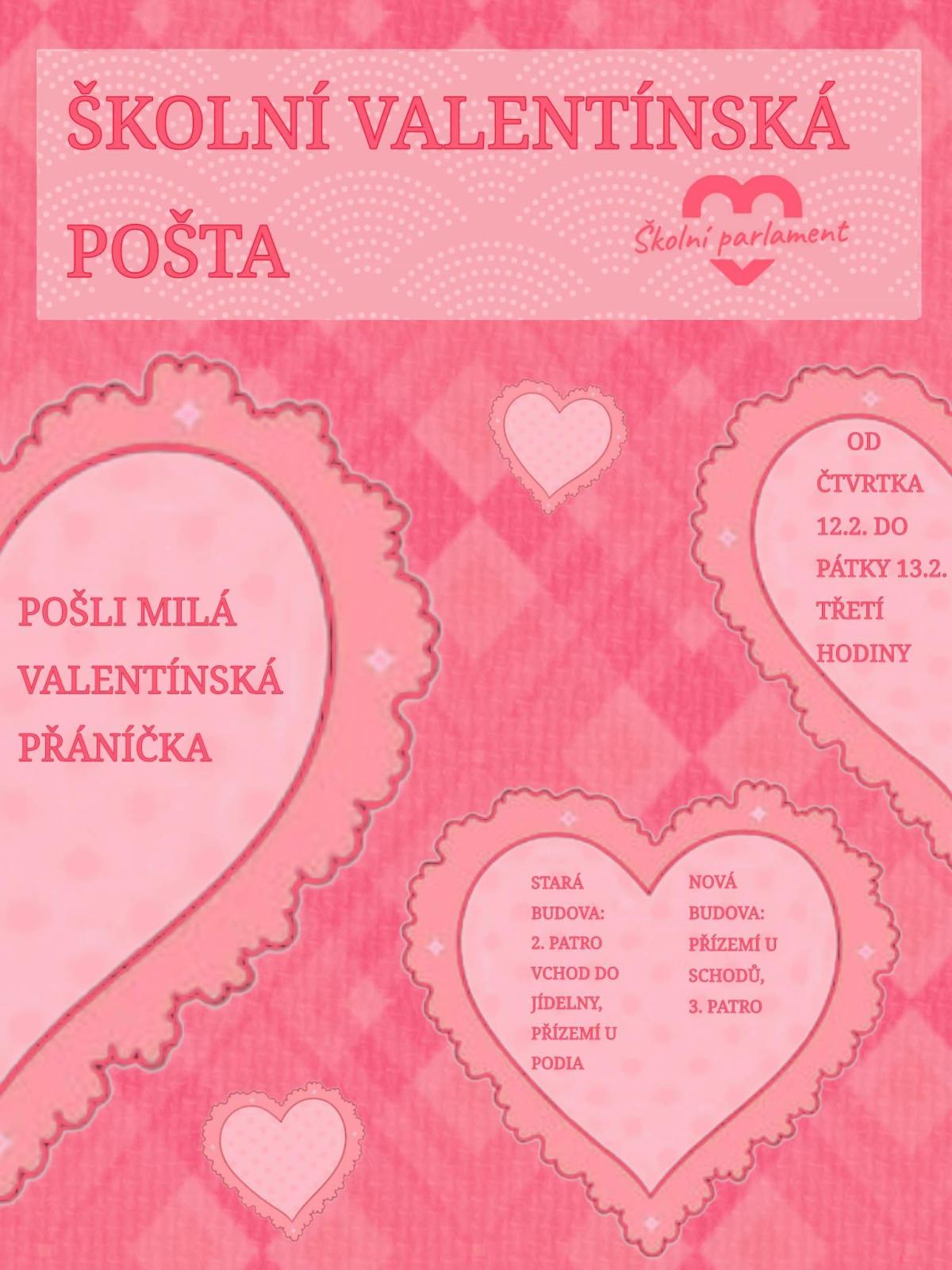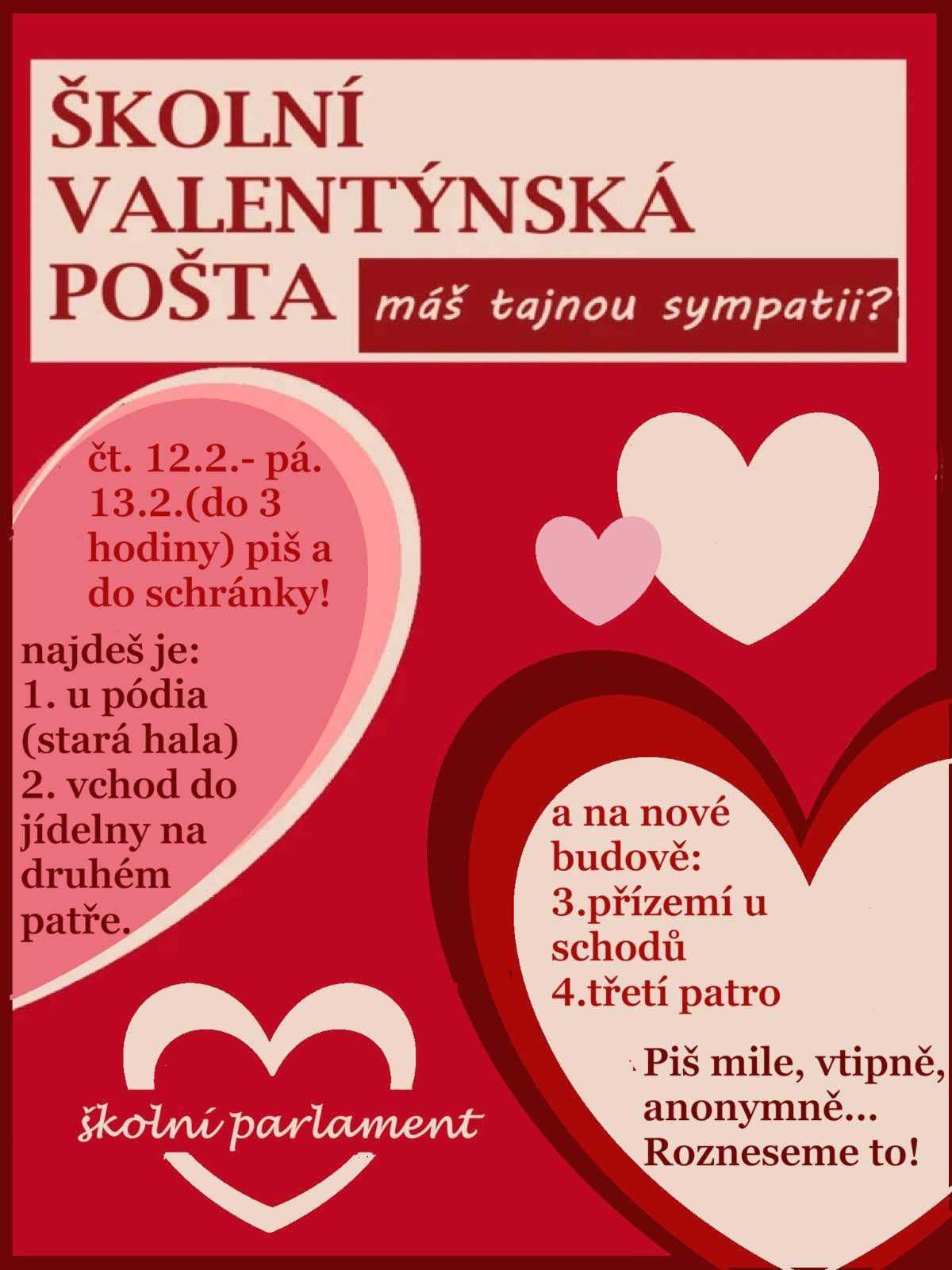 O víkendu nás čeká jeden zamilovaný svátek a školní parlament k této příležitosti připravil pro žáky valentýnské boxy, kam mohli umístit své zprávy. Všechna psaní pak parlamenťáci roztřídili a předali právoplatným majitelům. Zpráv se sešlo obrovské množství a my jsme rádi, že jsme mohli potěšit spolužáky v obaváný pátek 13.