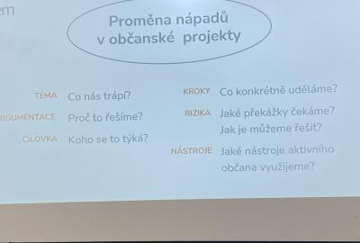 Workshop byl rozdělen na dva bloky. V první části žáci přemýšleli, kdo je to aktivní občan, seznámili se s inspirativními příklady svých vrstevníků. Dále fotografovali ve škole místa, které podle nich fungují, ale zaměřili se i na věci, které by zasloužily zlepšení. Vznikl tak pestrý soubor nejen podnětných nápadů, ale i problémů, které se snažili žáci pojmenovat.