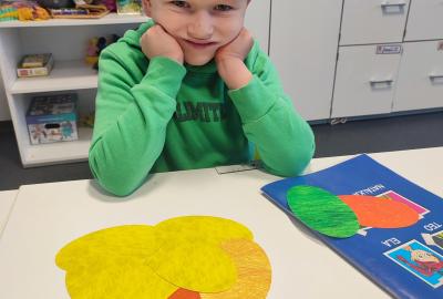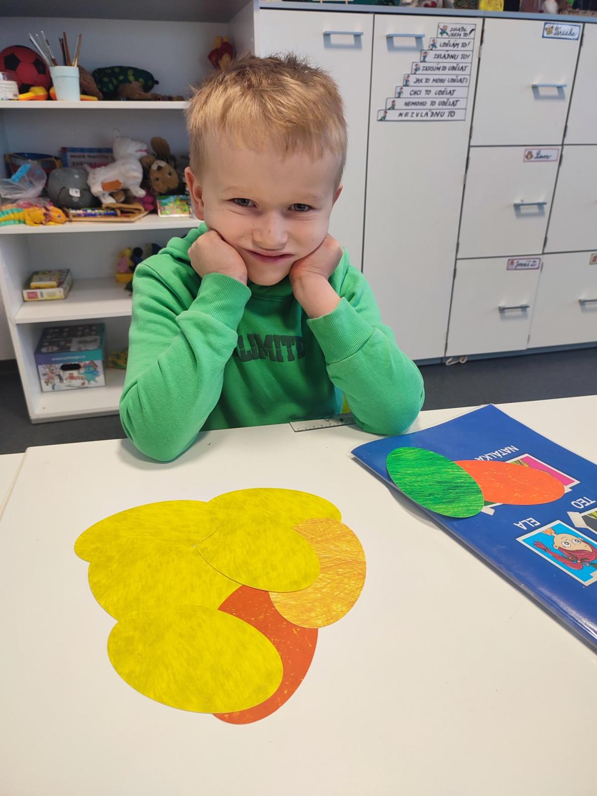 V matematice jsme skládali příklady na sčítání a odčítání s barevnými papírovými vajíčky a nakonec jsme z nich vytvořili veselé obrázky.