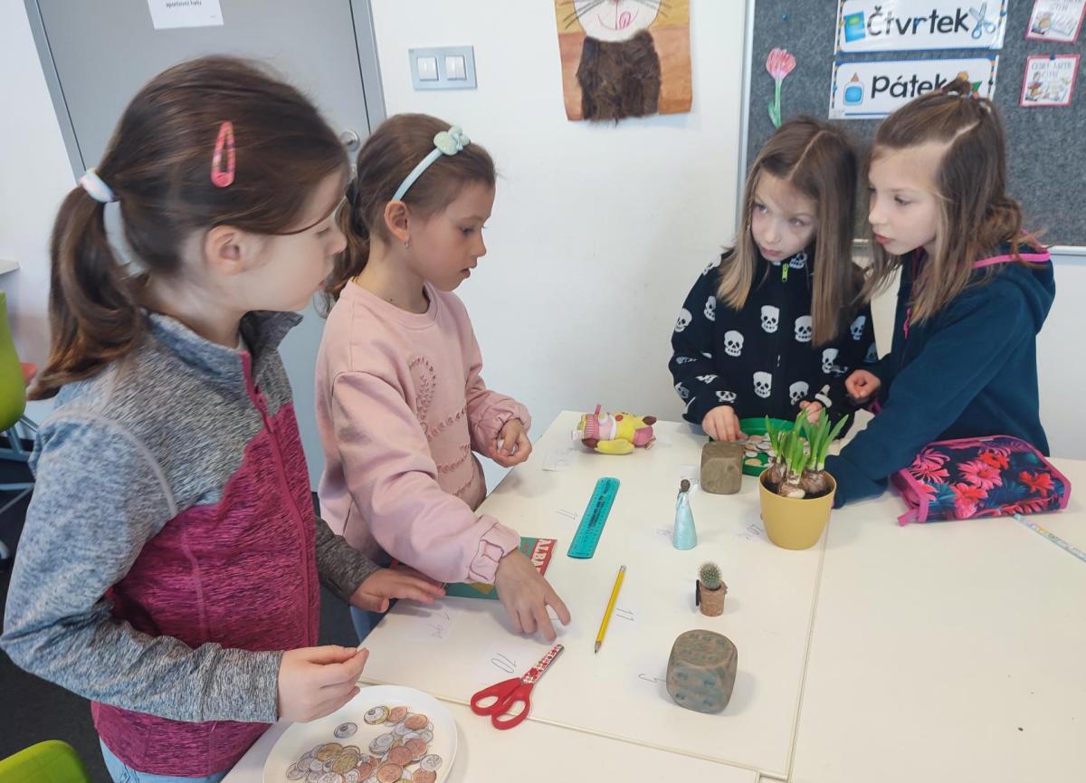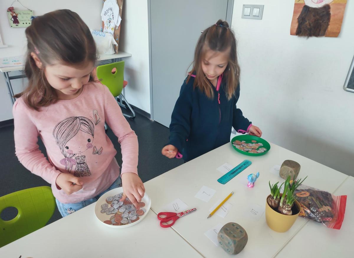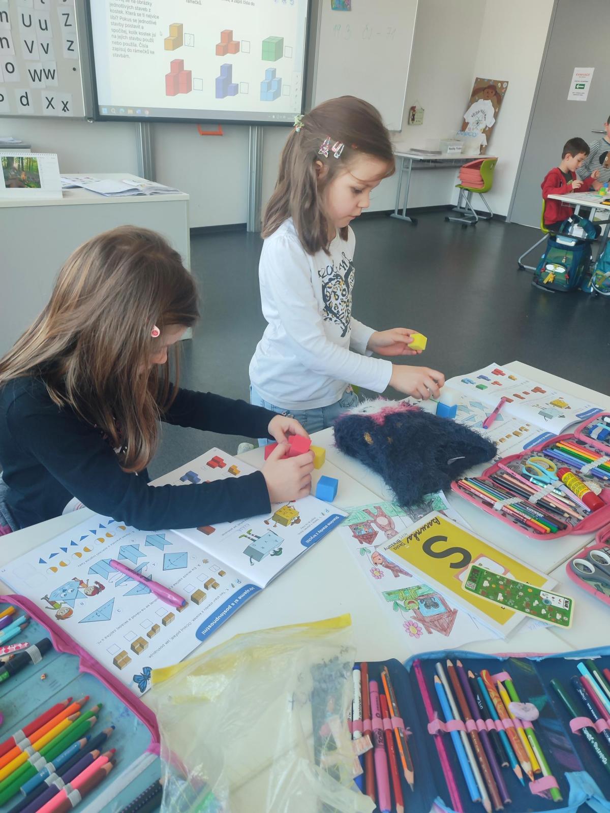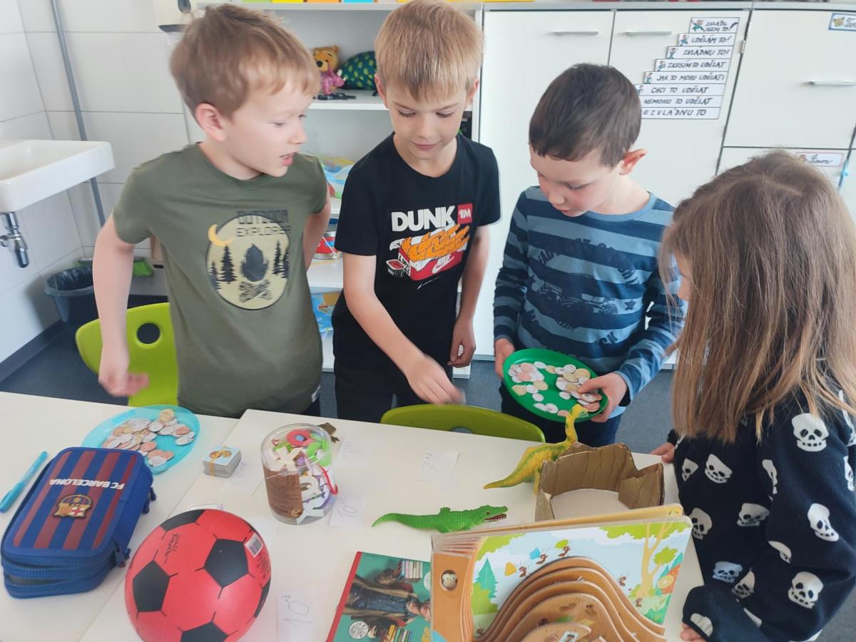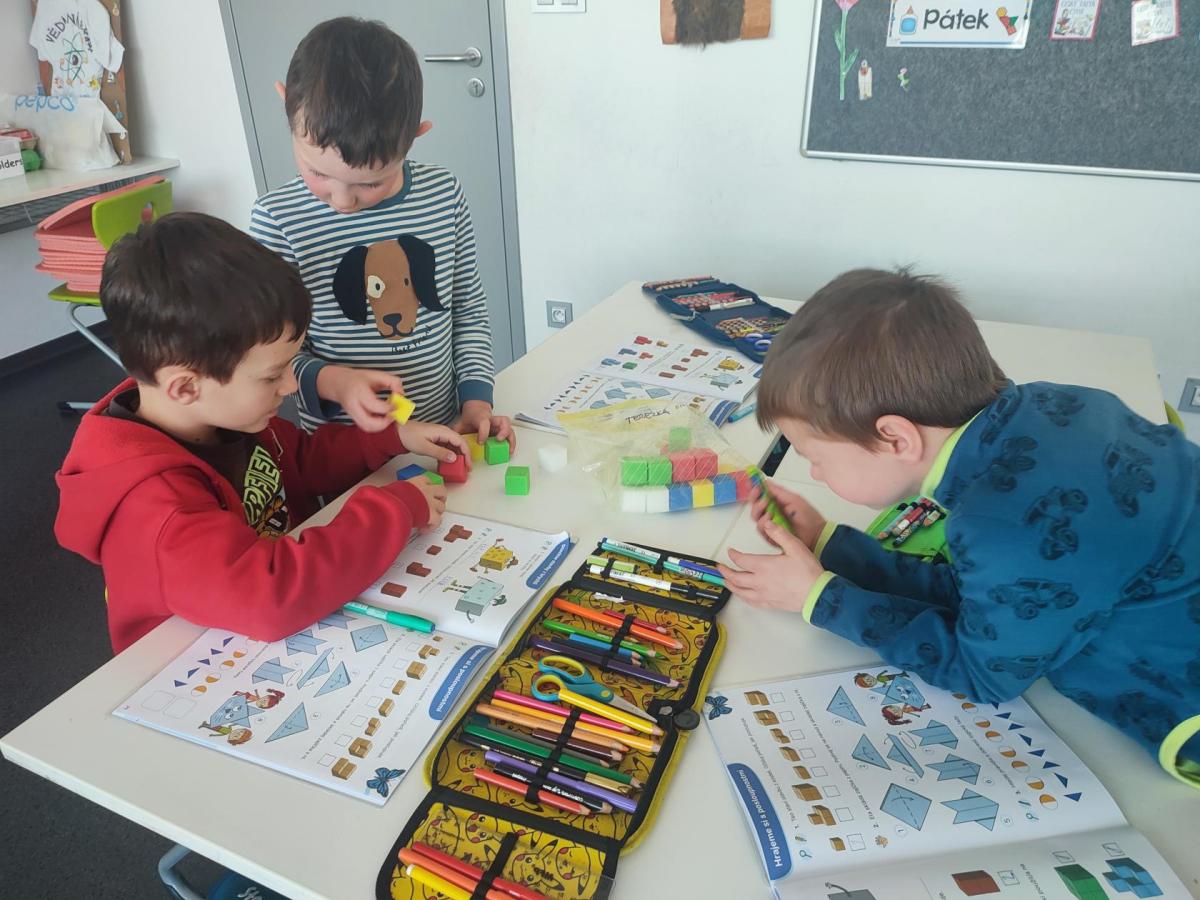 V hodinách matematiky nás čeká spousta zábavy a objevování. Hrajeme si na obchod, kde počítáme peníze a zkoušíme si, jaké je to být prodavačem nebo zákazníkem. Stavíme různé stavby z krychliček, které nám pomáhají lépe si představit tvary a prostor.