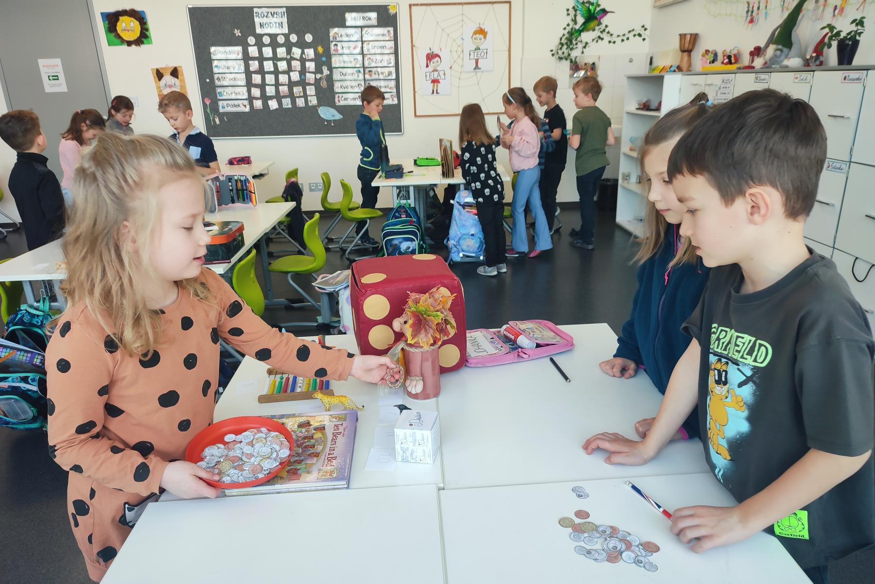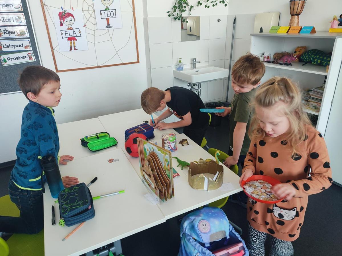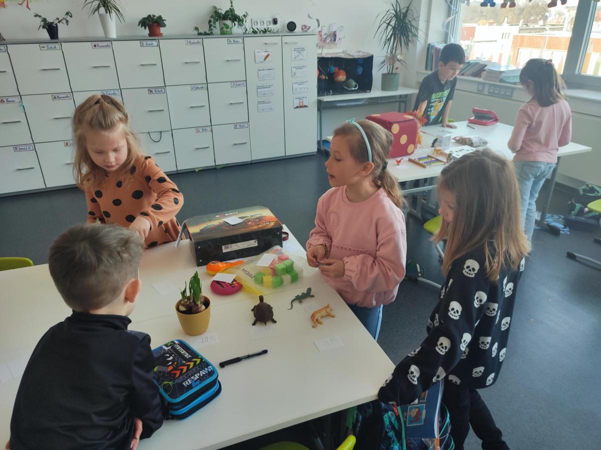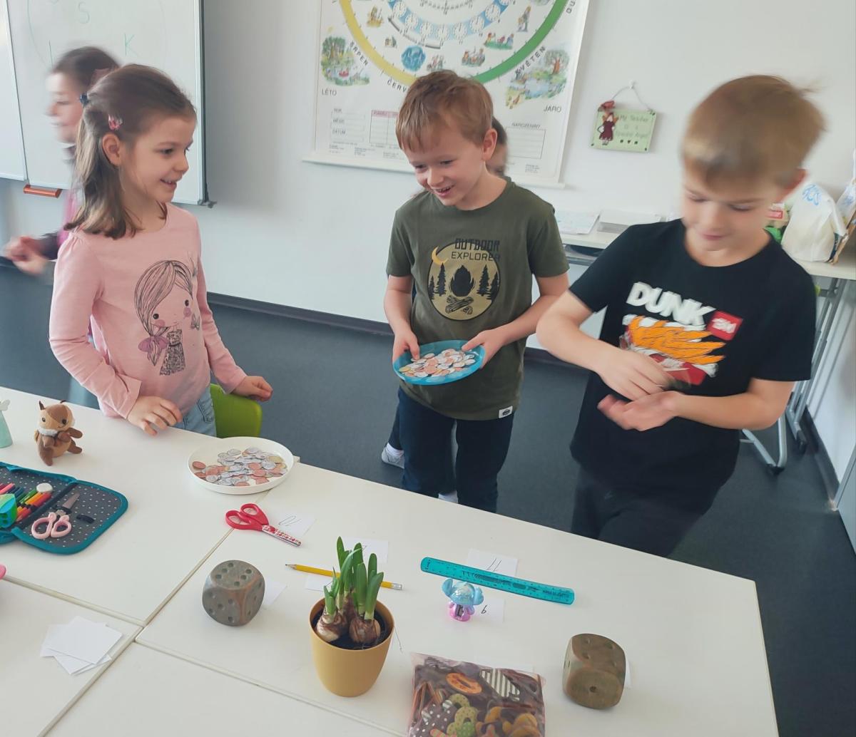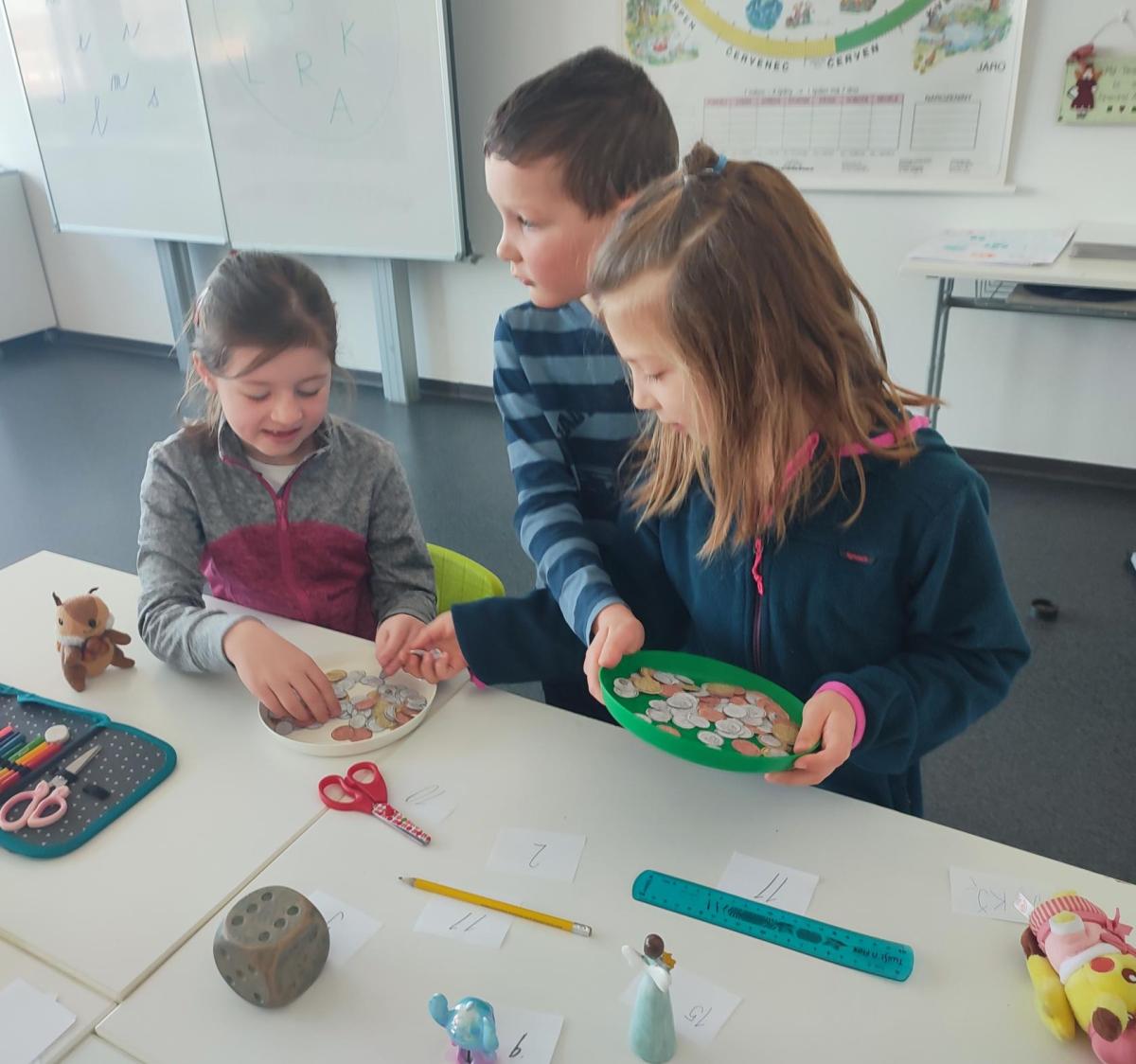 V hodinách matematiky nás čeká spousta zábavy a objevování. Hrajeme si na obchod, kde počítáme peníze a zkoušíme si, jaké je to být prodavačem nebo zákazníkem. Stavíme různé stavby z krychliček, které nám pomáhají lépe si představit tvary a prostor.
