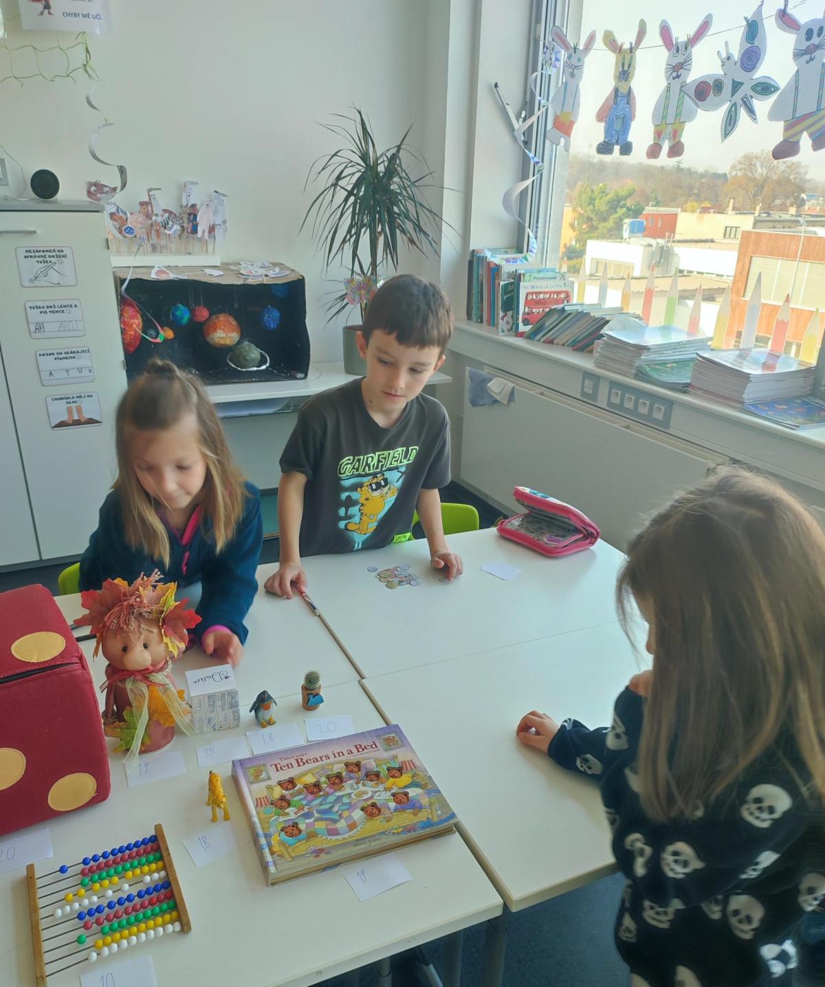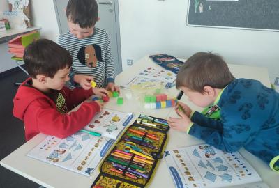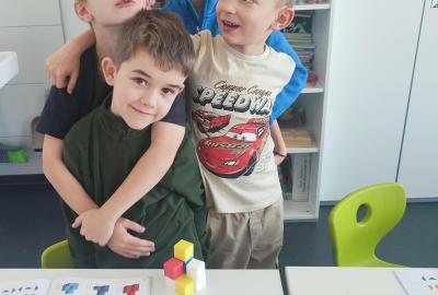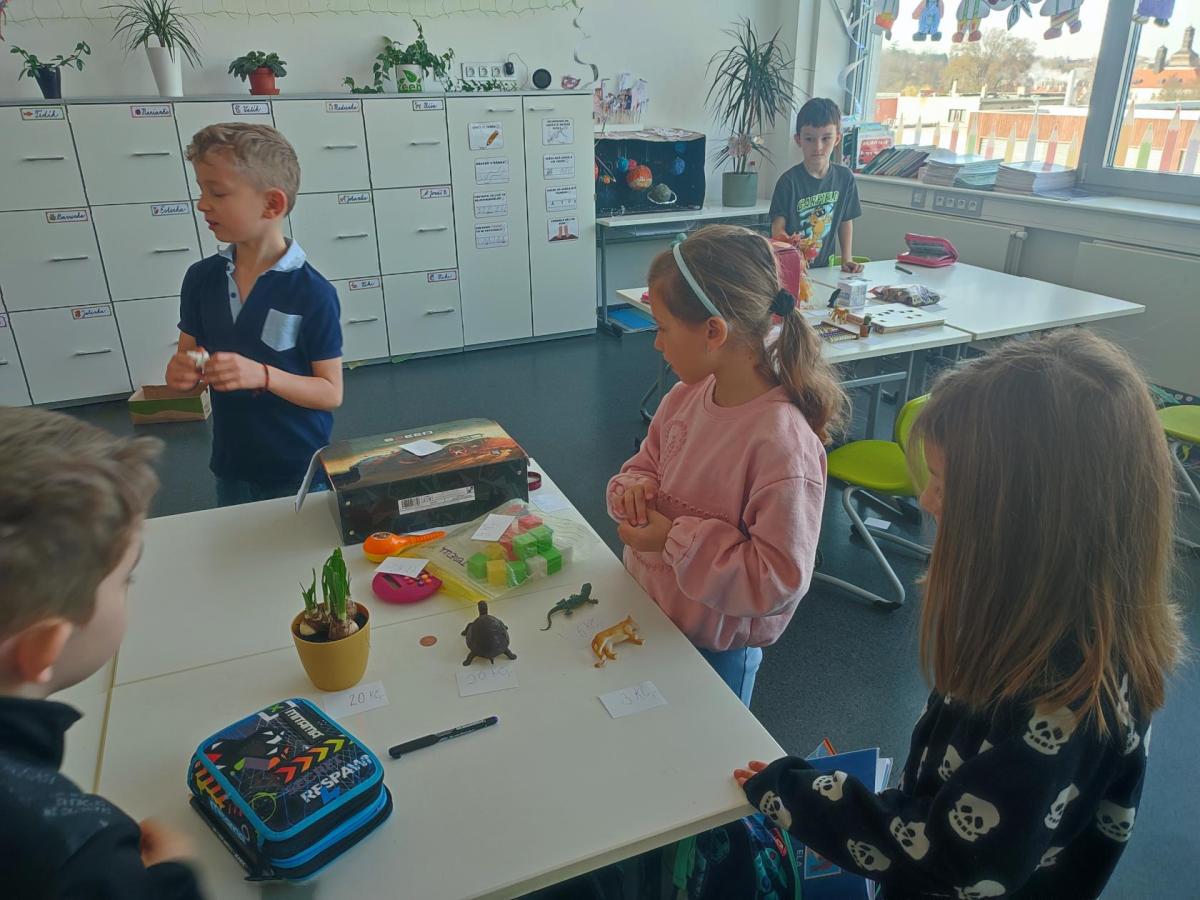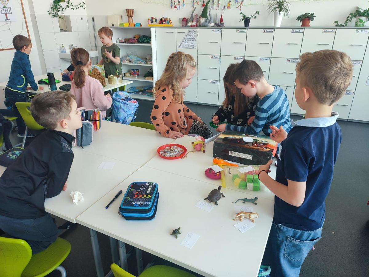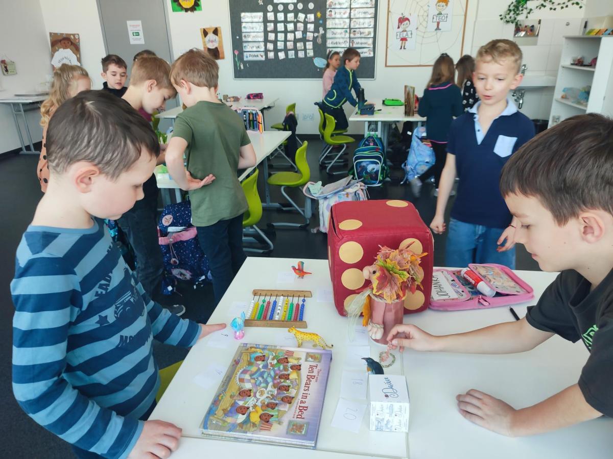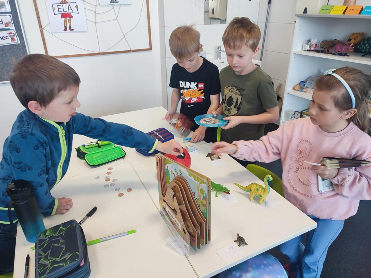 V hodinách matematiky nás čeká spousta zábavy a objevování. Hrajeme si na obchod, kde počítáme peníze a zkoušíme si, jaké je to být prodavačem nebo zákazníkem. Stavíme různé stavby z krychliček, které nám pomáhají lépe si představit tvary a prostor.