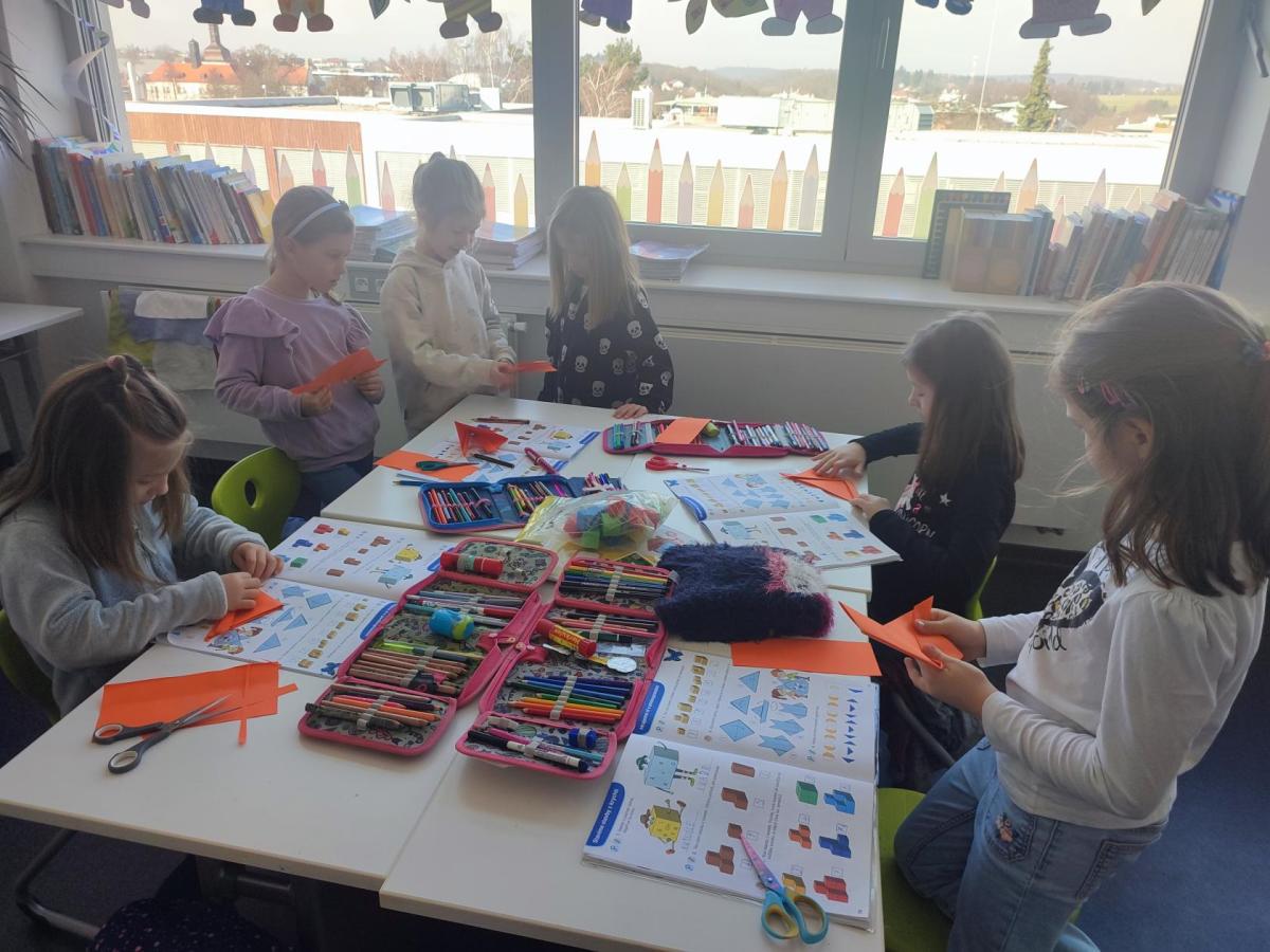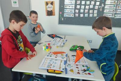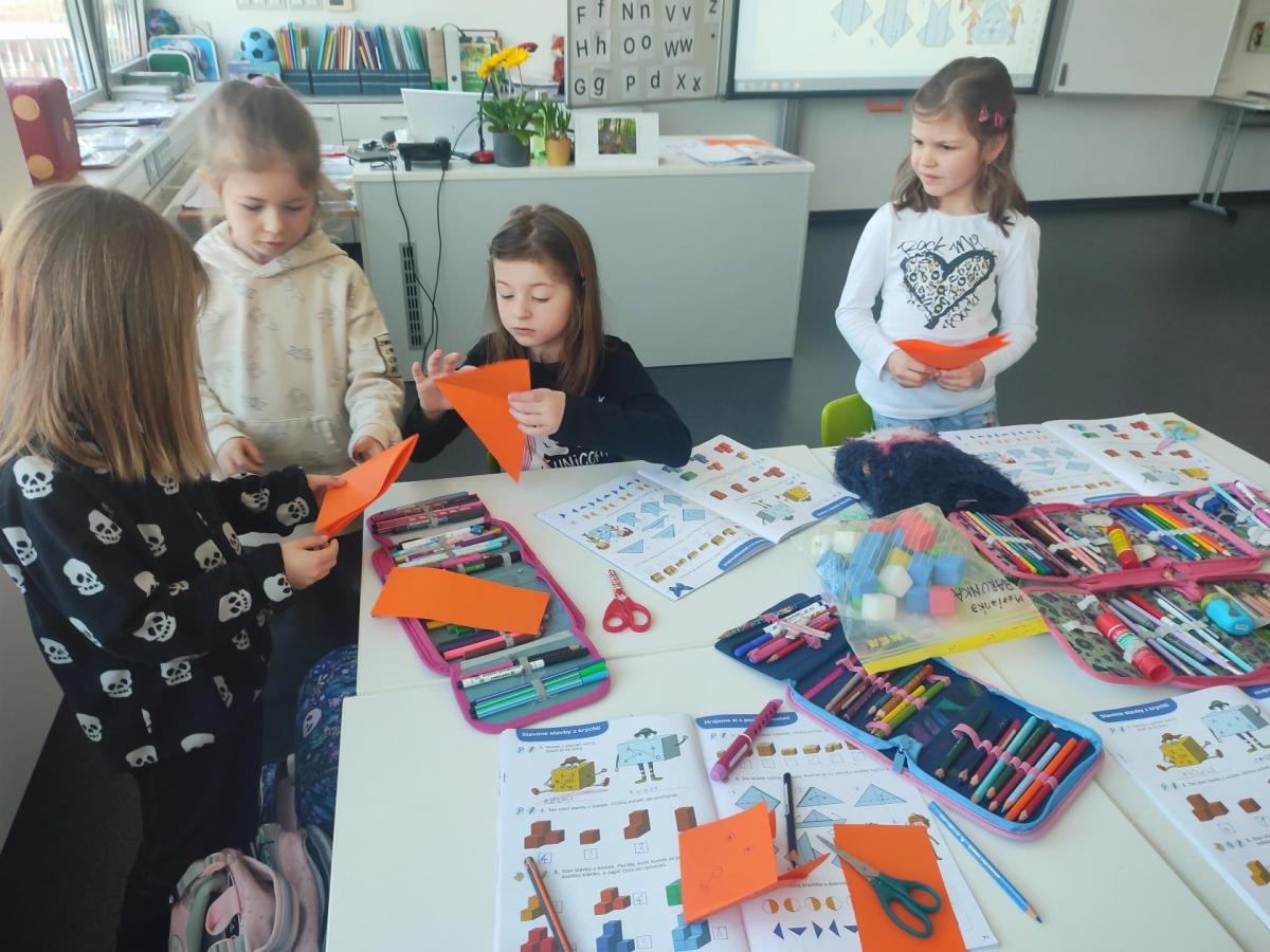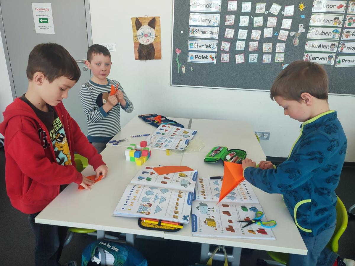 Také skládáme s papíru podle návodu, což trénuje naši pozornost a představivost. A samozřejmě řešíme zajímavé úkoly, u kterých můžeme přemýšlet, spolupracovat a hledat nová řešení.