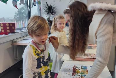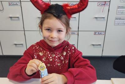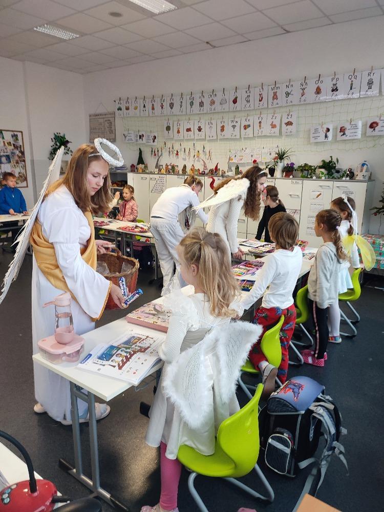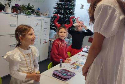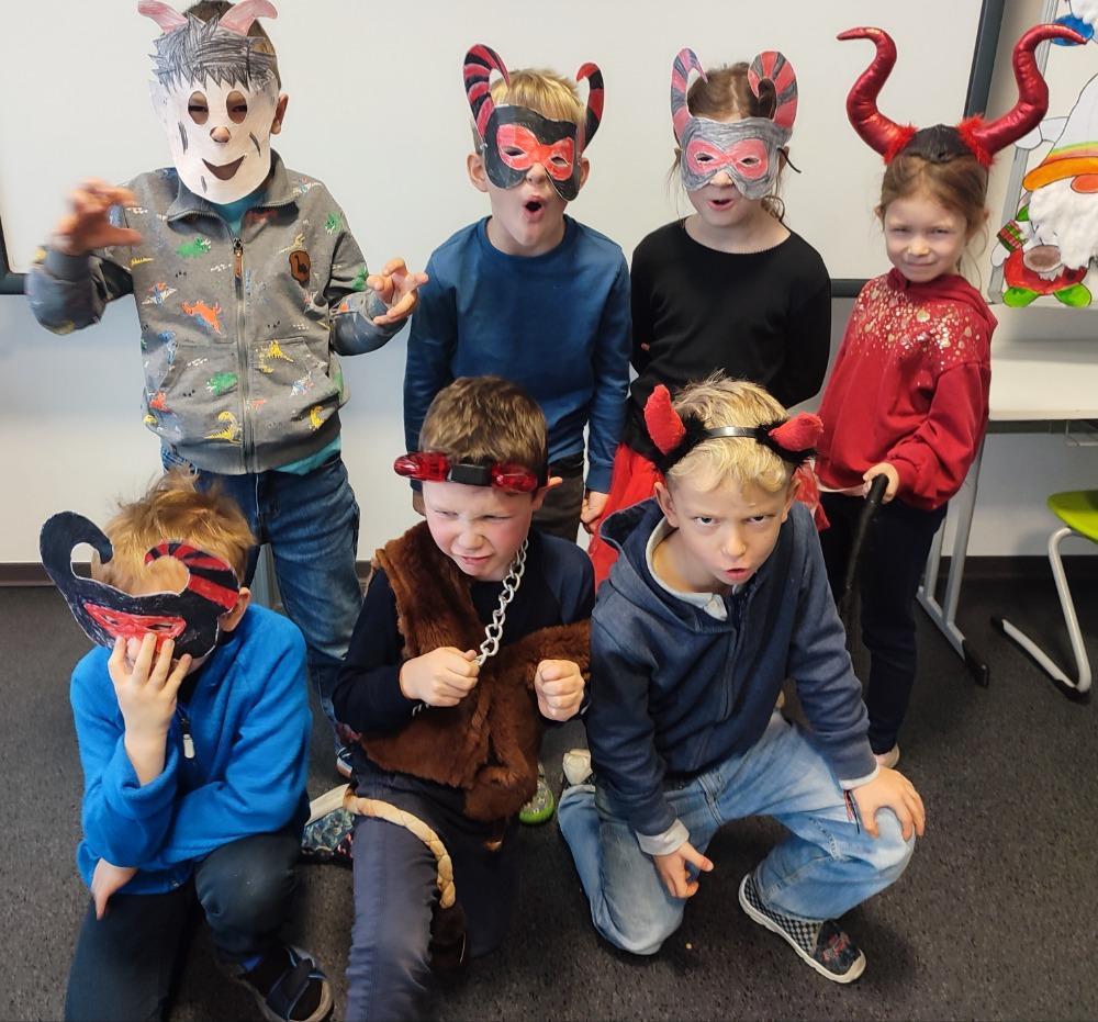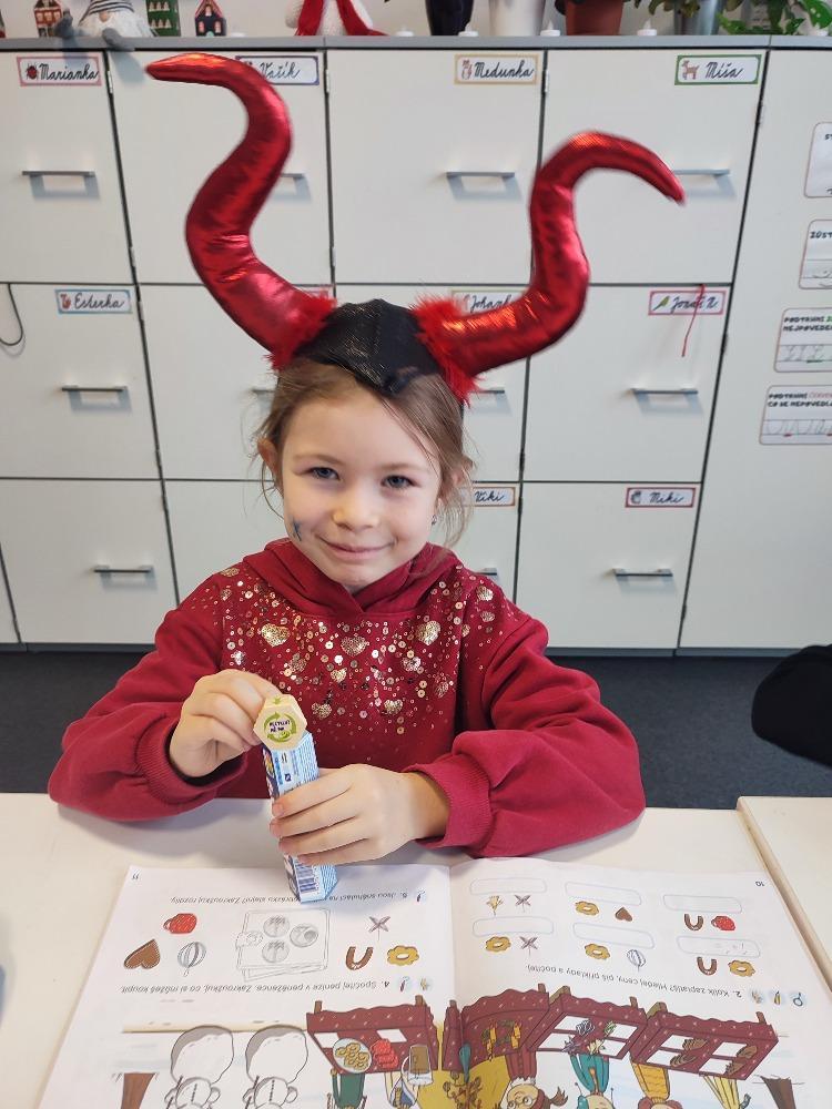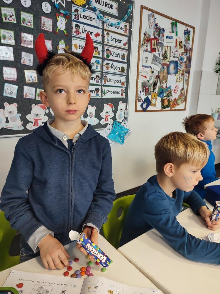 V pátek už od rána jsme byli celí napjatí, protože jsme věděli, že se k nám chystá Mikulášská družina. Přestože jsou v naší třídě samé hodné děti, dušička některých z nás se chvěla strachem. Nakonec to ale dobře dopadlo - čerti do třídy jen nakoukli, ale Mikuláš a andělé je poslali pryč, že tady nejsou potřeba. Zazpívali jsme krásnou koledu Sláva jsou tu Vánoce a dostali sladké lentilky, které jsme využili v zrovna probíhající hodině matematiky. Také v pohádkovém čtení i angličtině byly námětem našeho povídání Vánoce. Slibujeme, že budeme i nadále hodní, aby ani příští rok nebylo čertů v naší třídě třeba.