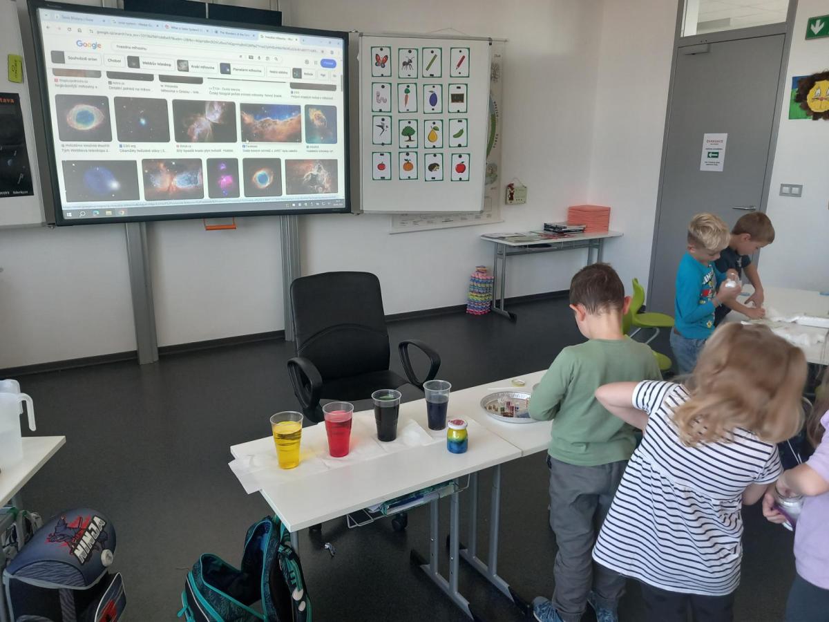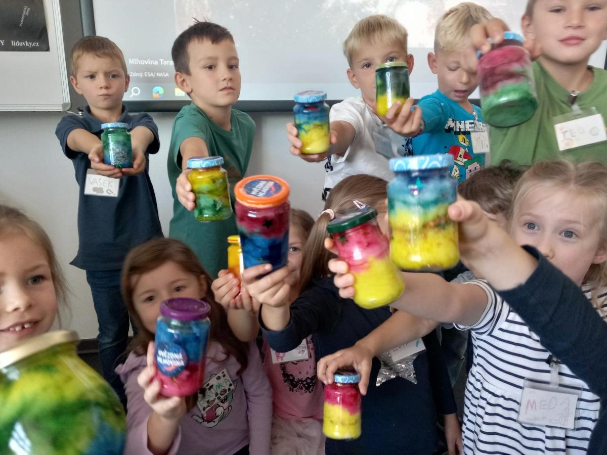 A rovnou jsme vypluli vstříc vědecké práci, vědeckým pravidlům a prozkoumali jsme ne/obyčejný život vědců. Když už jsme se naladili na to, co nás bude pět let provázet, vytvořili jsme si Badatelník, věděcké konferenční vizitky, týmová pracovní pravidla a vrhli jsme se na první projekt o VESMÍRU. Nejvíc wow pokus je vždy vytváření hvězdné mlhoviny. To bylo radosti! :)
