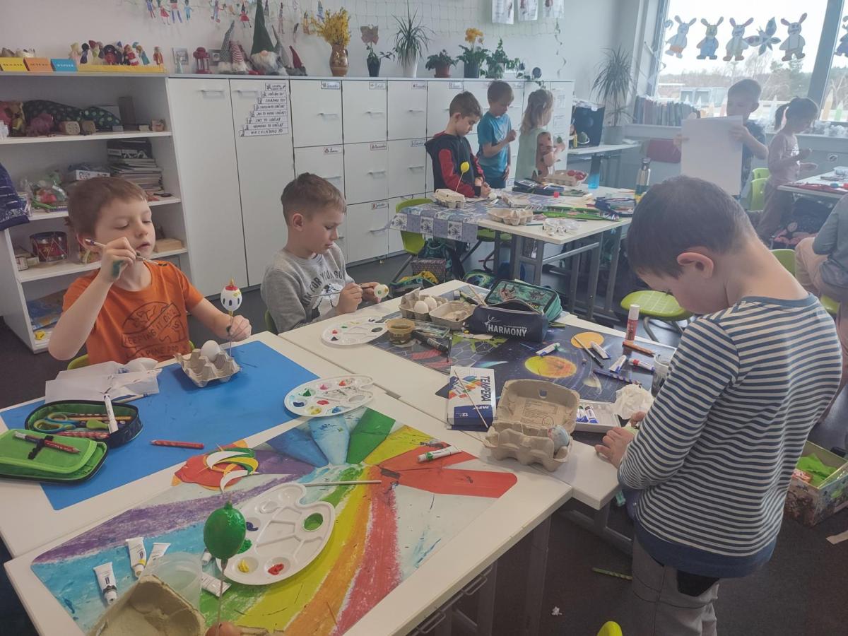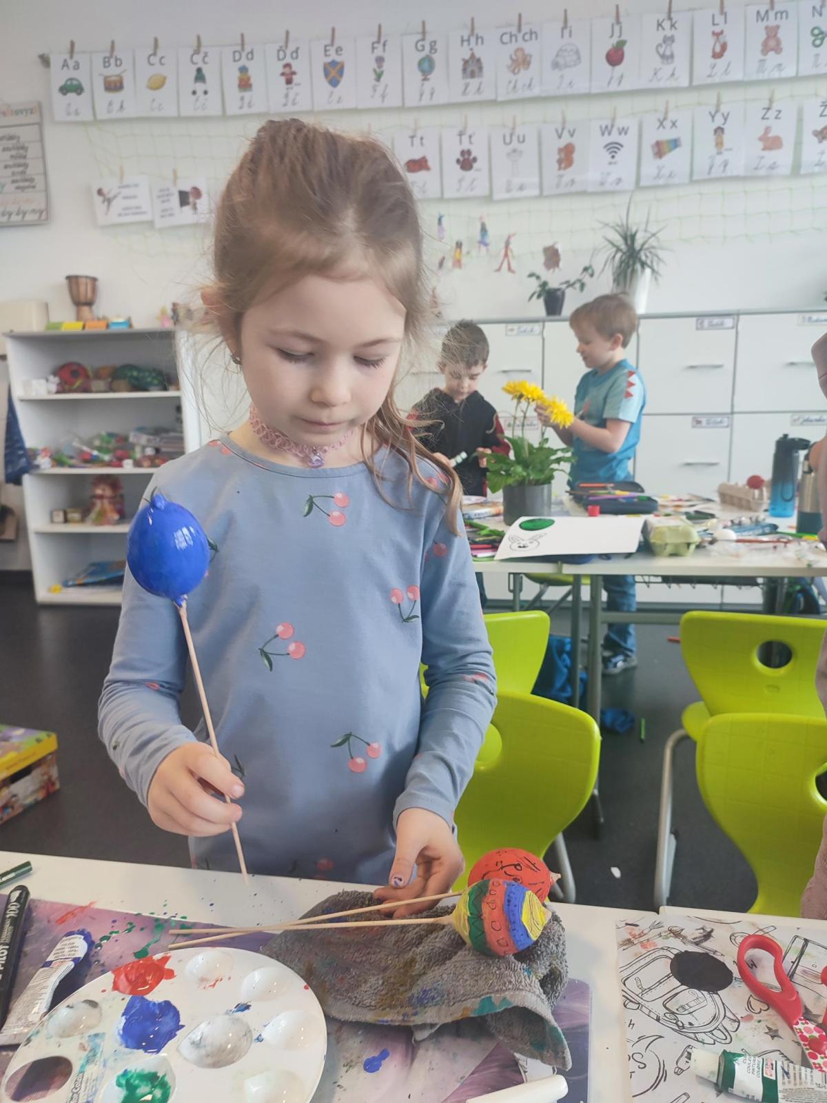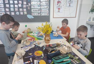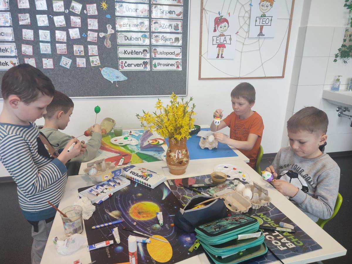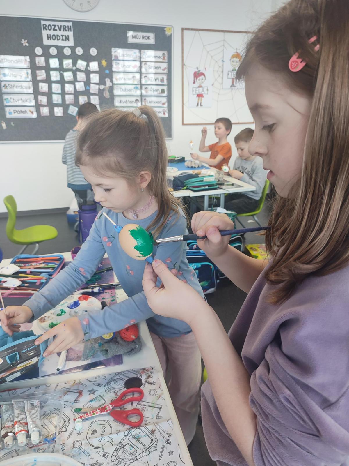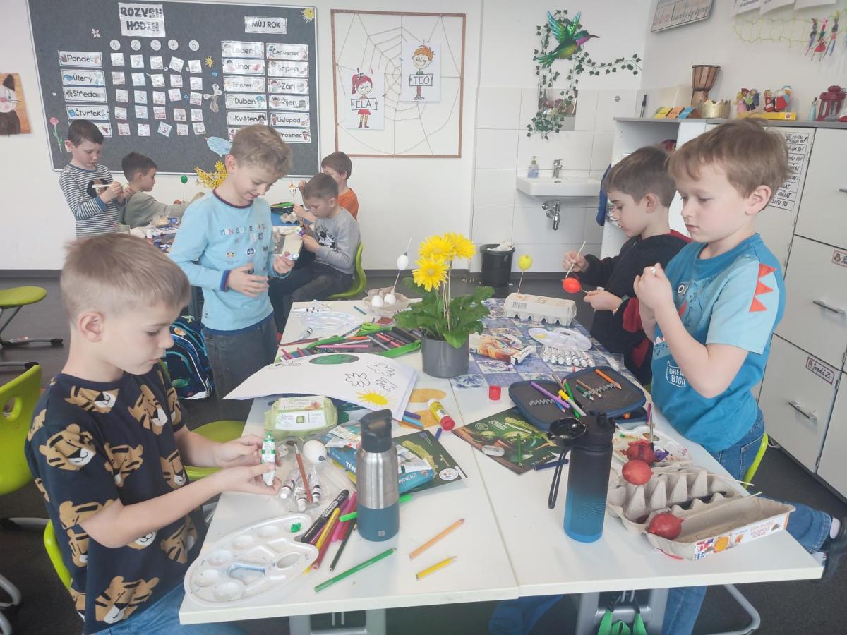 V předvelikonočním čase si naši prvňáčci užili tvoření plné barev, fantazie a radosti. Společně jsme se pustili do zdobení vajíček, které se dětem moc povedlo, a každé z nich bylo originální. Součásti tvoření bylo také zakládání papírové velikonoční zahrádky. Tentokrát děti dostávaly instrukce v anglickém jazyce od Goldie, takže se musely hodně soustředit a uplatnit své znalosti angličtiny prakticky. Goldie dětem přinesla spoustu drobných ozdůbek, kterými jsme krásně doplnili malovaná vajíčka na svých zahrádkách.