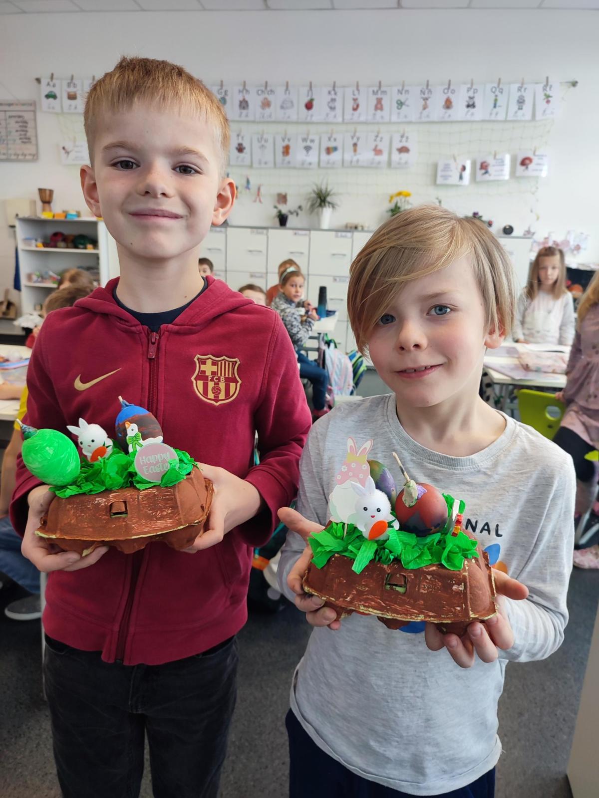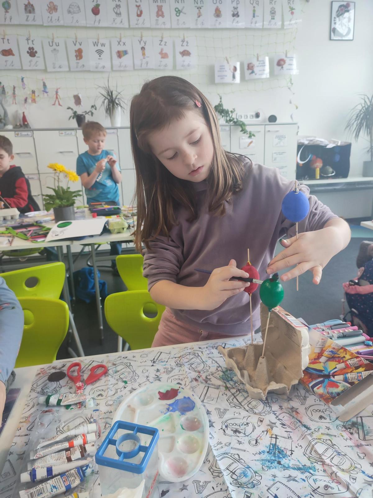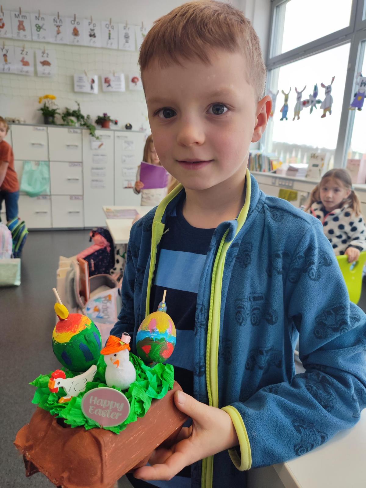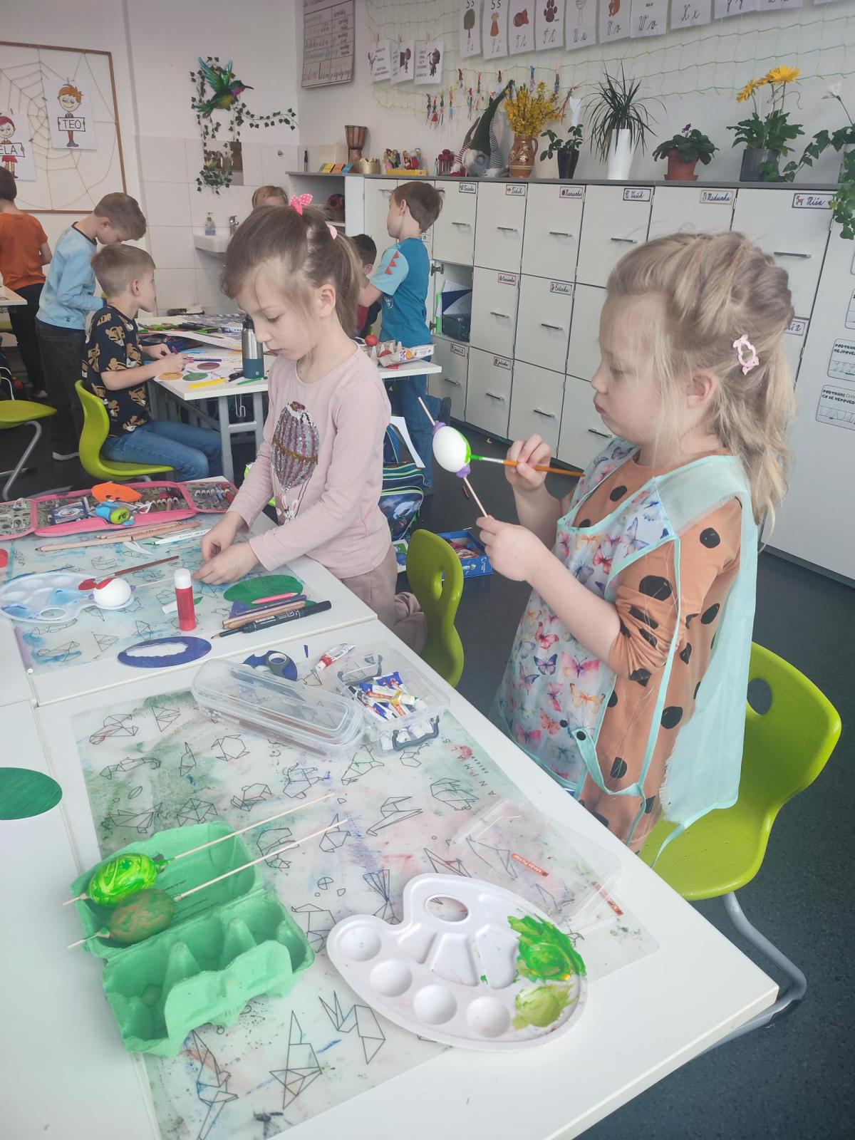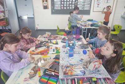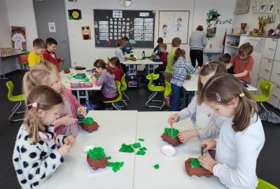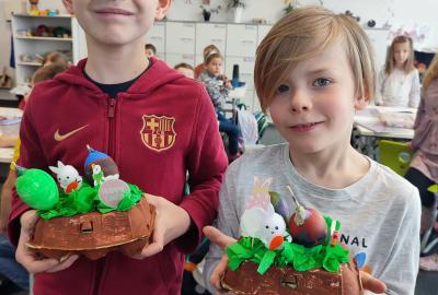 V předvelikonočním čase si naši prvňáčci užili tvoření plné barev, fantazie a radosti. Společně jsme se pustili do zdobení vajíček, které se dětem moc povedlo, a každé z nich bylo originální. Součásti tvoření bylo také zakládání papírové velikonoční zahrádky. Tentokrát děti dostávaly instrukce v anglickém jazyce od Goldie, takže se musely hodně soustředit a uplatnit své znalosti angličtiny prakticky. Goldie dětem přinesla spoustu drobných ozdůbek, kterými jsme krásně doplnili malovaná vajíčka na svých zahrádkách.
