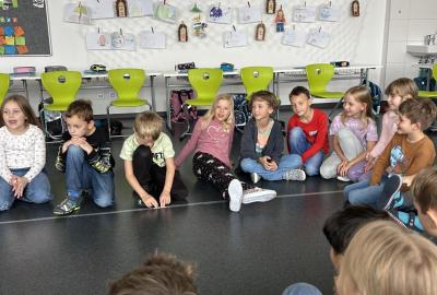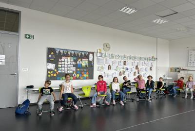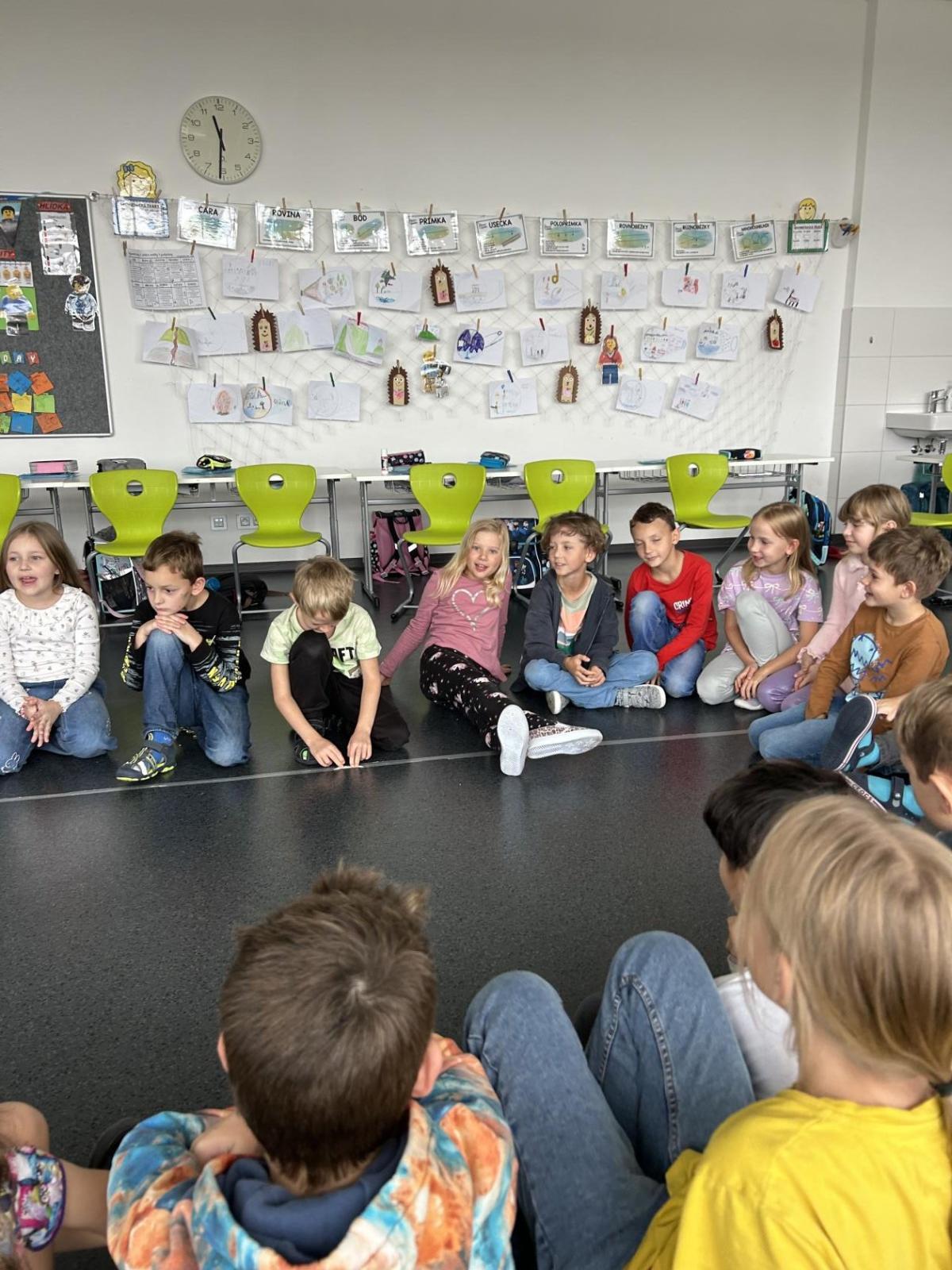 Pro tuto hodinu jsme si lavice uspořádali do tvaru písmene U, takže jsme měli uprostřed dostatek místa na hry a společnou práci.