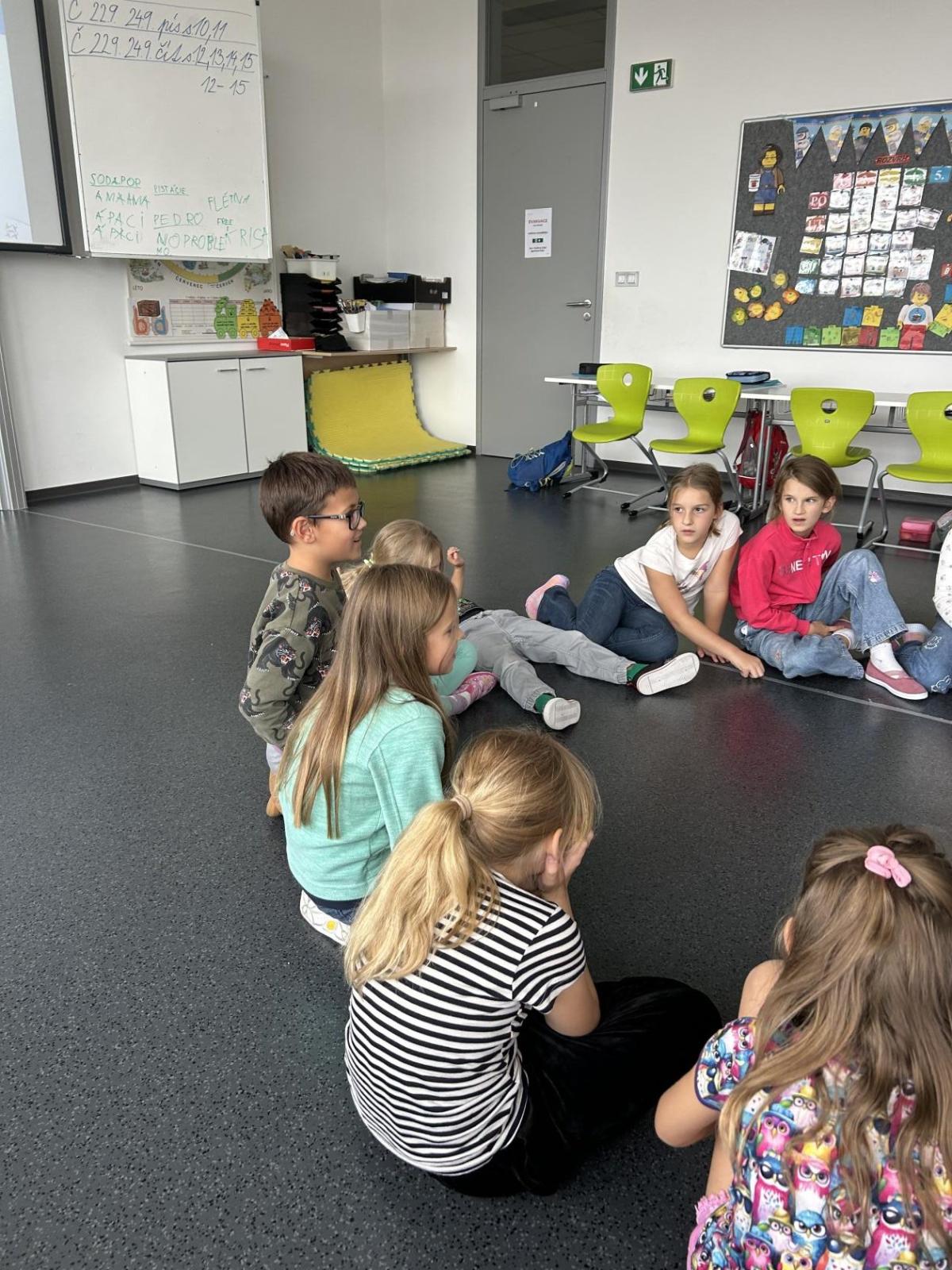 Postupně jsme se dostali k různým pocitům, jež máme ve škole. Začali jsme si povídat o tom, jak vypadá pozitivní atmosféra ve třídě a proč je důležité, aby se každý cítil bezpečně. Společně jsme si vysvětlili, co je to program KiVa a že nám má pomoci k tomu, aby byla škola místem, kde se nikdo nemusí bát a kde se k sobě chováme s respektem.