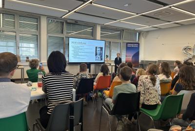 My jsme se zúčastnili jedné vyučovací hodiny, během které jsme zhlédli čtyři velmi zajímavé prezentace. Každý z prezentujících měl přibližně 10–12 minut na své vystoupení a následně odpovídal na dotazy publika i „poroty“.