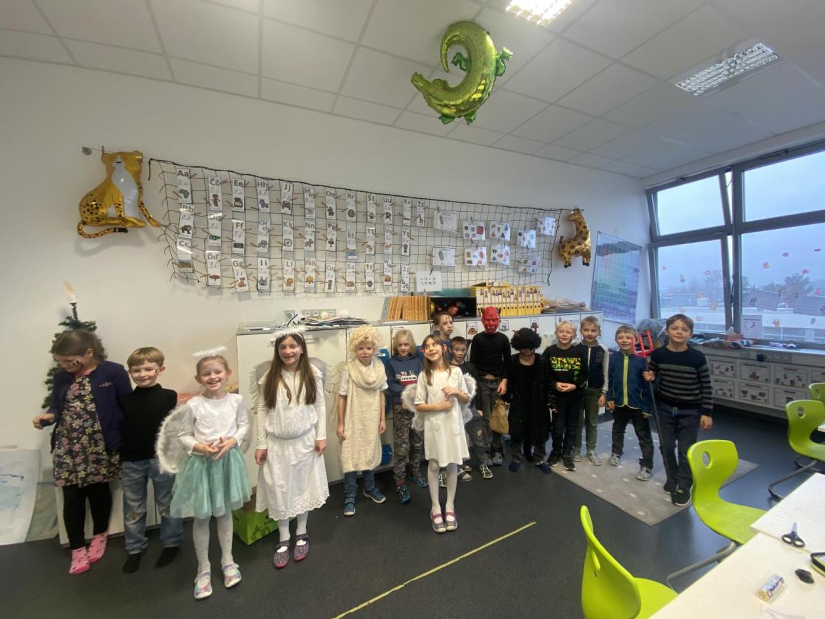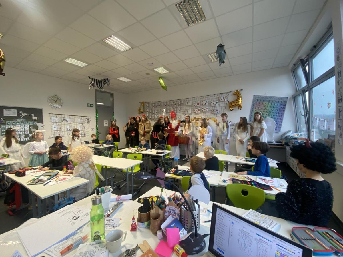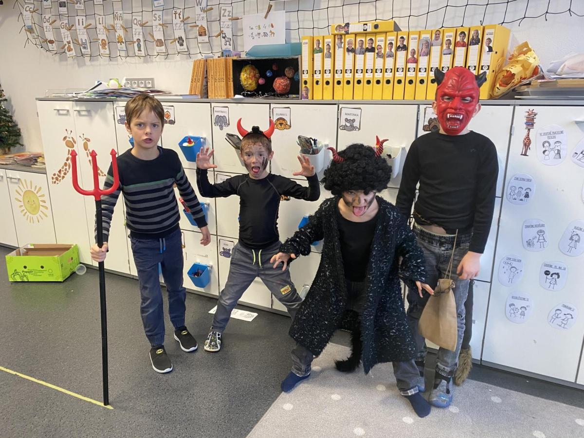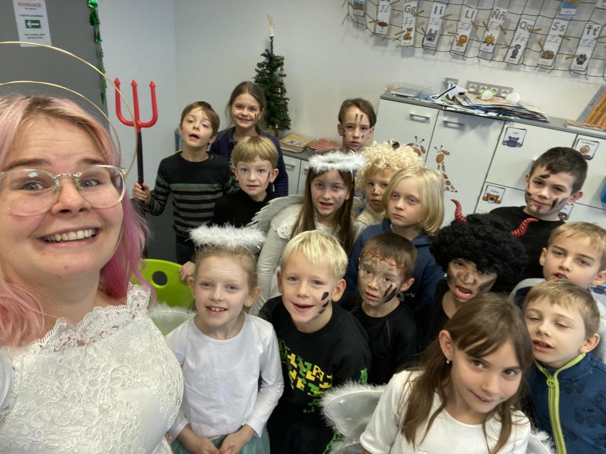 Dneska u nás bylo spoustu čertů a andělů! A třetí hodinu jich přišlo ještě víc, s Mikulášem v čele.