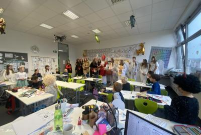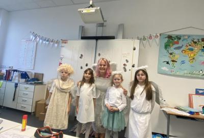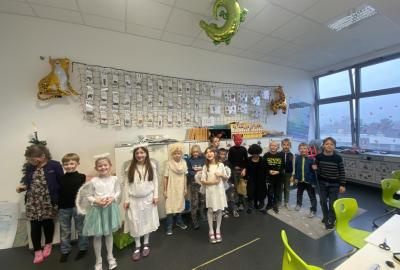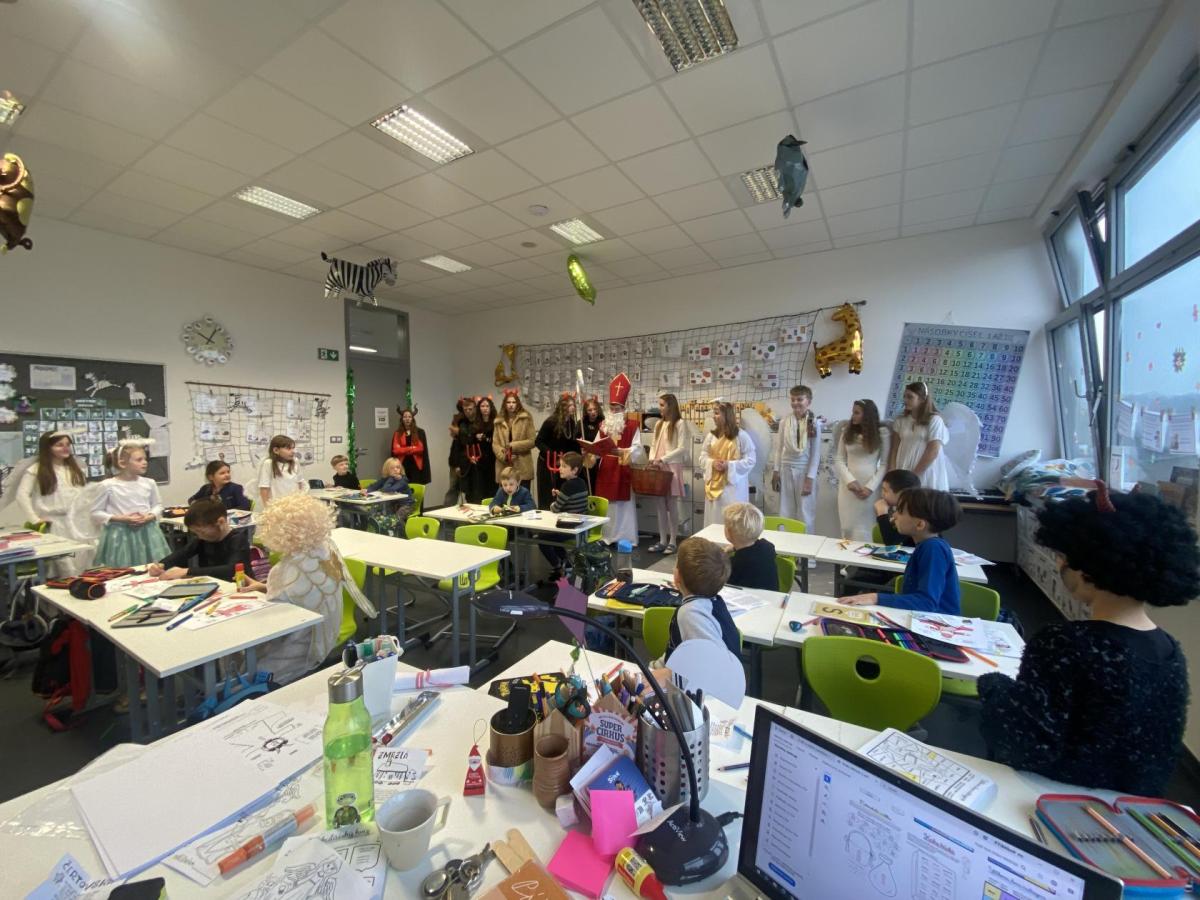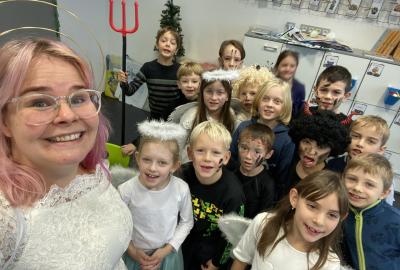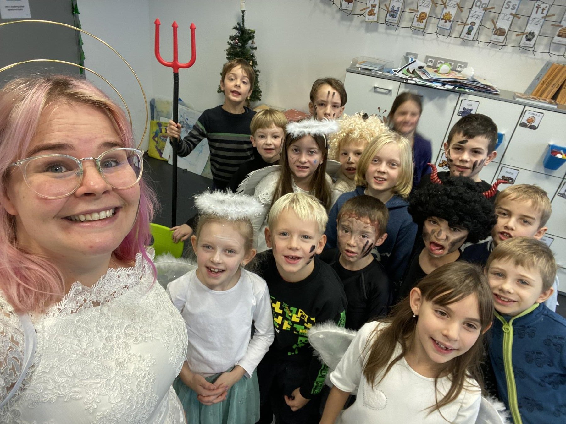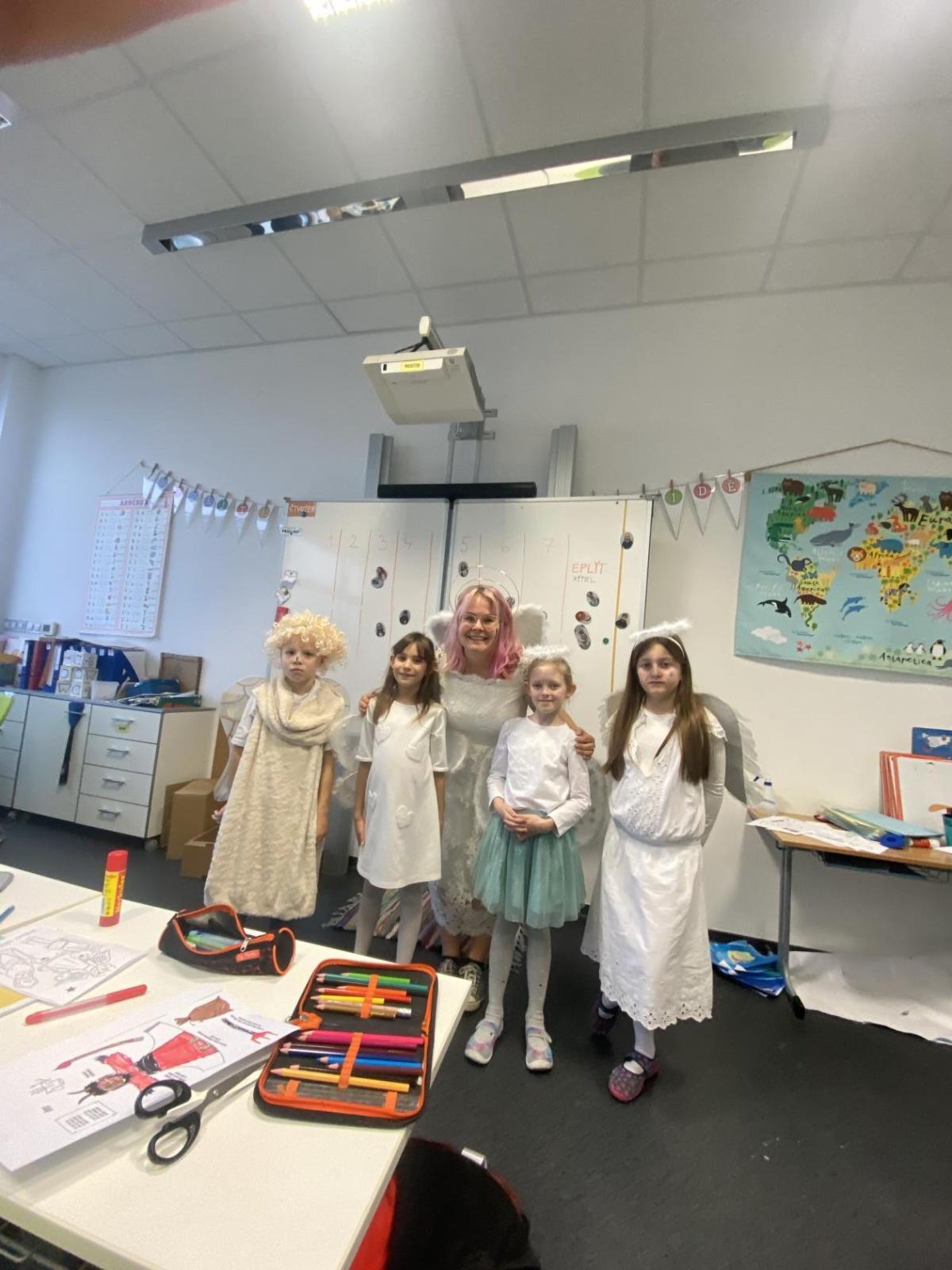 Dneska u nás bylo spoustu čertů a andělů! A třetí hodinu jich přišlo ještě víc, s Mikulášem v čele.
