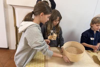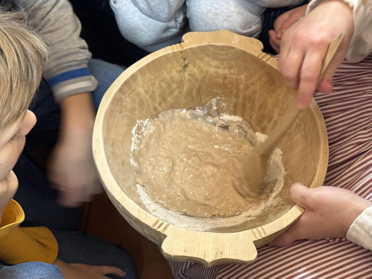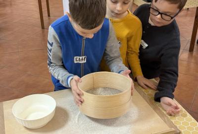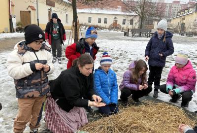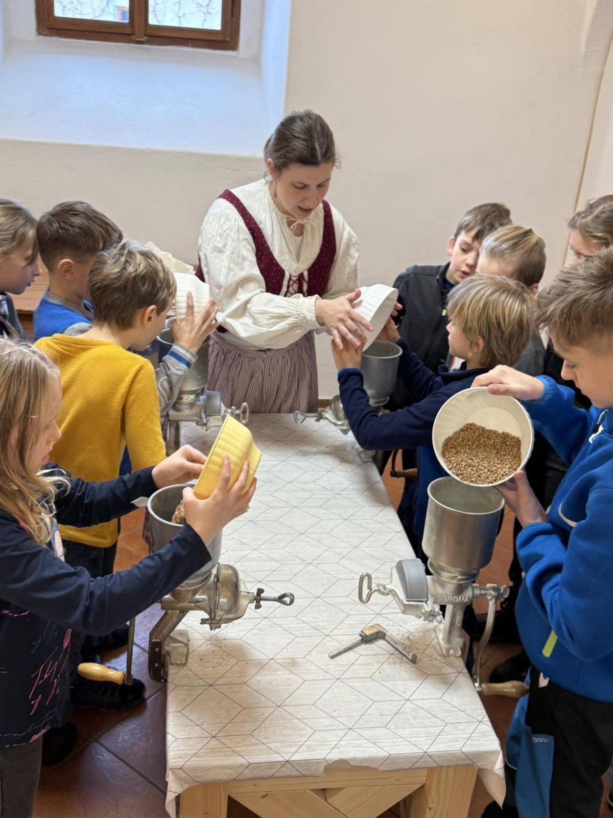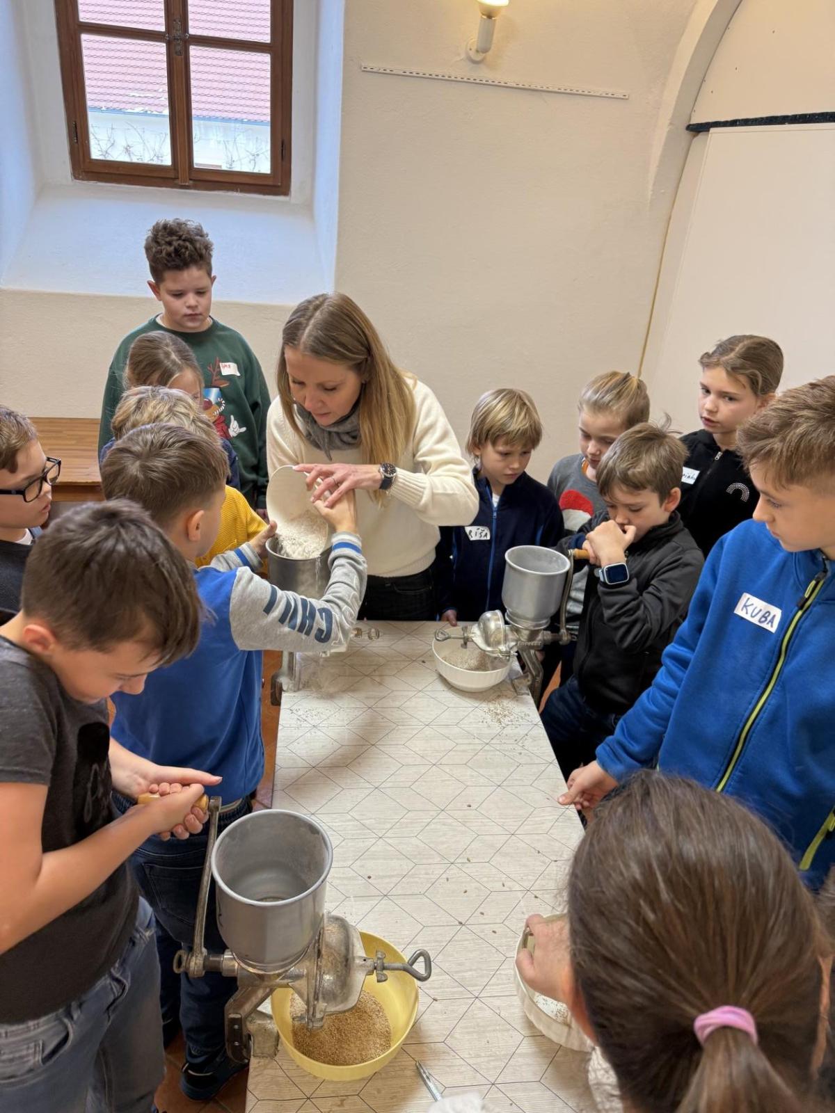 S dětmi jsme se vydali do Toulcova dvora na výukový program Cesta k chlebu, kde si děti mohly vyzkoušet, kolik práce se skrývá za jedním malým bochníkem chleba. Děti se nejprve seznámily, jak se z klasu obilí vymlátí zrno, tedy oddělí zrno od klasu. Následovalo mletí mouky, při kterém si uvědomily, jak je to těžká a poctivá práce. Umletou mouku přesely, aby byla jemná a připravená na samotné pečení. Poté zadělaly na těsto a upekly si svůj vlastní chleba. Některé děti nevydržely a chleba snědly už po cestě do školy. Ve škole jsme si ještě společně vysvětlili poměry surovin, aby si děti dokázaly představit, jak se liší chleba žitný a pšeničný a mohly si přizpůsobit chleba své chuti.