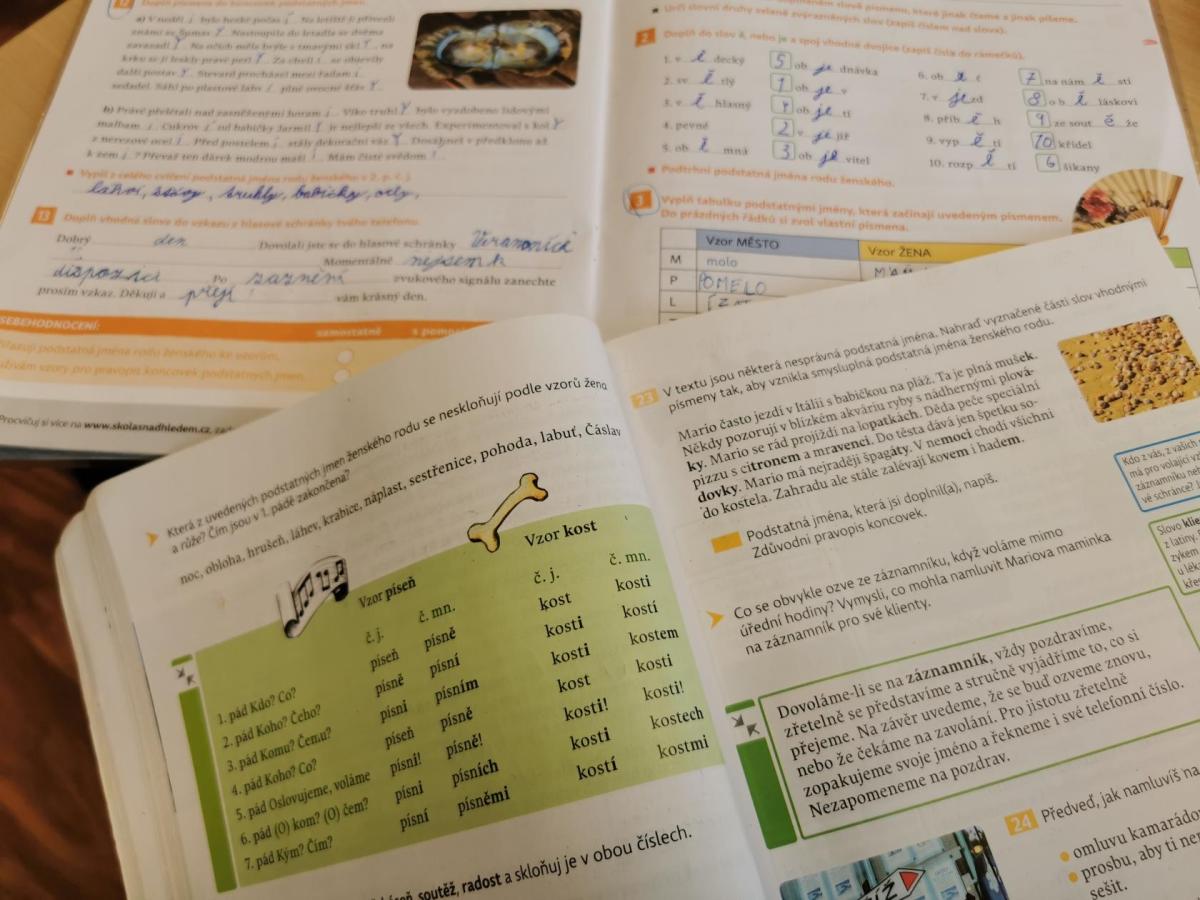 Ve vlastivědě vybarvujeme časovou osu od pravěku až po posledního Přemyslovce, Václav III.. K tomu musíme zvládnout římské číslice a každý den si spočítat pětiminutovku příkladů v sešitě minutovky. Domácích úkolů není mnoho – když člověk pracuje ve škole, doma je to pak hračka.