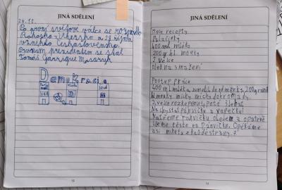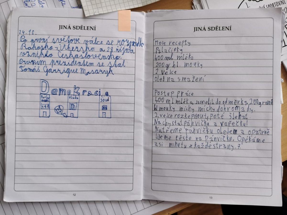 Ve slohu trénujeme pracovní postup, a tak jsme si vybrali palačinky. Ty jsme si skutečně usmažili v hodinách ČP, takže jsme spojili psaní s praxí – a také s pamětí. ? Anežka si povzdechla: „Jak si mám vzpomenout na suroviny a postup, když jsme to dělali před čtrnácti dny?“