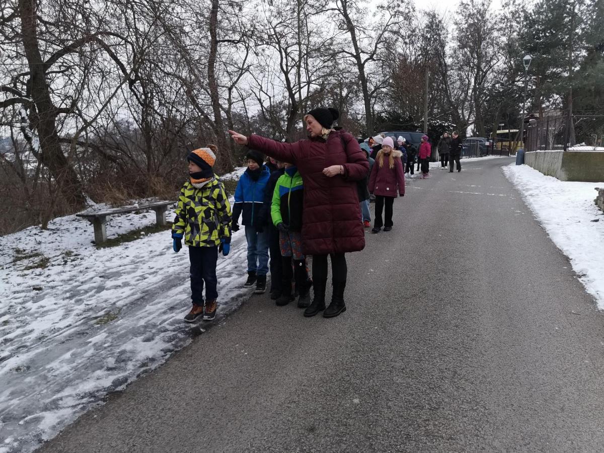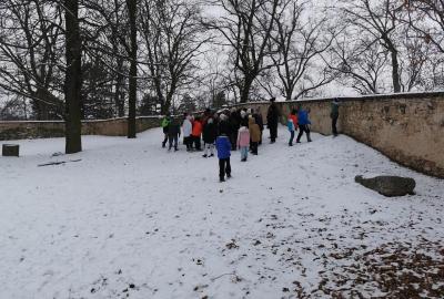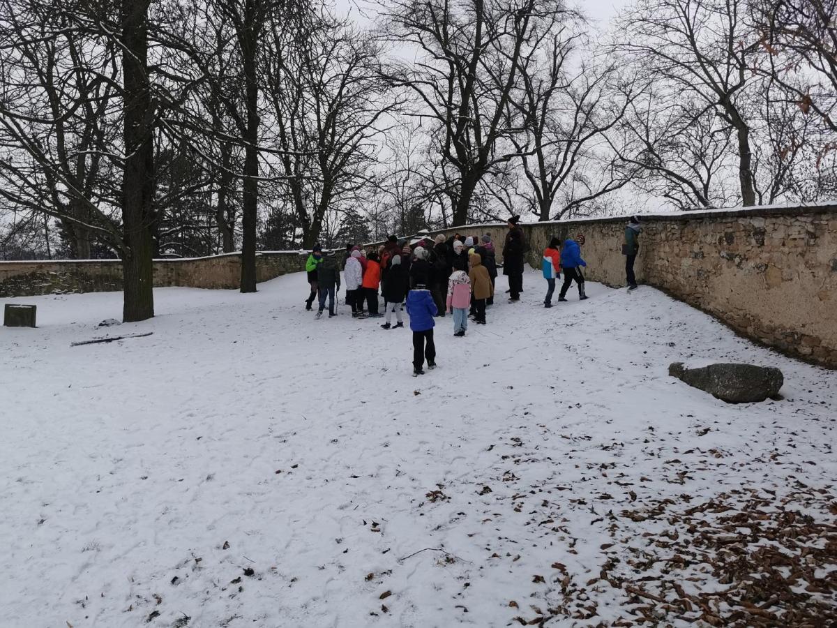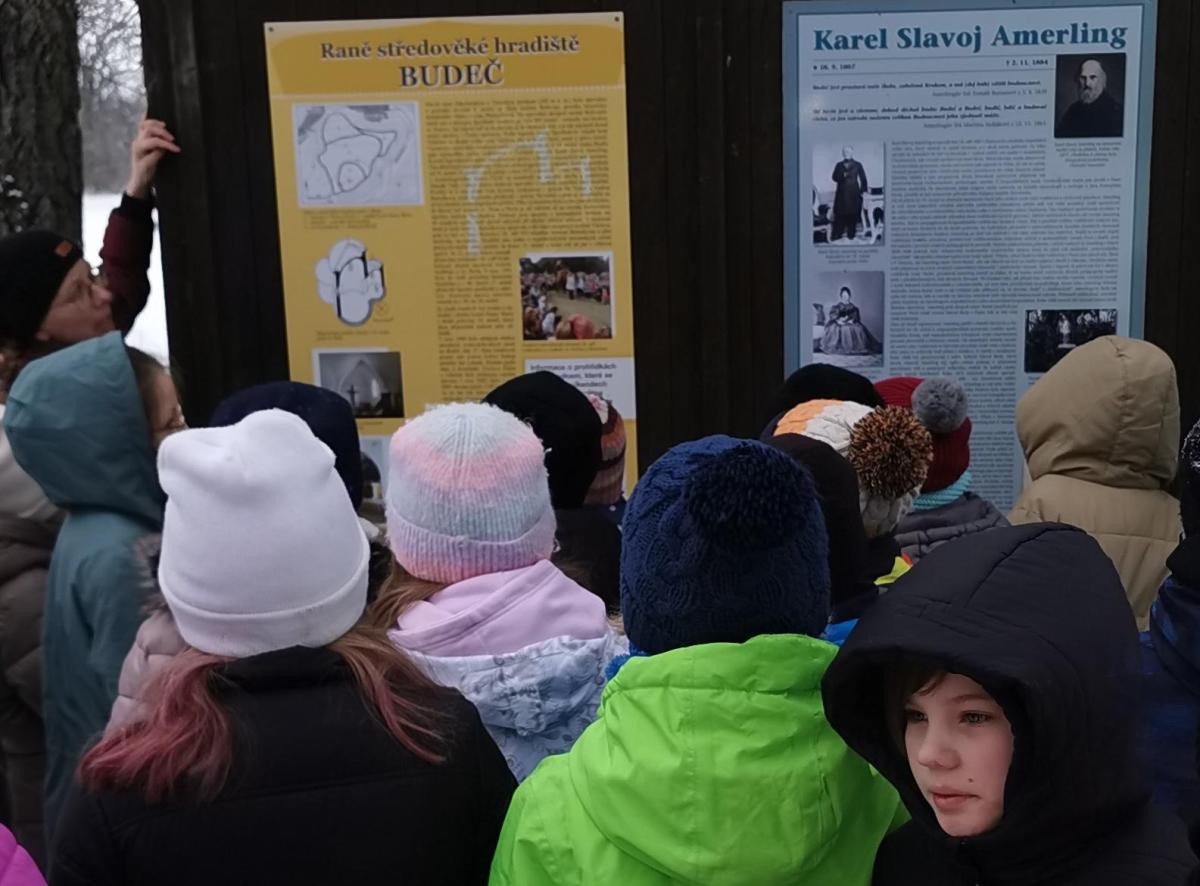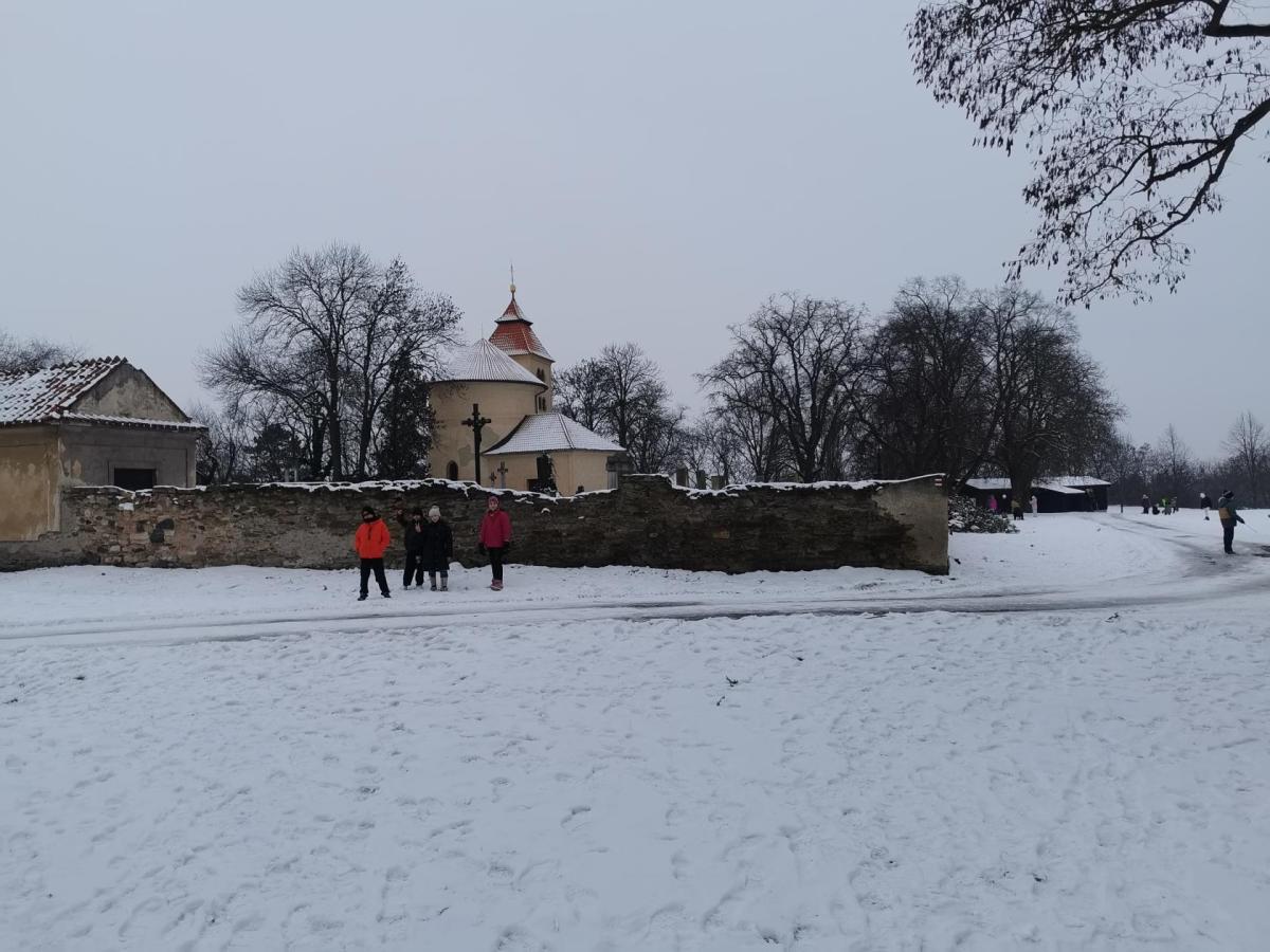Poté jsme pokračovali na Budeč. Po červené turistické značce jsme se vydali po klouzavé ledovce asi 1 kilometr k rotundě. Paní průvodkyně nám nejdříve vyprávěla o tom, že Budeč je možná ještě starší než Levý Hradec.
