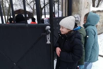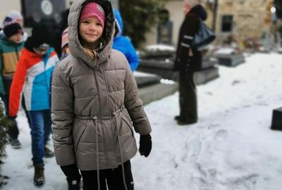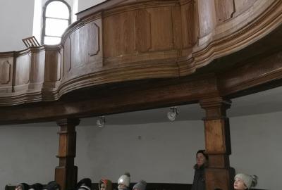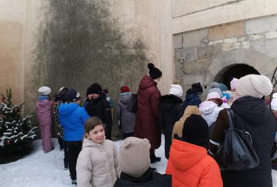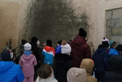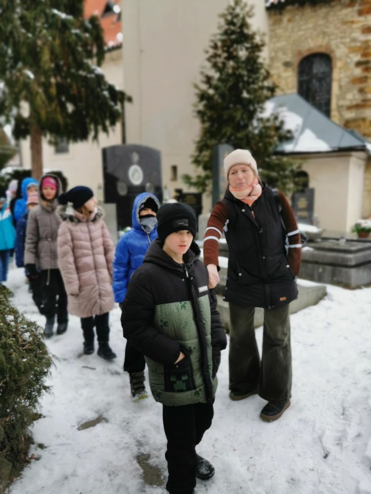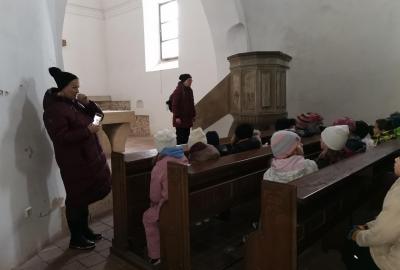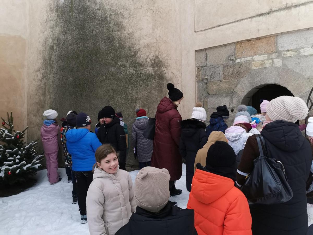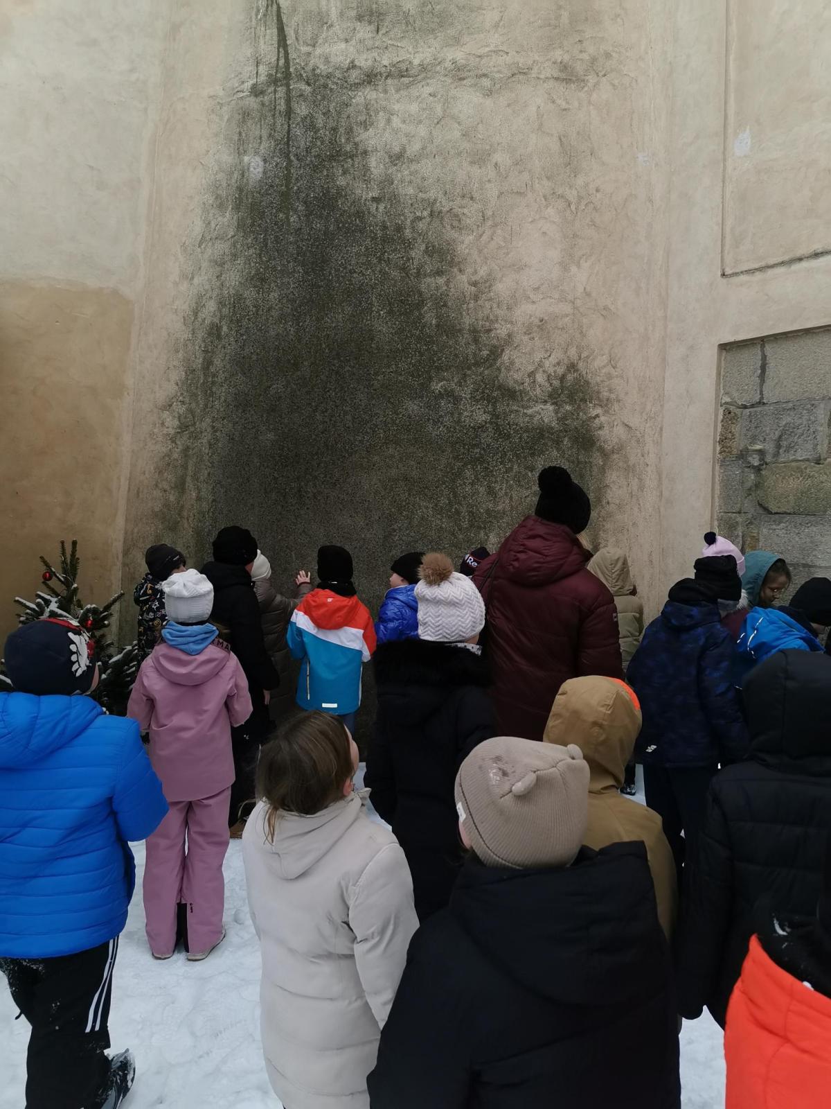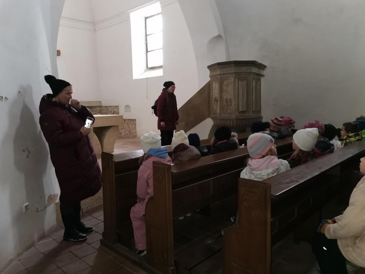 Poté jsme se přesunuli k informačním cedulím. Paní průvodkyně vyprávěla velmi poutavě, ale byla velká zima – skoro jako ve středověku. Nakonec nás pozvala do Rotundy svatého Petra a Pavla. Seděli jsme v lavicích a dívali se k oltáři, kde v minulých letech probíhaly bohoslužby. Poslechli jsme si píseň, kterou nám paní průvodkyně zazpívala. I když to nebyl středověký žalm, byl to krásný závěr prohlídky.