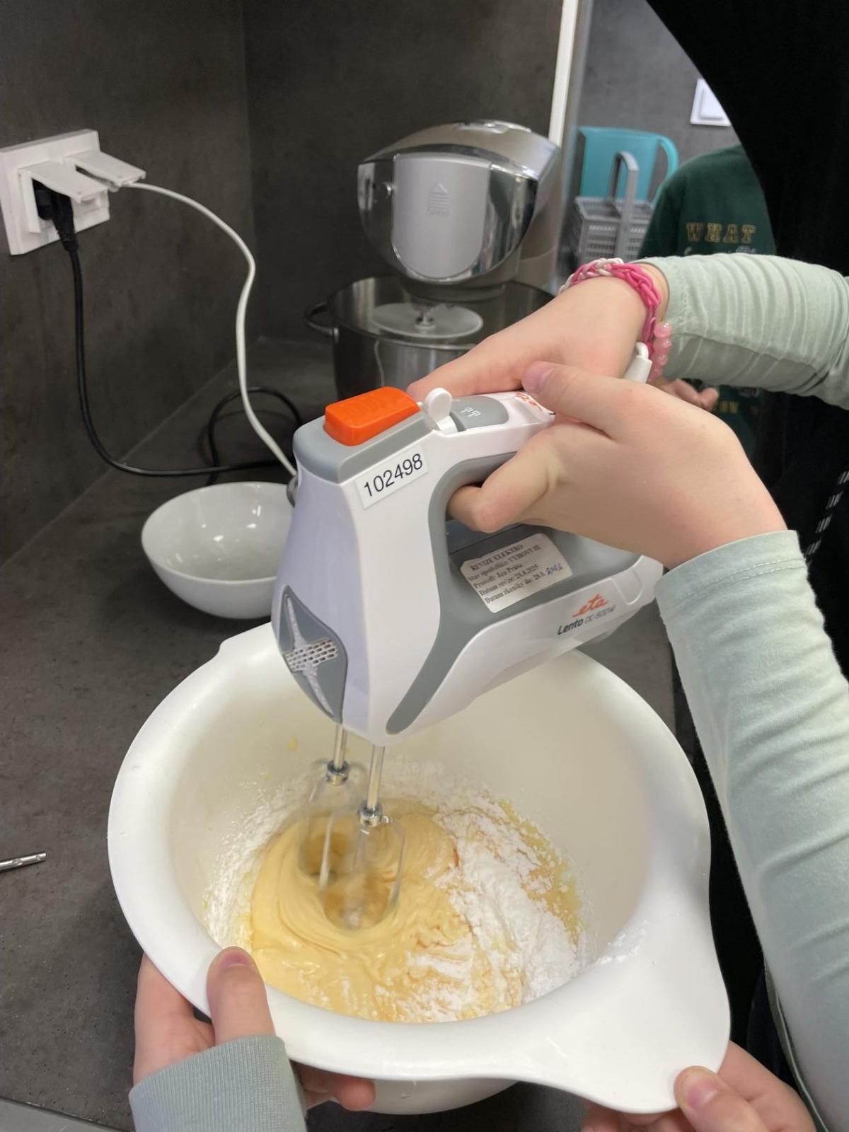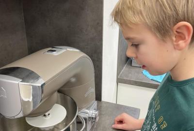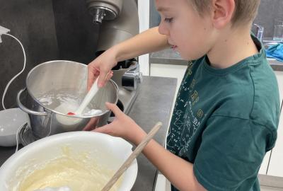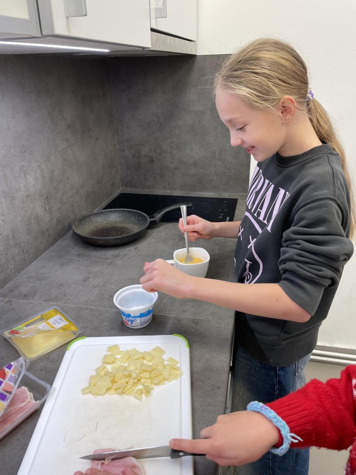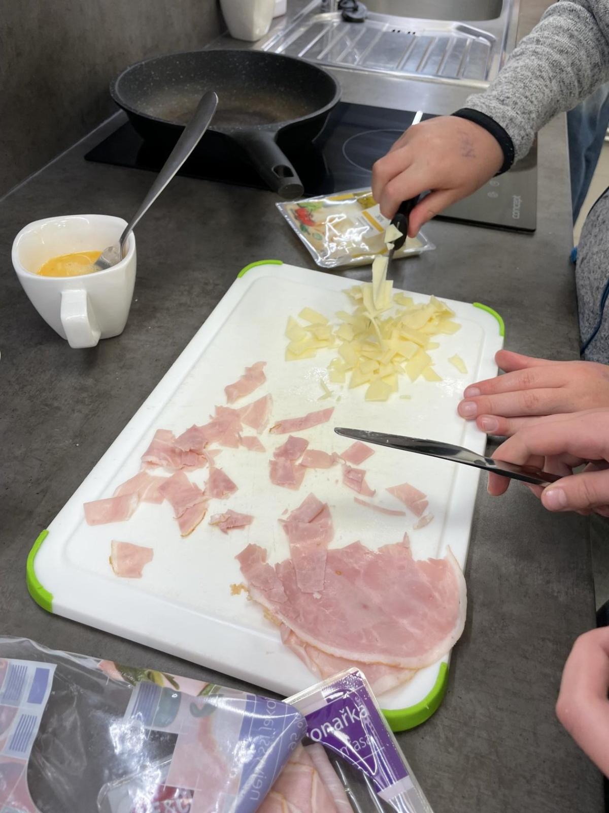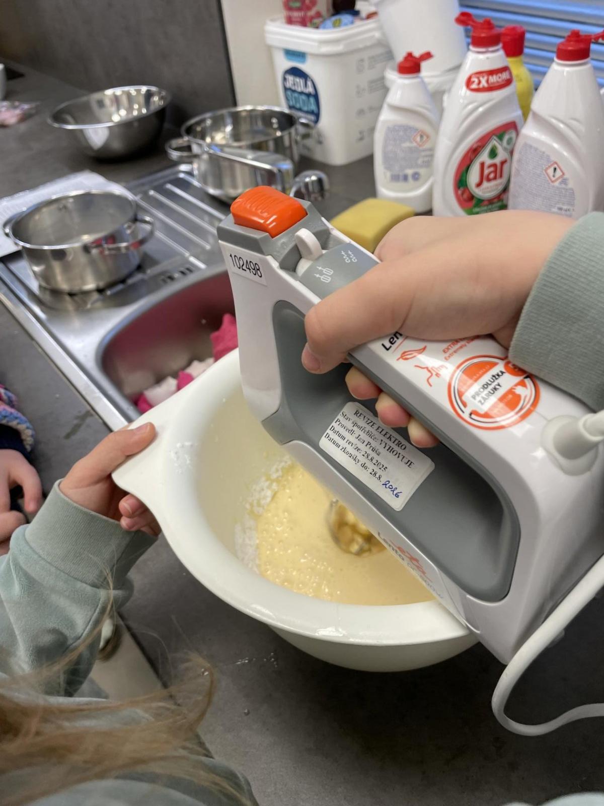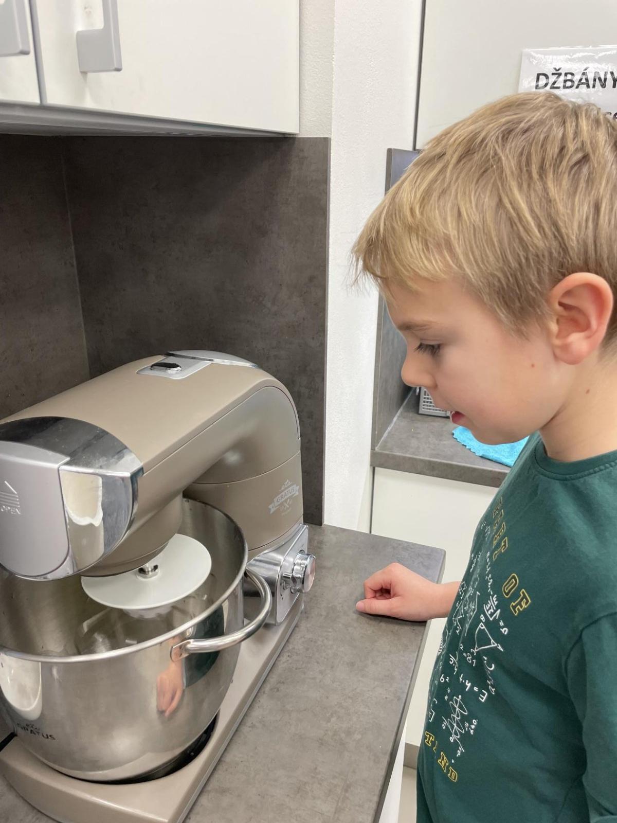 Již v minulém roce si děti vyzkoušely v kuchyňce připravit jednoduchý pokrm - vaječnou omeletu se šunkou a sýrem. To jsem jim jěště hodně pomáhala, ale dnes, kdy už jsou o rok starší, bylo potřeba, aby již práce byla samostatná. A tak tématem přípravy byla opět vaječná omeleta se šunkou a sýrem, to abych zjistila, jak budou děti již samostatně pracovat.Ale aby to nebylo až tak jednoduché, naplánovala jsem jěště připravit piškot. Práci jsme si rozdělili po částech - samostatná příprava omelet a společná příprava těsta na piškot. Nejdříve si chlapci připravovali omelety - bylo vidět, že už jim to šlo o poznání lépe, vlastně mohu konstatovat, že výborně. Děvčata připravovala se mnou těsto na piškot. Pomáhal jim Láďa. A když jsme těsto na piškot dali péci do trouby, to už kluci měli omelety hotové, týmy se v práci vystřídaly, tedy omelety šla dělat skupina, co se mnou připravovala těsto na piškot. Musím moc a moc pochválit "piškoťáky" /děti, co připravovaly těsto na piškot- daly si záležet/. Piškot krásně "vyběhl", byl nadýchaný, prostě takový , no mňam - všichni ho chválili, tak moc chutnal /budeme znovu připravovat/.