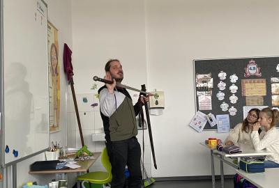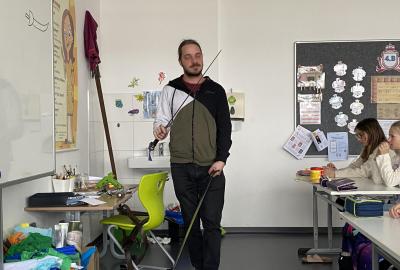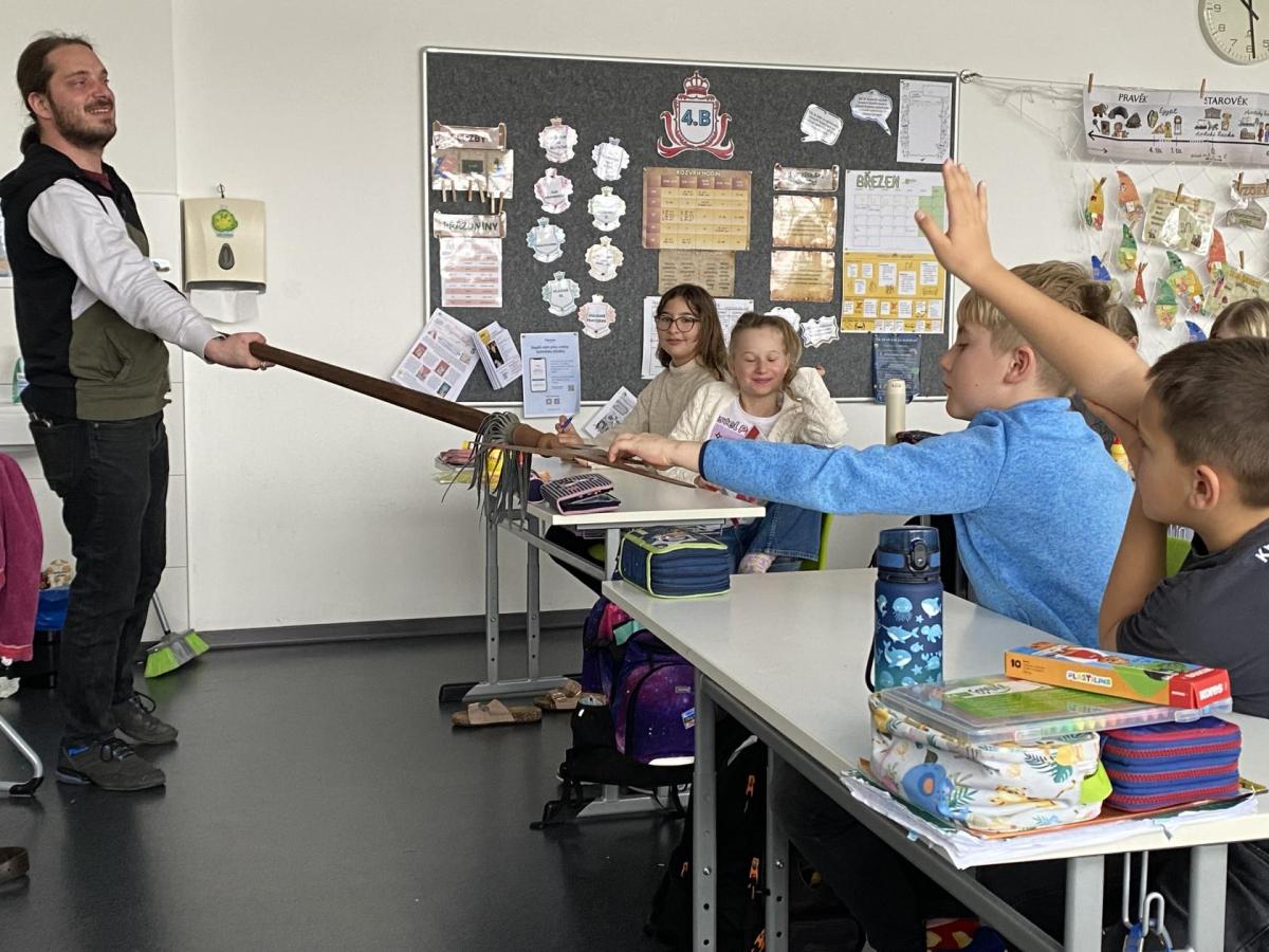 Do třídy zavítal šermíř a dětem přiblížil historické zbraně i umění šermu.