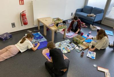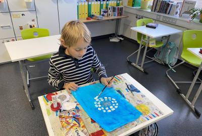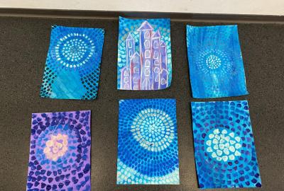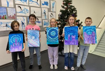 Tento týden jsme se pěkně "obuli" do zimy - malovali jsme Ledové království. S nadšením jsme si připravili temperové i anilinové barvy a vytvářeli jsme barevnou mozaiku pomocí otisků plochého štětce. Ta měla znázorňovat kouzelnou zimní krajinu. Do popředí jsme potom vlepili ledový zámek nakreslený pomocí suchých uměleckých kříd. Nejoblíbenější barvou se tentokrát stala stříbrná tempera, protože dodala našim obrázkům třpyt a zajímavou strukturu. Podařilo se nám vytvořit originální obrázky plné fantazie a zimní nálady. Tu máme nyní pokaždé, když procházíme do třídy kolem naší nástěnky.