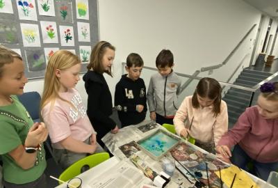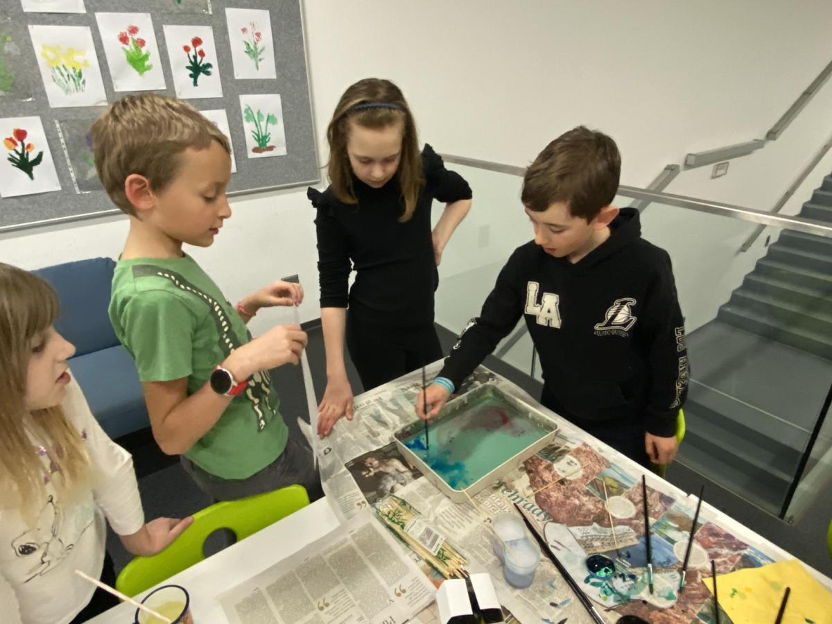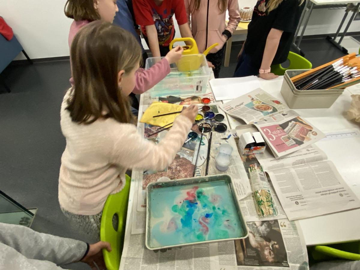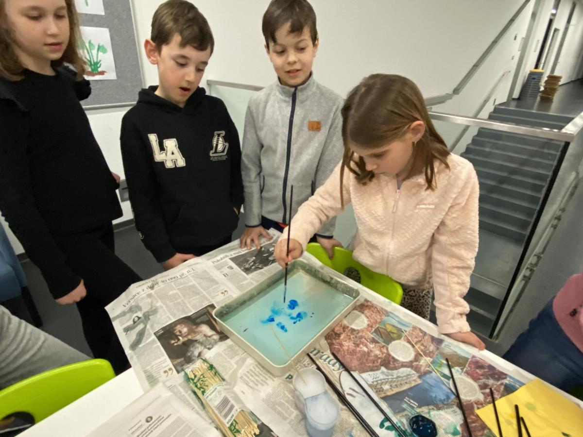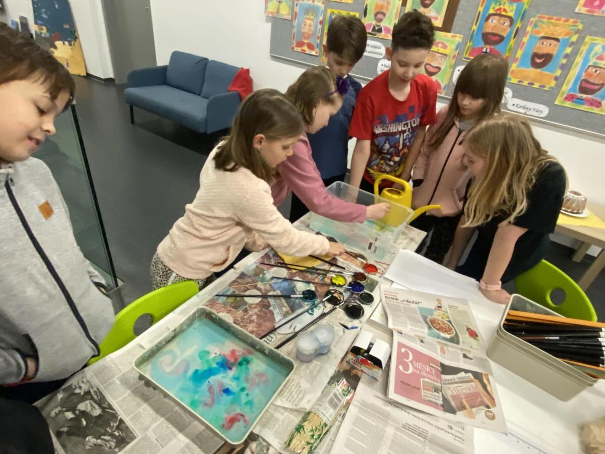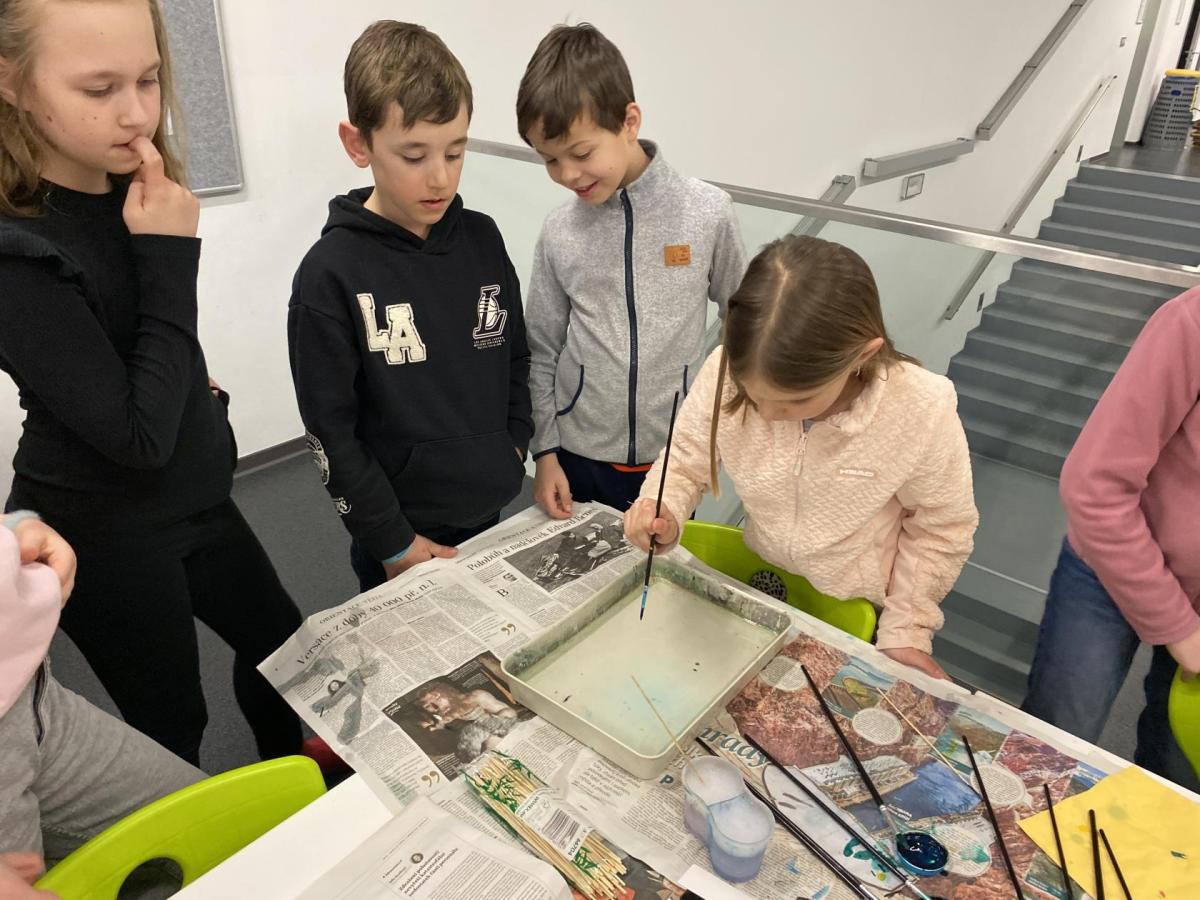 Po literární části jsme se pohodlně uvelebili a pustili si ukázku z filmu Jam utopit doktora Mráčka, která skvěle doplnila atmosféru celého setkání v knihovně. Smích a napětí se střídaly a nikomu se nechtělo od obrazovky odtrhnout. Přesto jsme se museli s paní Vidovou rozloučit a vrátit se do školy, kde jsme se věnovali pro změnu výtvarným a uměleckým činnostem. Vyzkoušeli jsme si japonskou techniku zvanou suminagashi, při které jsme vytvářeli jemné barevné vzory na vodní hladině. Později z nich vyrobíme pozvánky pro rodiče na naše divadelní představení. Těšíme se, že každá pozvánka bude originálem a zároveň malým uměleckým dílem.