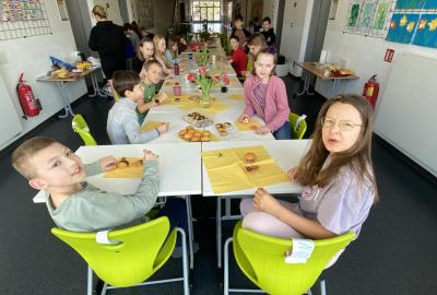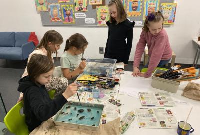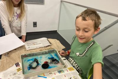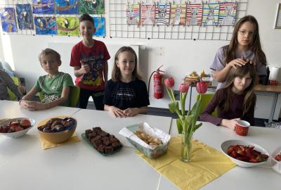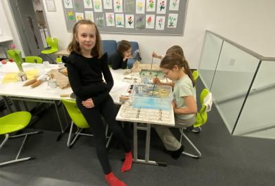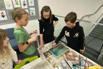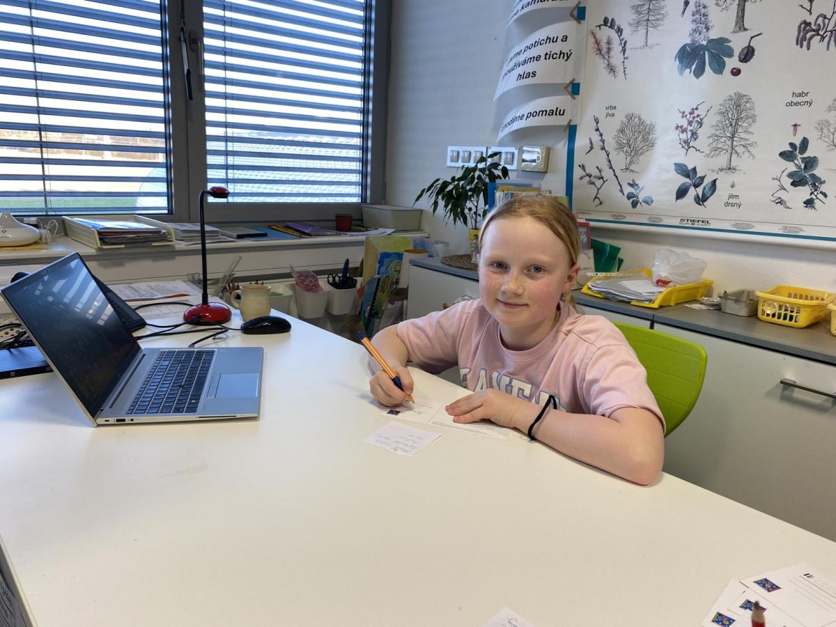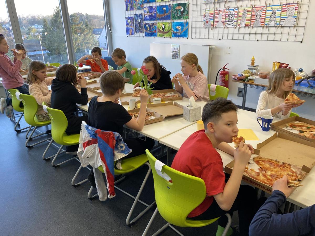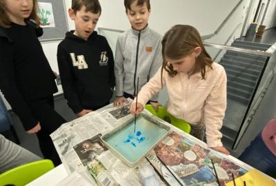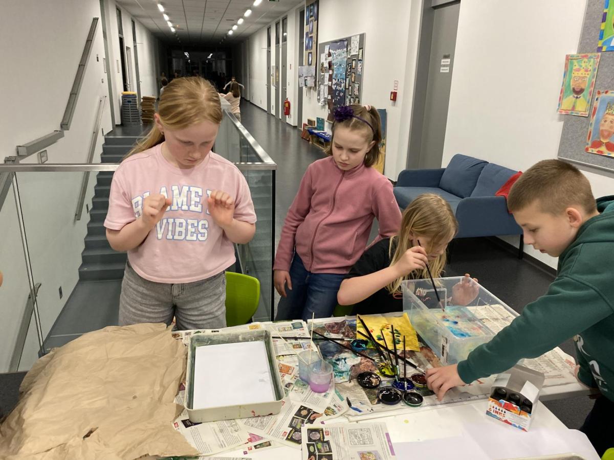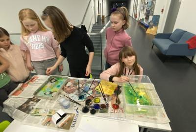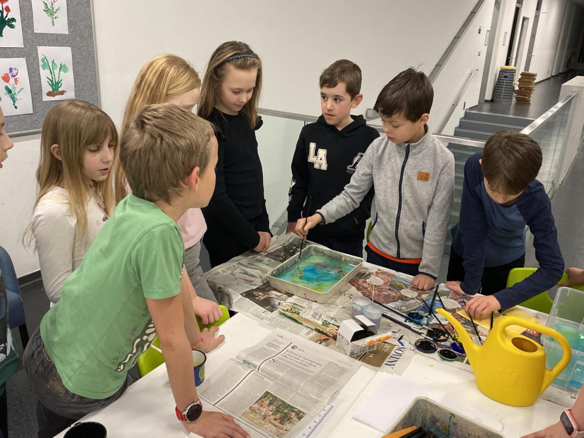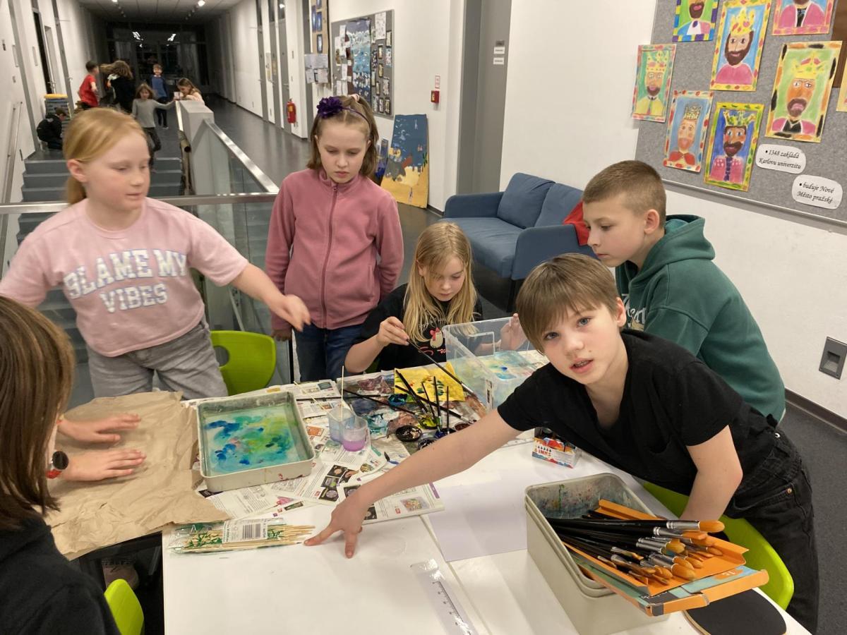Po literární části jsme se pohodlně uvelebili a pustili si ukázku z filmu Jam utopit doktora Mráčka, která skvěle doplnila atmosféru celého setkání v knihovně. Smích a napětí se střídaly a nikomu se nechtělo od obrazovky odtrhnout. Přesto jsme se museli s paní Vidovou rozloučit a vrátit se do školy, kde jsme se věnovali pro změnu výtvarným a uměleckým činnostem. Vyzkoušeli jsme si japonskou techniku zvanou suminagashi, při které jsme vytvářeli jemné barevné vzory na vodní hladině. Později z nich vyrobíme pozvánky pro rodiče na naše divadelní představení. Těšíme se, že každá pozvánka bude originálem a zároveň malým uměleckým dílem.