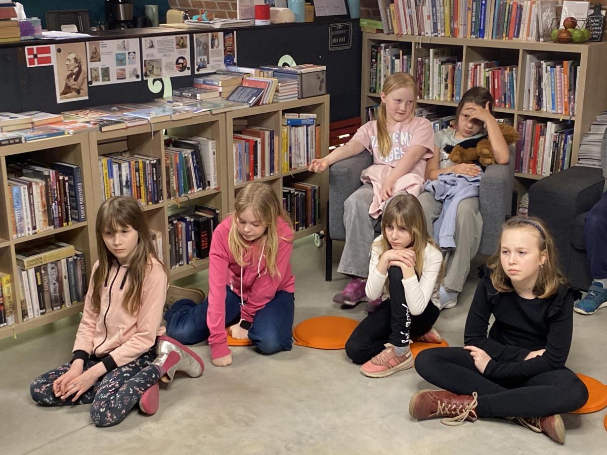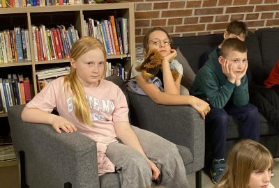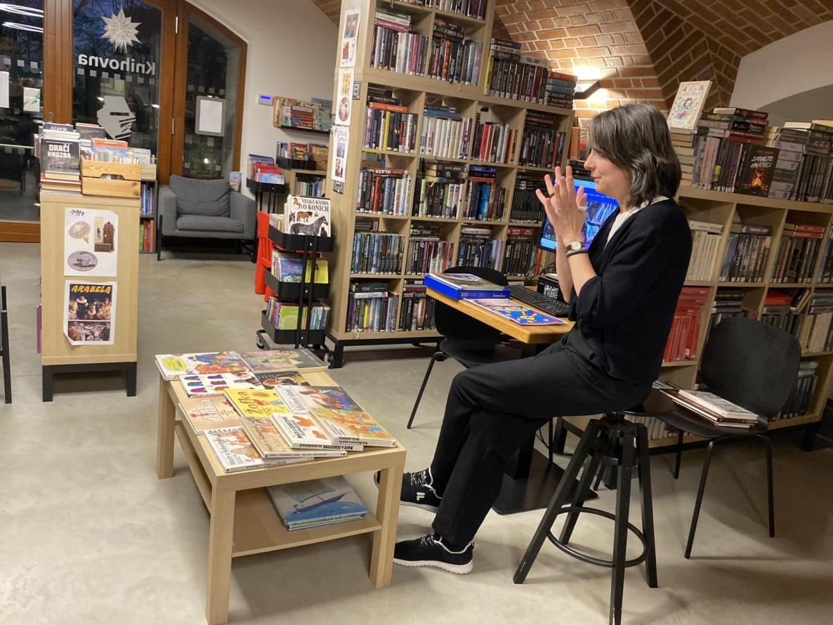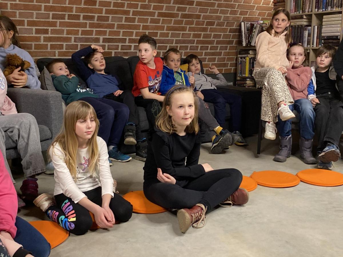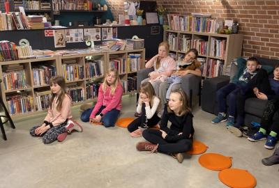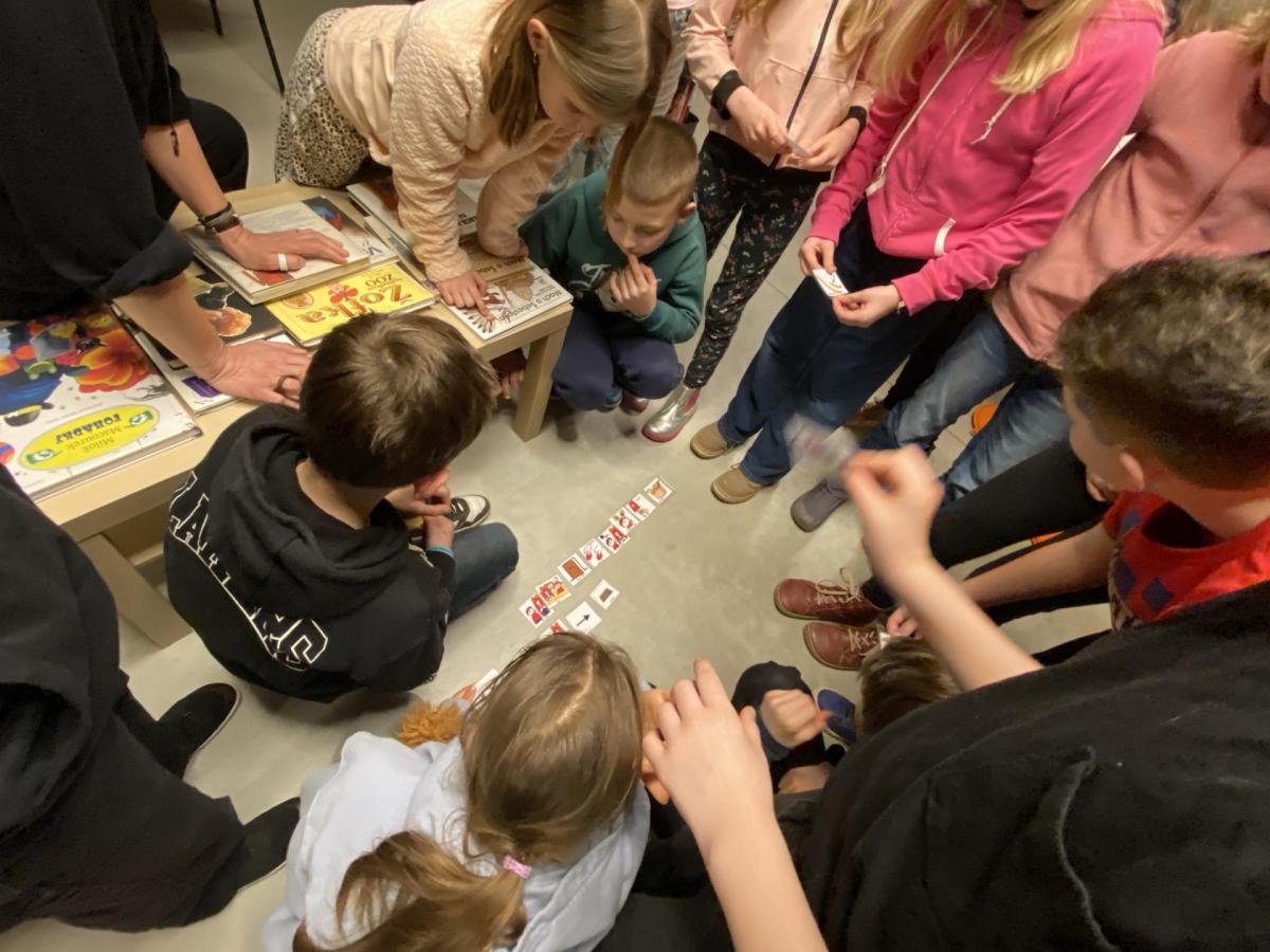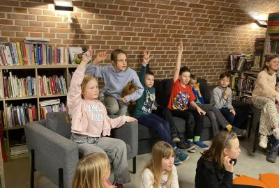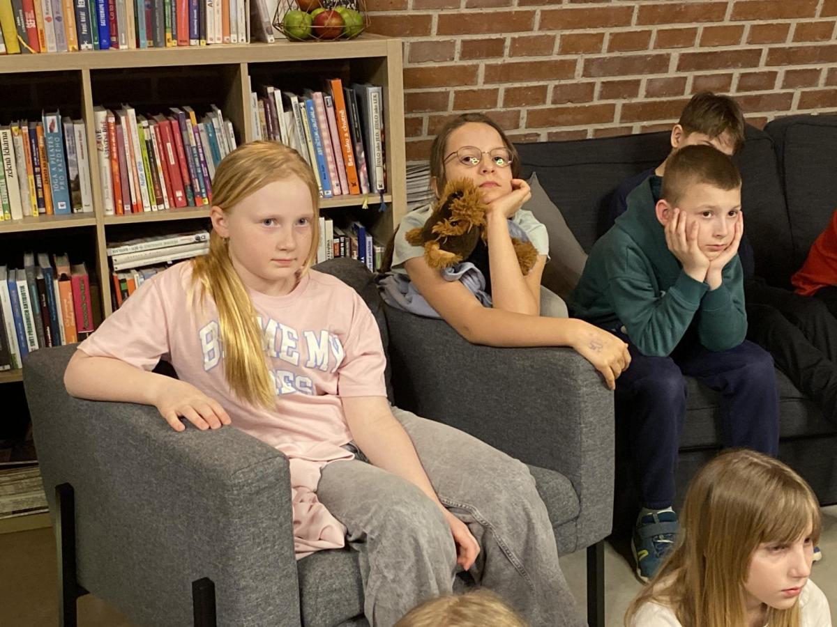Hlavní část programu se odehrála v knihovně, která se na tu noc, díky naší skvělé knihovnici paní Vidové, proměnila v kouzelné místo plné pohádek, ilustrací a příběhů. Usadili jsme se mezi regály s knihami a poslouchali vyprávění o panu Miloši Macourkovi, Adolfu Bornovi i Petru Nárožném. Jejich skvělé umění nás vtáhlo do světa fantazie, humoru a nečakaných nápadů. Povídali jsme si o tvorbě pana Macourka, o postavách z jeho knížek i o tom, jak dokázal obyčejné věci proměnit v neobyčejné.