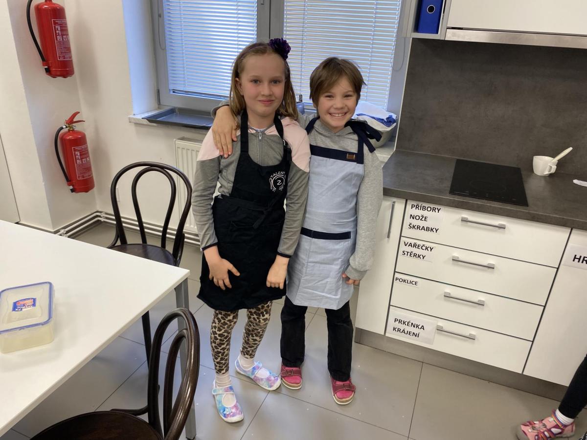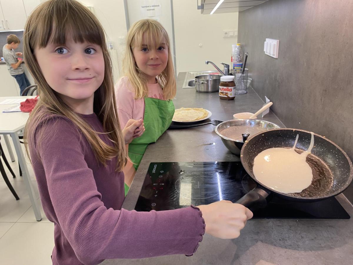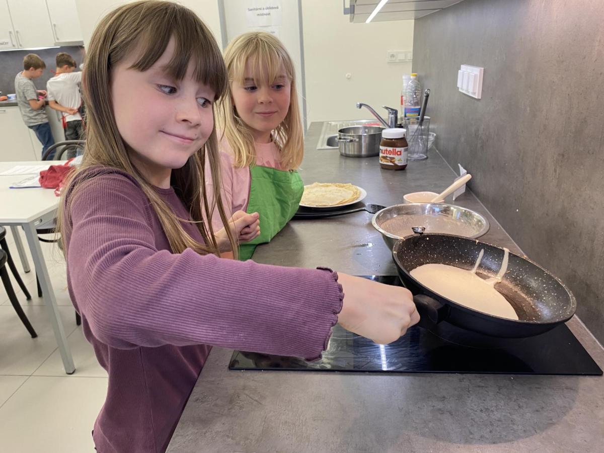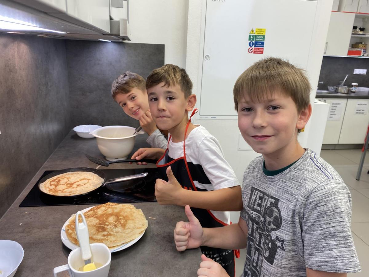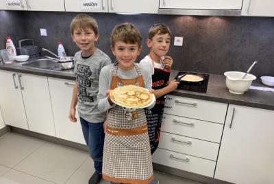 Letos nás čtvrteční odpoledne opravdu moc baví. Nejprve nás pan učitel Šimek pozve do počítačové učebny, kde se pod jeho vedením učíme první důležité aktivity na počítačích. Už jsme se naučili pracovat s programem Bakaláři, kam nám letos všichni učitelé zapisují známky, domácí úkoly, učivo a další požadavky k jednotlivým předmětům. Po informatice se rozdělíme na dvě poloviny a už se těšíme na pana učitele Honzu, který si nás odvede do technické dílny. Tu už známe z loňského roku, takže víme, že nás zde u pracovních "ponků" čekají svěráky, vrtačky, kladívka, pilky... a další pomůcky potřebné k výrobě předmětů ze dřeva i kovu. Prvním rokem chodíme do kuchyňky s paní učitelkou Strnadovou. Dnešní hodina pod jejím vedením patřila palačinkám. Mouka, mléko, vajíčka a pěkně pečlivě vyšlehat do hladkého těsta. Vůně palačinek přilákala i naši paní učitelku. A protože je vážně na sladké, dostala od nás jednu voňavou ochutnávku! Paní učitelka říkala, že jsme moc šikovní a palačinku slupla jedna dvě. V pololetí se obě skupinky vymění, aby si všichni vyzkoušeli kuchyňku i dílnu. Tak se těšíme, co nás čeká za týden.