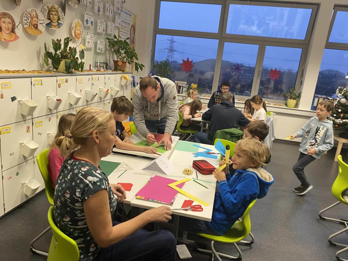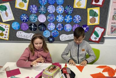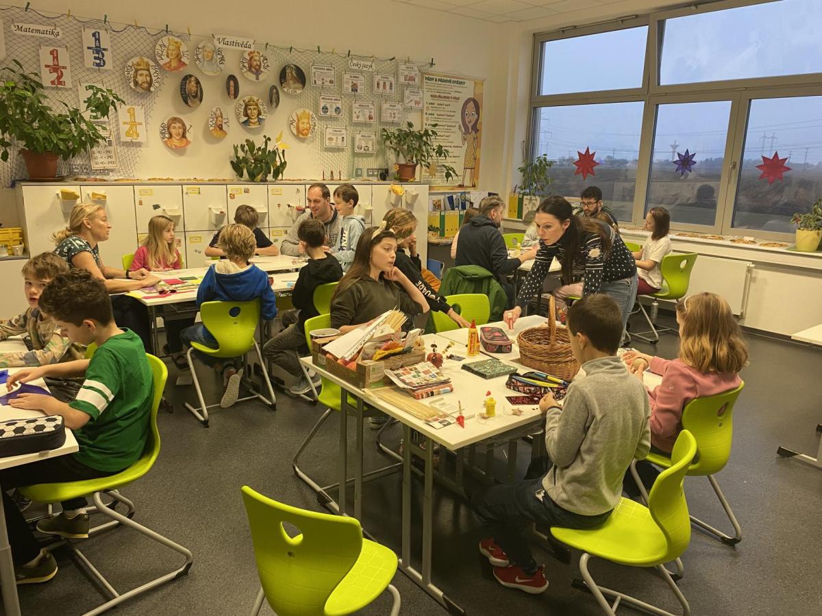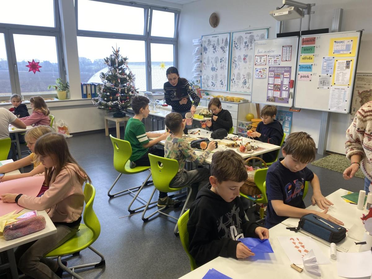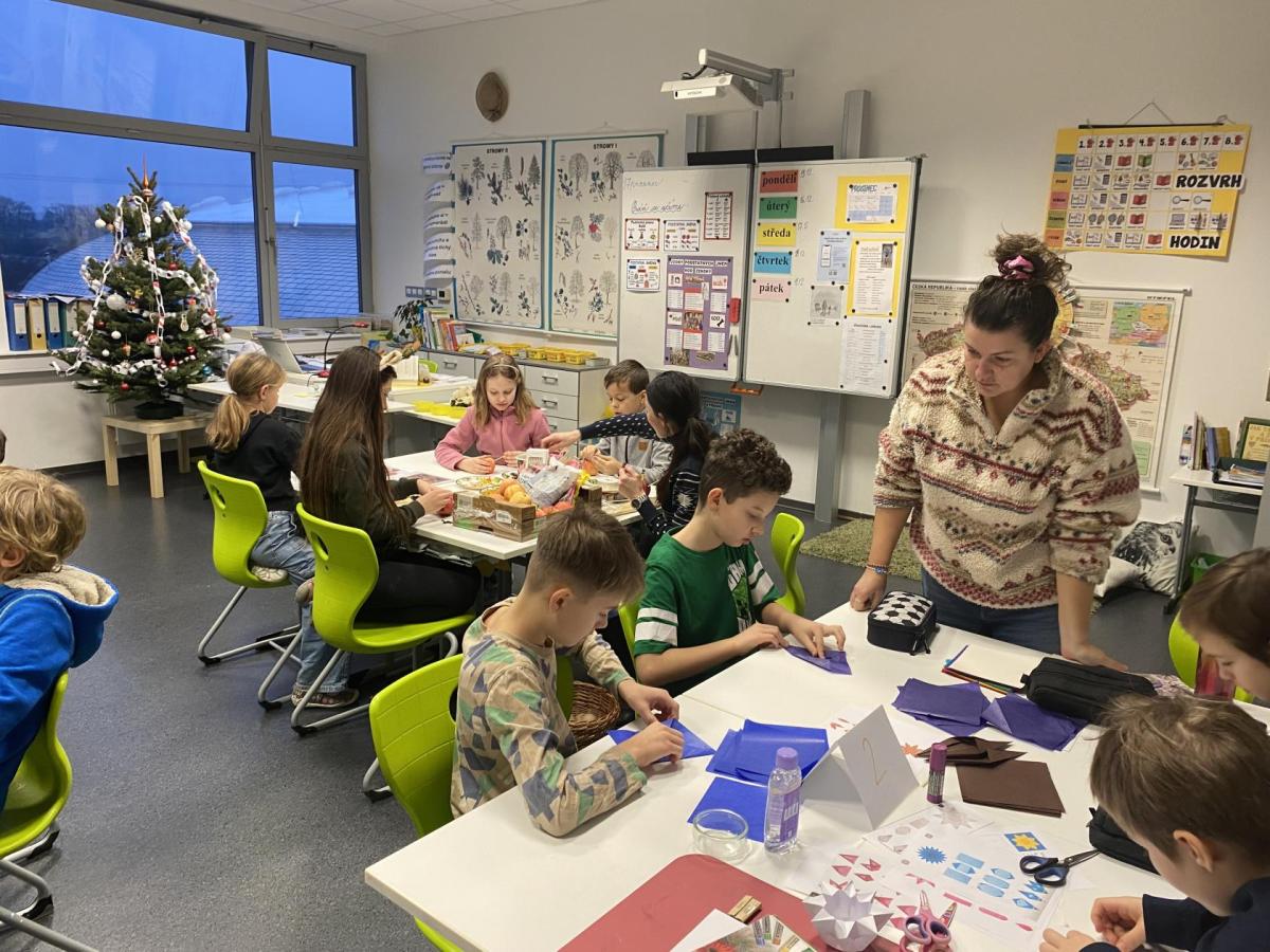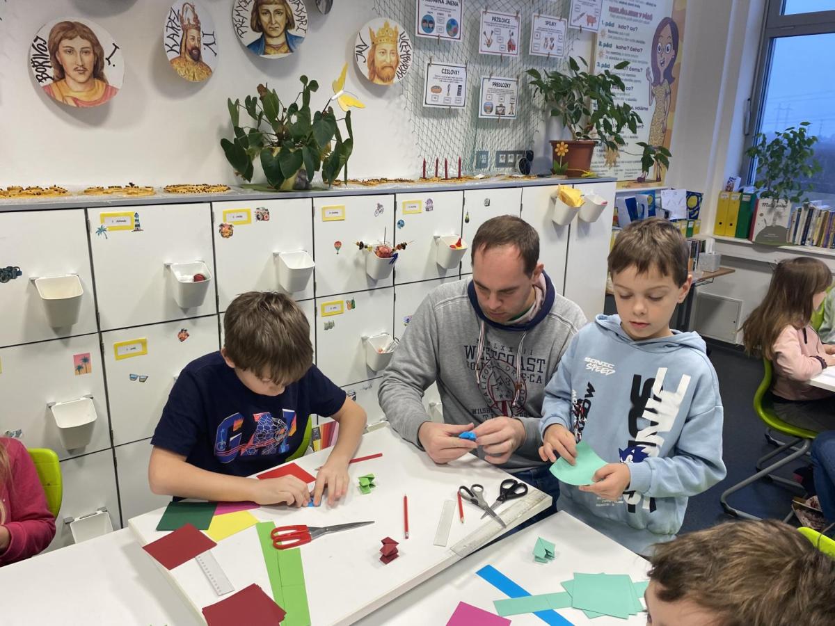 Jak to už s těmi tradicemi bývá, tato tvořivá, patří u nás ve třídě k nejoblíbenějším! Každý rok se těšíme, kdy za námi přijdou naši rodiče na celé dopoledne a na jakém krásném výrobku s nimi budeme pracovat. Maminka našeho Péti, za vydatné pomoci Sebíkova taťky, nás naučila skládat pohyblivý ornament z kartonu. V dílničce, kterou již tradičně vedli tatínkové Vojtíka a Matěje, jsme si vyrobili sněhuláčka z papírových kelímků. Každé vánoční období za námi do dílniček chodí také Zarinčina maminka, a vždy s sebou přinese nějaký neobvyklý nápad. Tentokrát to byla skládaná hvězda na okno z hedvábných papírů. Voňavou dílničkou nás provedla maminka naší Evelínky, protože jsme zde tvořili krásné svícky z jablíček a různým dalších dobrůtek. A ten, kdo byl při vyrábění svícnu rychlejší, si mohl ještě ozdobit kartonová srdíčka a kouličky ubrouskovou technikou. Všechny dílničky jsme si vážně moc a moc užili a výrobky se povedly nad očekávání. Naši kreativitu ocenila i paní ředitelka, která se zastavila na malou tvořivou ochutnávku. Čtyři dopolední hodiny plné nadšení, úsměvů, pohody a vánoční nálady uběhly jako mávnutím kouzelného proutku a my jsme se našimi maminkami a tatínky museli rozloučit. Poděkovali jsme jim bouřlivým potleskem a paní učitelka ještě s mrknutím oka přidala, že už se těší na Velikonoce. Určitě si zase něco hezkého vyrobíme. Tak moc a moc děkujeme a jsme vážně rádi, že vás to s námi stále baví!