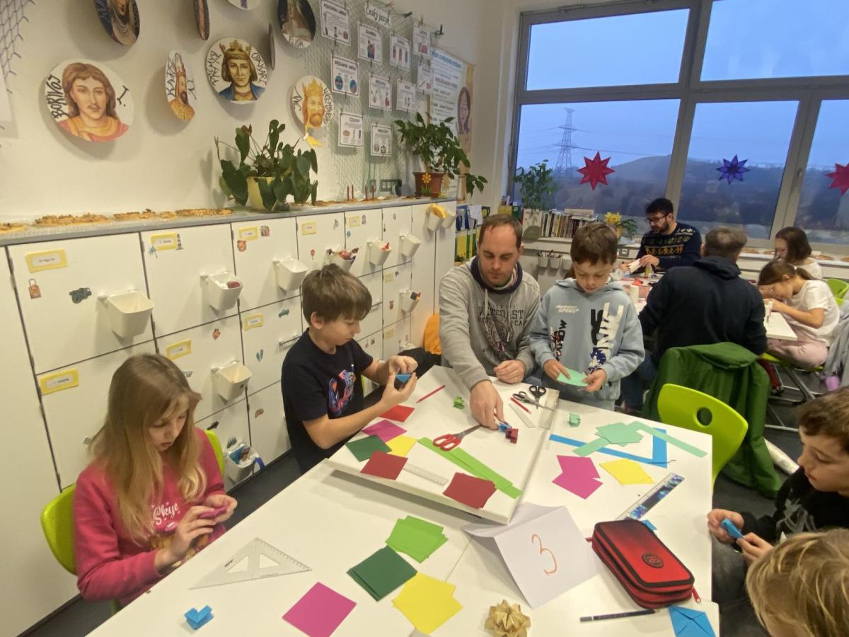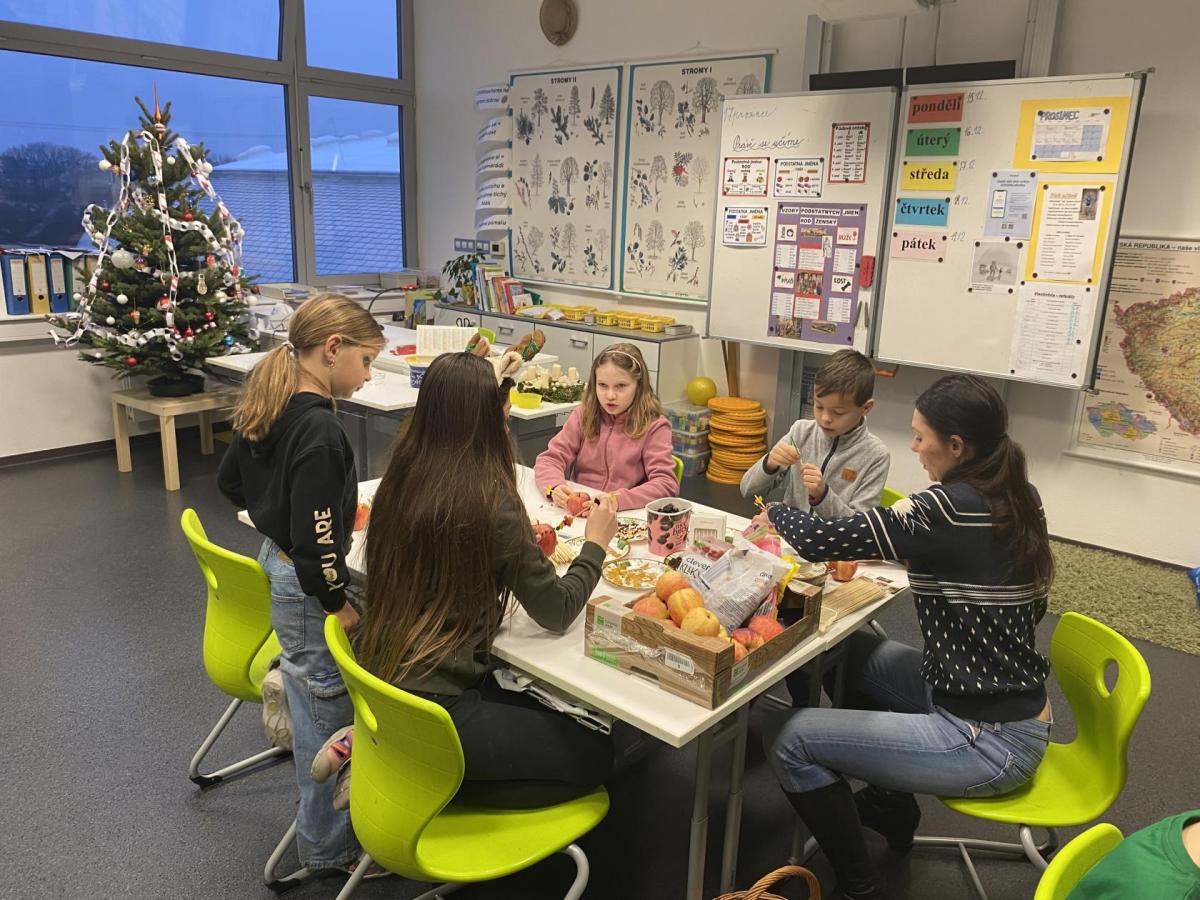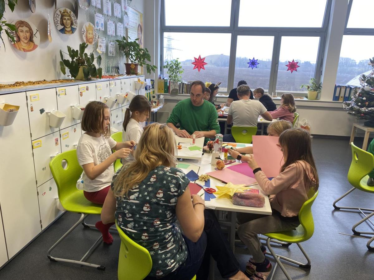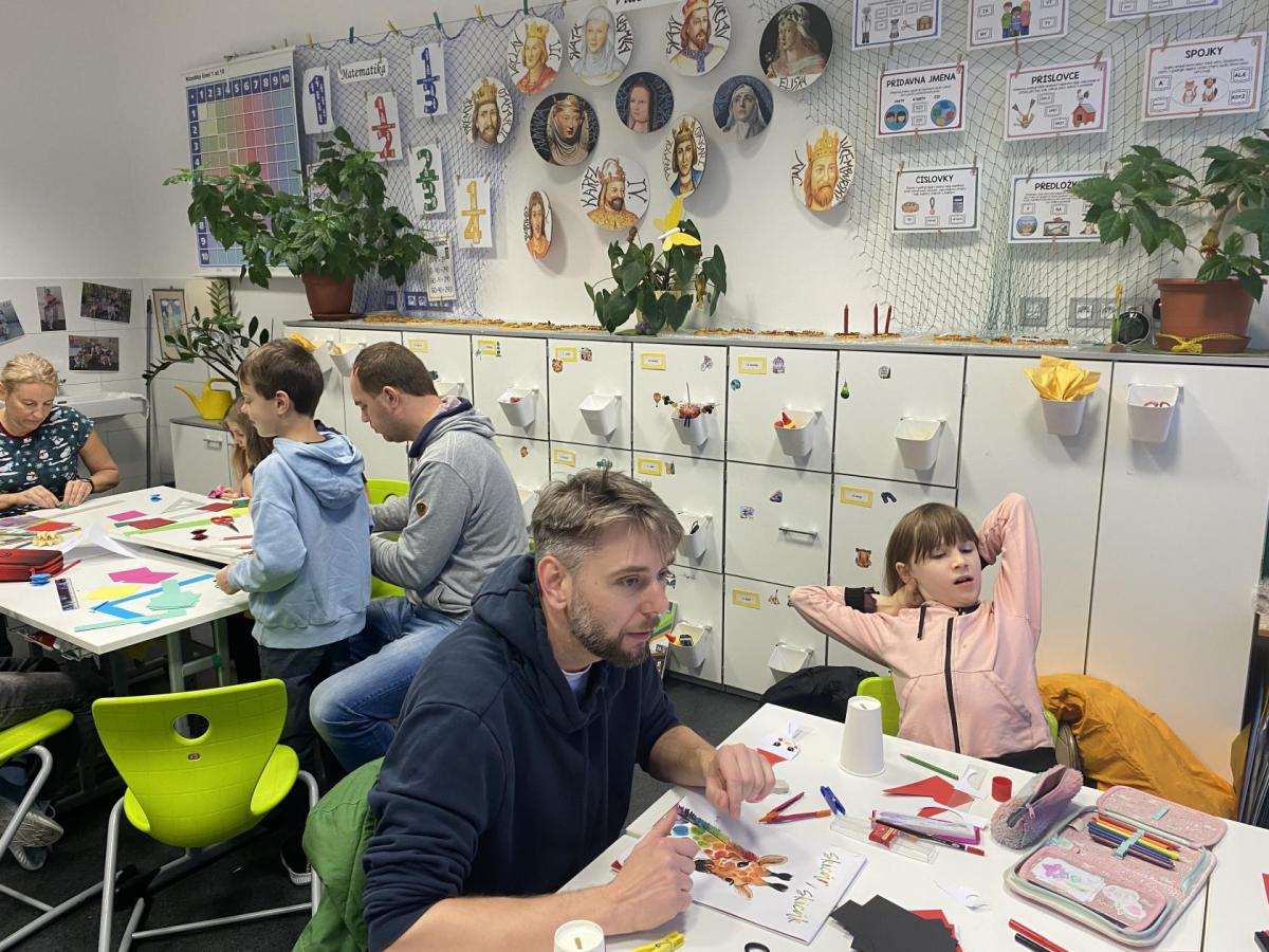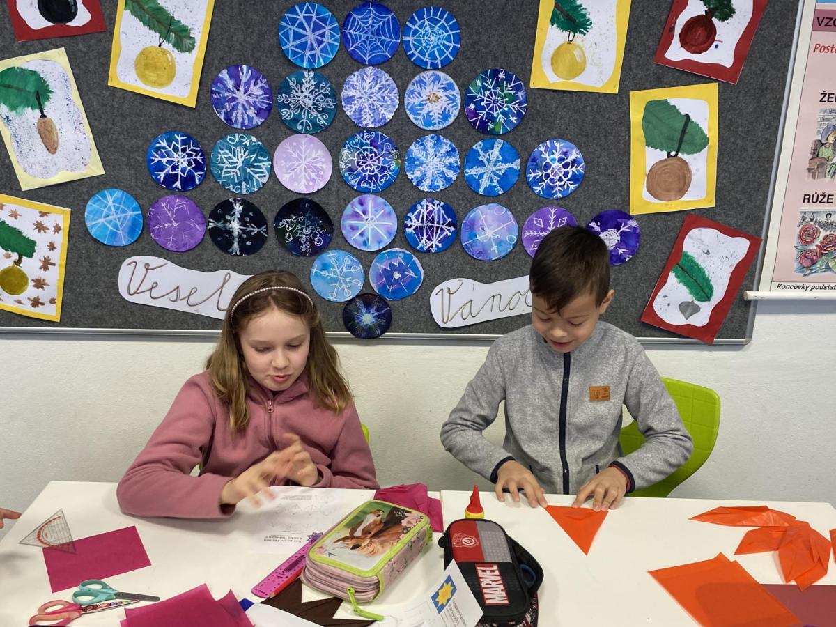 Jak to už s těmi tradicemi bývá, tato tvořivá, patří u nás ve třídě k nejoblíbenějším! Každý rok se těšíme, kdy za námi přijdou naši rodiče na celé dopoledne a na jakém krásném výrobku s nimi budeme pracovat. Maminka našeho Péti, za vydatné pomoci Sebíkova taťky, nás naučila skládat pohyblivý ornament z kartonu. V dílničce, kterou již tradičně vedli tatínkové Vojtíka a Matěje, jsme si vyrobili sněhuláčka z papírových kelímků. Každé vánoční období za námi do dílniček chodí také Zarinčina maminka, a vždy s sebou přinese nějaký neobvyklý nápad. Tentokrát to byla skládaná hvězda na okno z hedvábných papírů. Voňavou dílničkou nás provedla maminka naší Evelínky, protože jsme zde tvořili krásné svícky z jablíček a různým dalších dobrůtek. A ten, kdo byl při vyrábění svícnu rychlejší, si mohl ještě ozdobit kartonová srdíčka a kouličky ubrouskovou technikou. Všechny dílničky jsme si vážně moc a moc užili a výrobky se povedly nad očekávání. Naši kreativitu ocenila i paní ředitelka, která se zastavila na malou tvořivou ochutnávku. Čtyři dopolední hodiny plné nadšení, úsměvů, pohody a vánoční nálady uběhly jako mávnutím kouzelného proutku a my jsme se našimi maminkami a tatínky museli rozloučit. Poděkovali jsme jim bouřlivým potleskem a paní učitelka ještě s mrknutím oka přidala, že už se těší na Velikonoce. Určitě si zase něco hezkého vyrobíme. Tak moc a moc děkujeme a jsme vážně rádi, že vás to s námi stále baví!