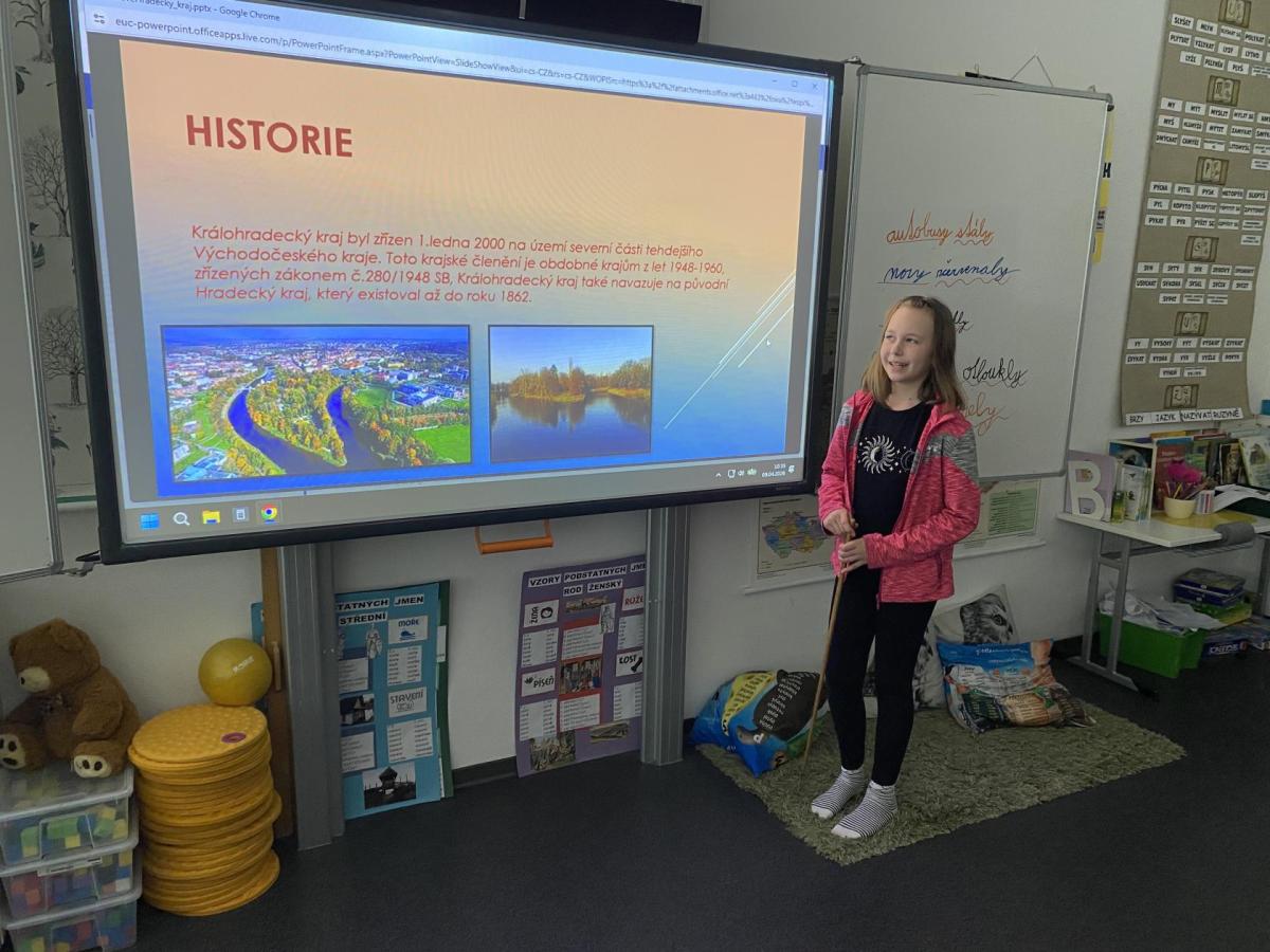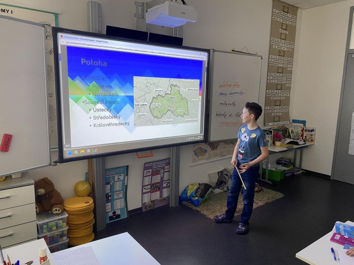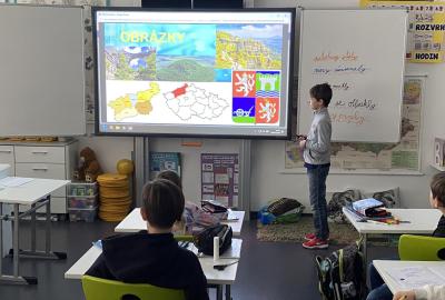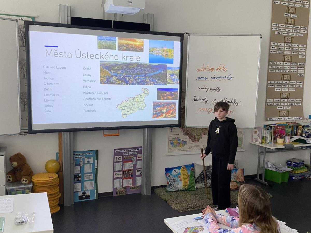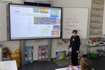 V hodinách vlastivědy se nyní věnujeme zeměpisné části. Právě probíráme kraje České republiky, učíme se o jejich poloze, zajímavostech i významných městech. Součástí naší práce je také domácí příprava prezentací. Každý z nás si vybral jeden kraj či krajské město, o kterém zpracovává informace. Poté svou práci představí spolužákům. Díky tomu si procvičujeme nejen znalosti o naší vlasti, ale zároveń trénujeme vystupování před "publikem", ve kterém je třeba zaujmout, obsáhnout celý prostor třídy hlasově a také se trošku odprostit od trémy. A to se mnohdy zdá nejobtížnější!