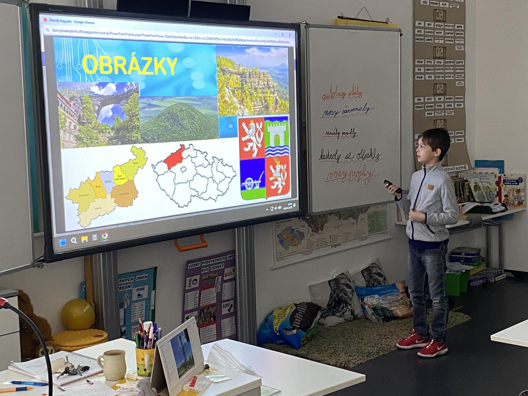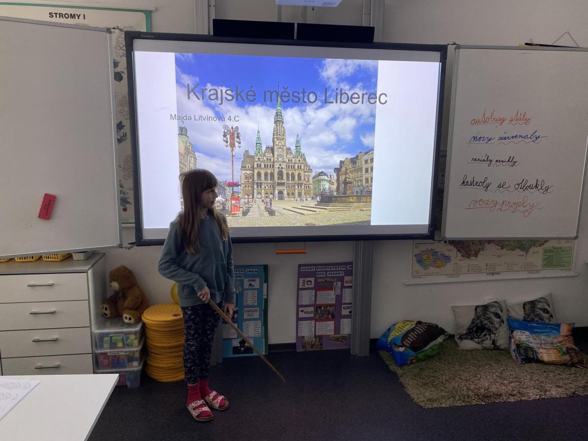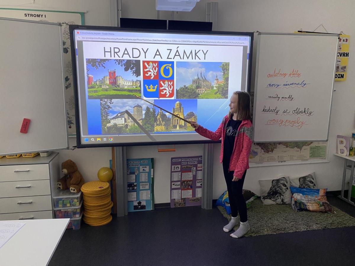 V hodinách vlastivědy se nyní věnujeme zeměpisné části. Právě probíráme kraje České republiky, učíme se o jejich poloze, zajímavostech i významných městech. Součástí naší práce je také domácí příprava prezentací. Každý z nás si vybral jeden kraj či krajské město, o kterém zpracovává informace. Poté svou práci představí spolužákům. Díky tomu si procvičujeme nejen znalosti o naší vlasti, ale zároveń trénujeme vystupování před "publikem", ve kterém je třeba zaujmout, obsáhnout celý prostor třídy hlasově a také se trošku odprostit od trémy. A to se mnohdy zdá nejobtížnější!