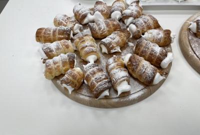 Kluci připravovali kremrole z listového těsta. Naměřili a nakrájeli proužky z listového těsta, namotali je na kovové trubičky a v troubě je správně upekli - to byl základ pro přípravu kremrolí. Druhý krok přípravy kremrolí - opatrně vychladlé upečené kremrole stáhnout z kovových trubiček - hurá povedlo se, a pak už jen naplnit bílkovým italským sněhem. Kremrole, jejichž povrch kluci posypali lehce cukrem, vypadaly krásně a chutnaly jěště líp. Všichn si je pochvalovali.