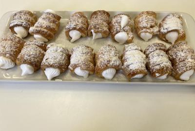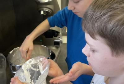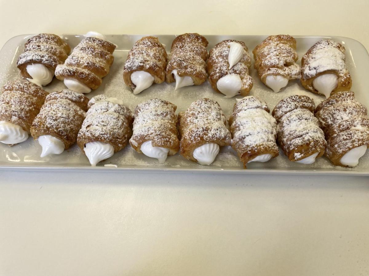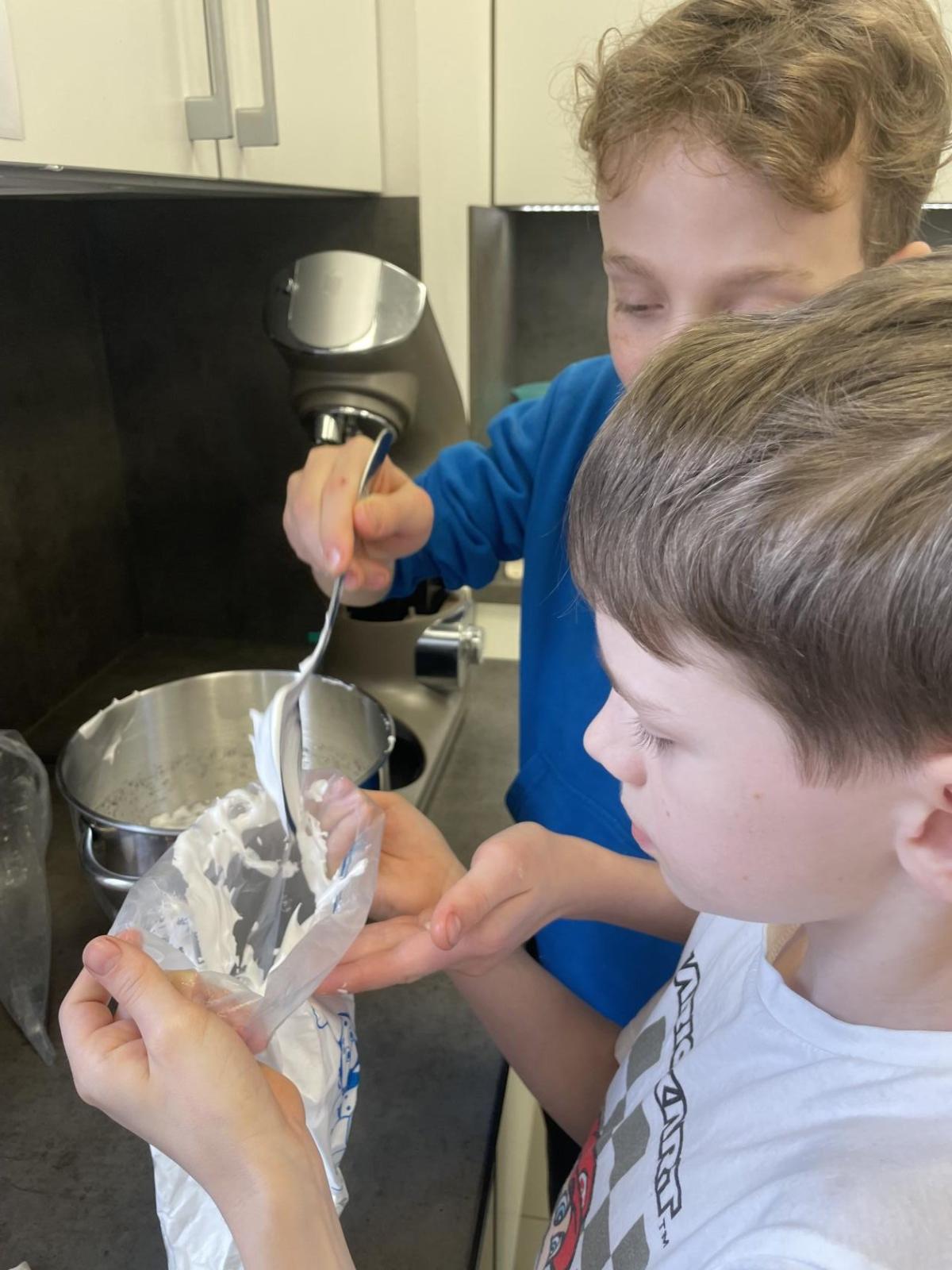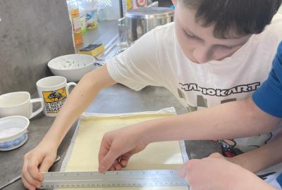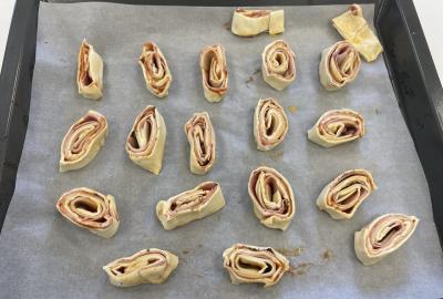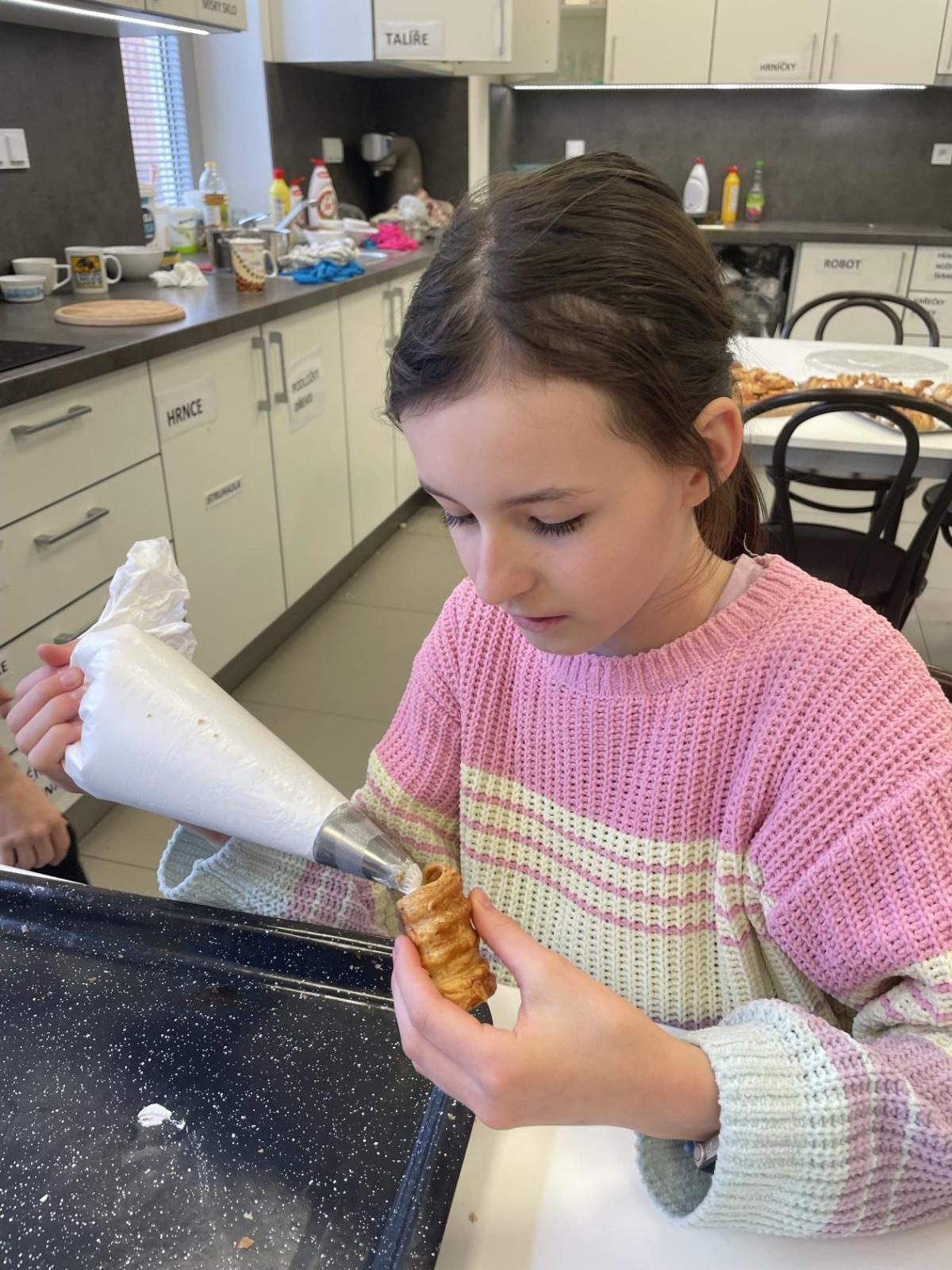 Listové těsto je velmi vděčné, samozřejmě to kupované. Připravit si těsto v kuchyňce, není z časových důvodů možné. Při přípravě kremrolí bylo nejdříve potřeba nakrájet z těsta stejně široké proužky. Kluci byli šikovní a vymysleli při přípravě proužků použít kovové pravítko ...a bylo hotovo. Natočit proužky na kovové trubičky, už byla jednoduchá práce. Plnění kremrolí bílkovým sněhem cukrářským sáčkem se zdobící špičkou, si vyzkoušely všechny děti. Jako slanou variaci z listového těsta připravila děvčata šneky.