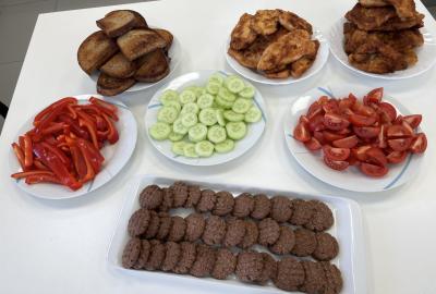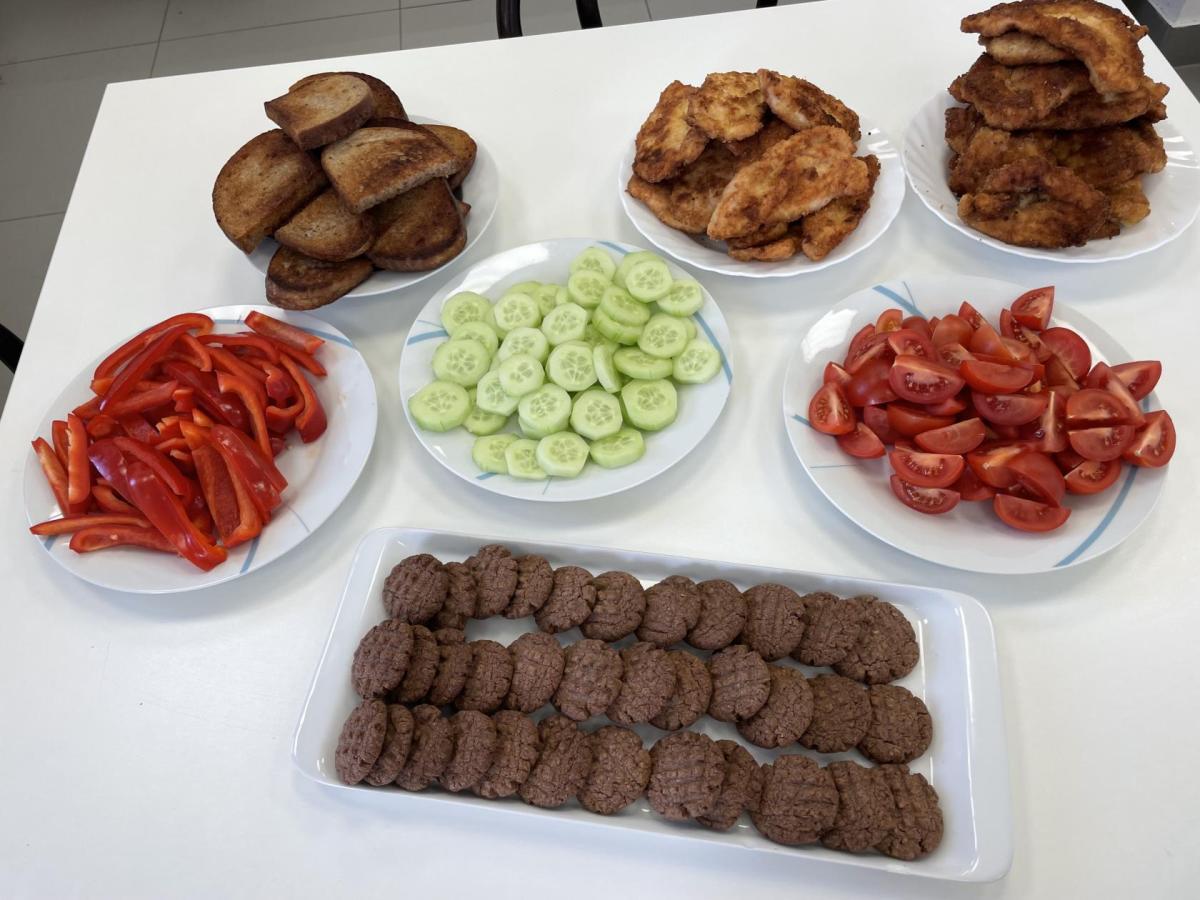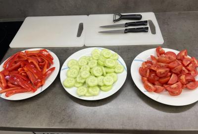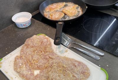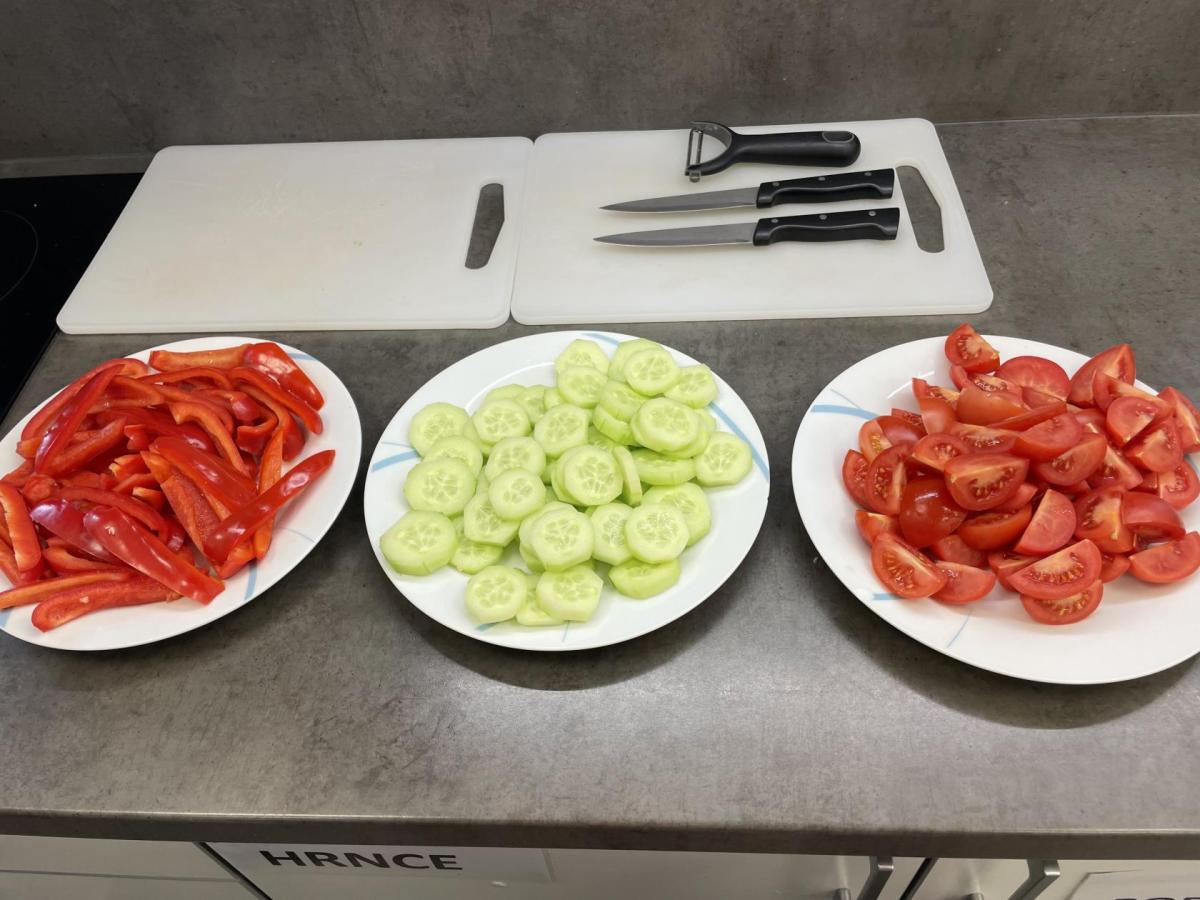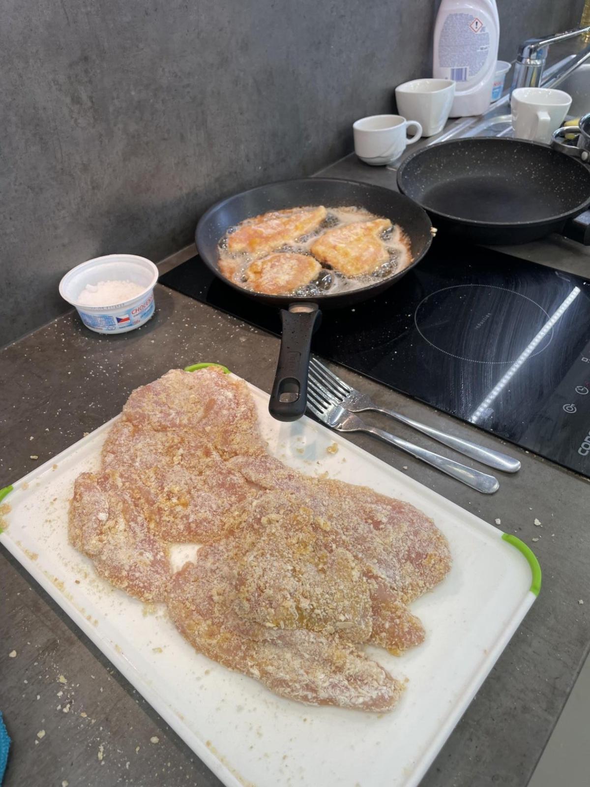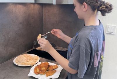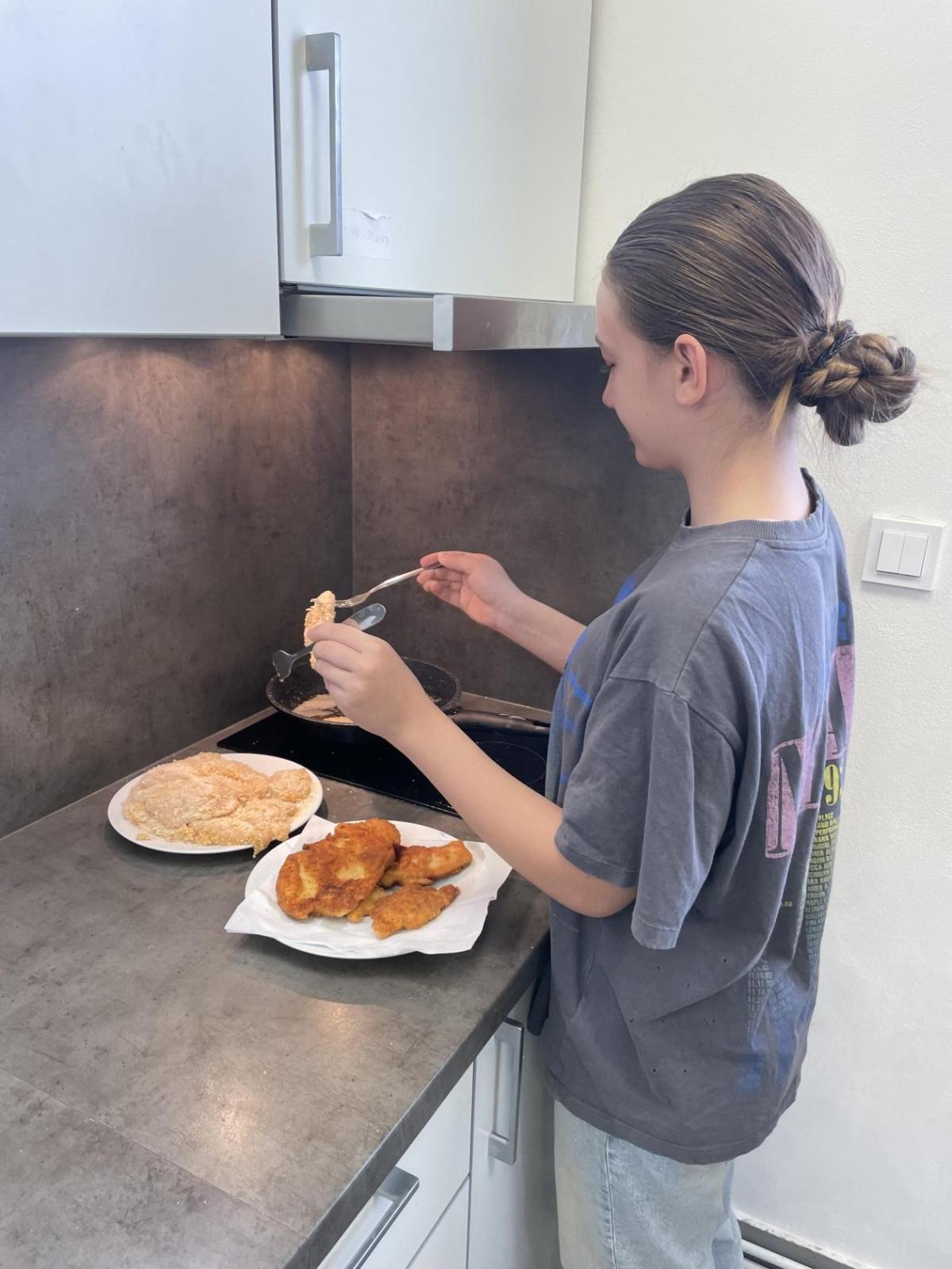 Tentokráte maso připravovaly dívky - nasolily kuřecí po obou stranách, obalily je v trojobalu. A pak už jen osmažit řízky dozlatova po obou dvou stranách, hlavně je nespálit. Povedlo se. Kluci nakrájeli zeleninu a krásně ji naskládali na talíře, z chleba pak usmažili topinky. A jěště něco sladkého-kokosové sušenky, které se vždy povedou.