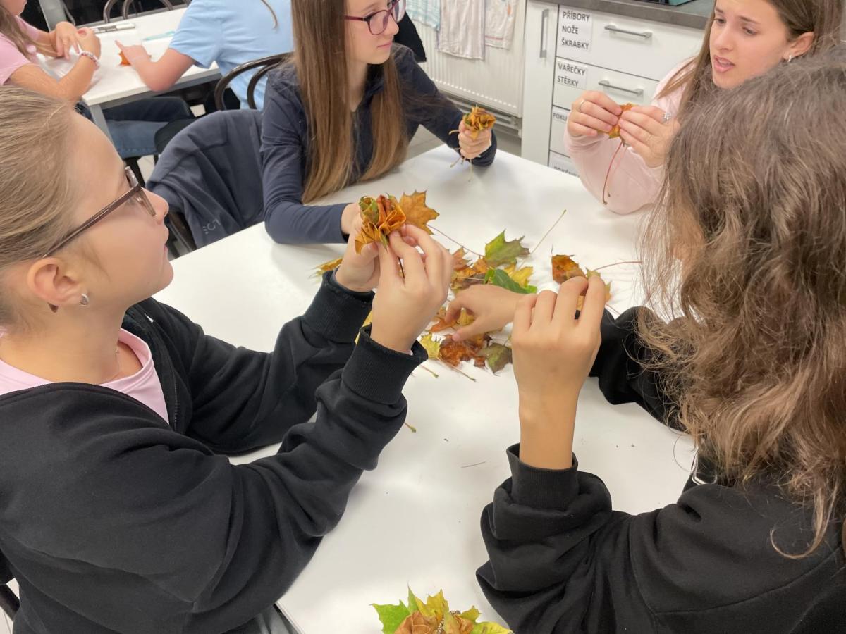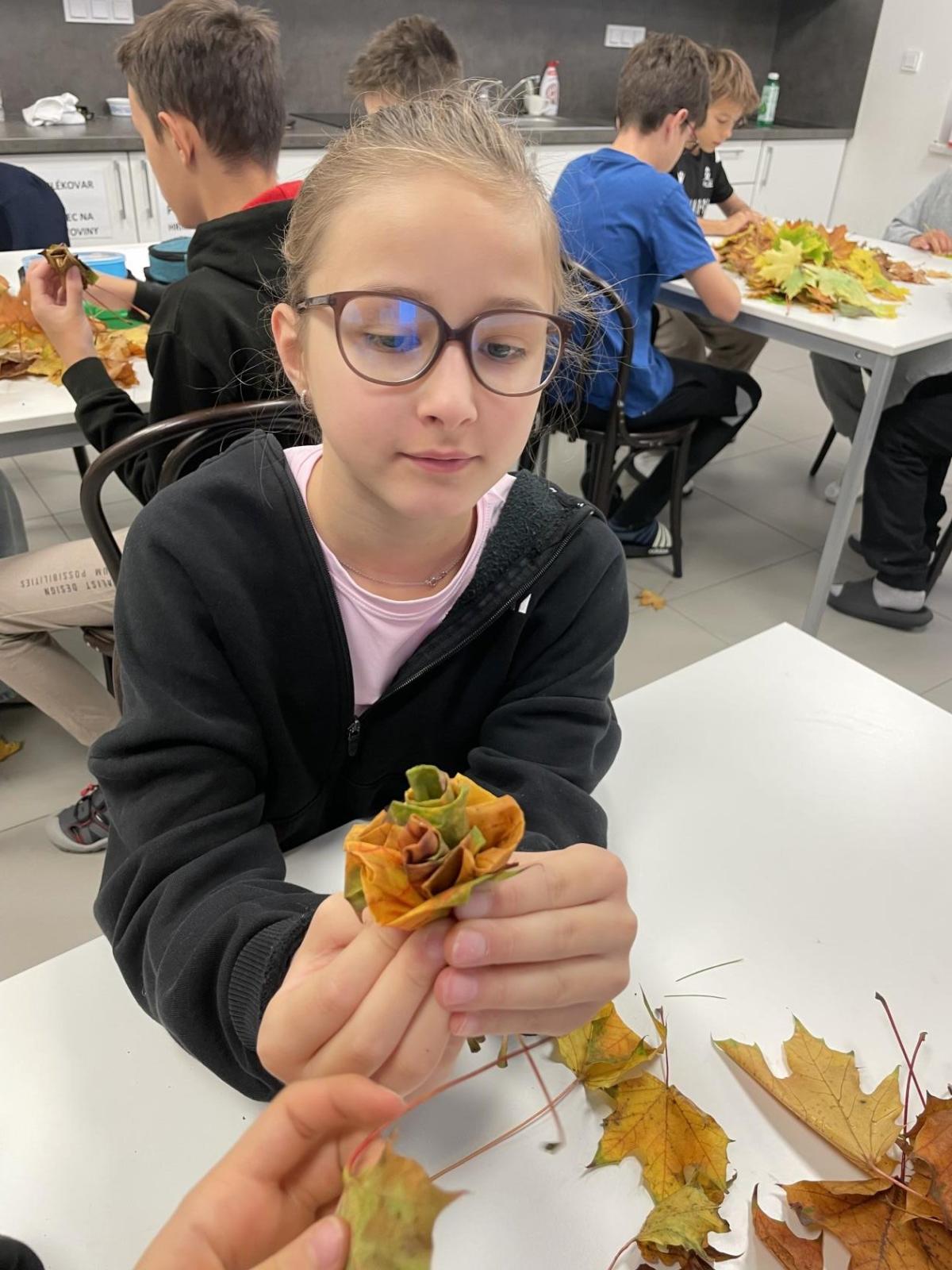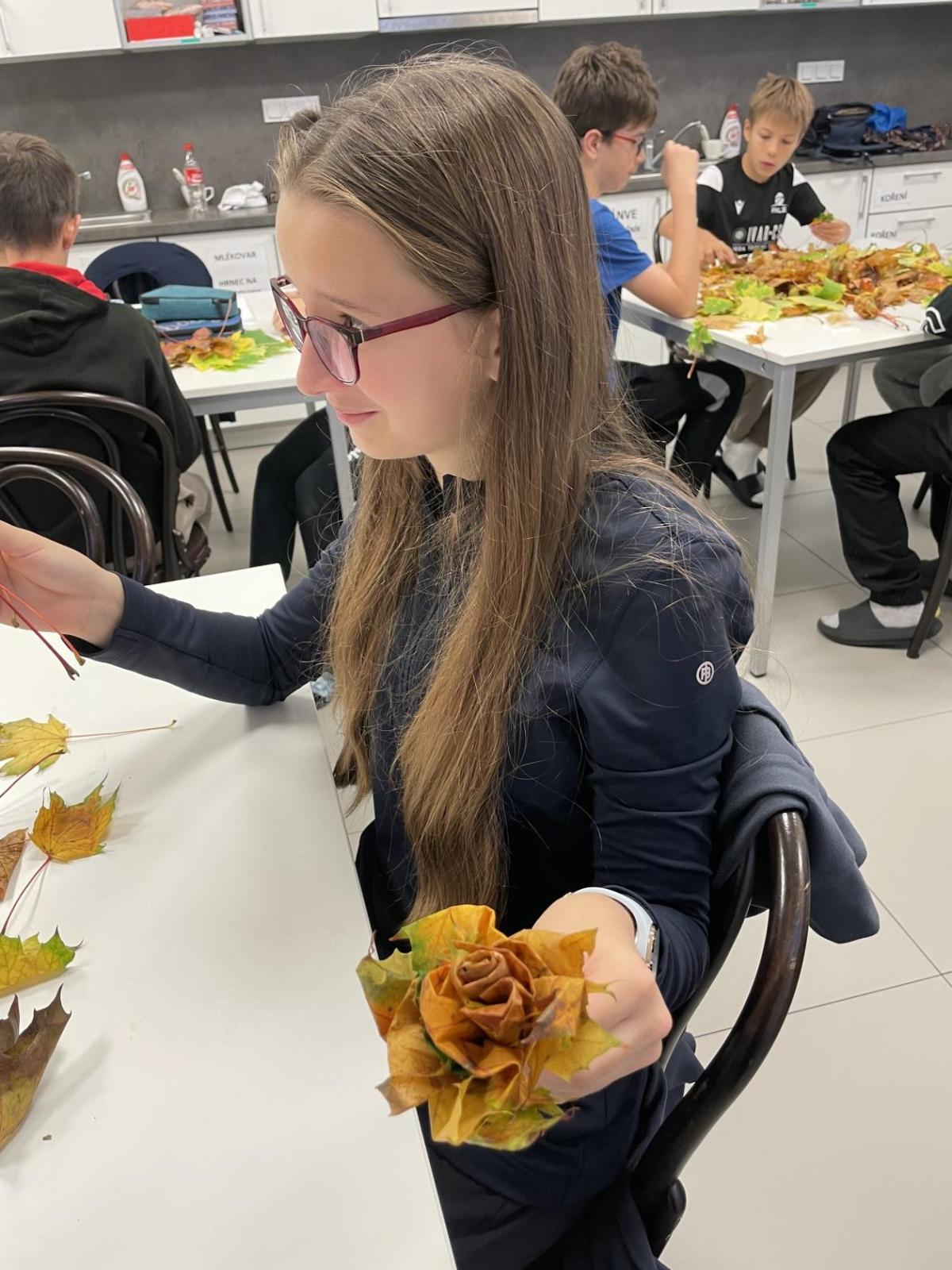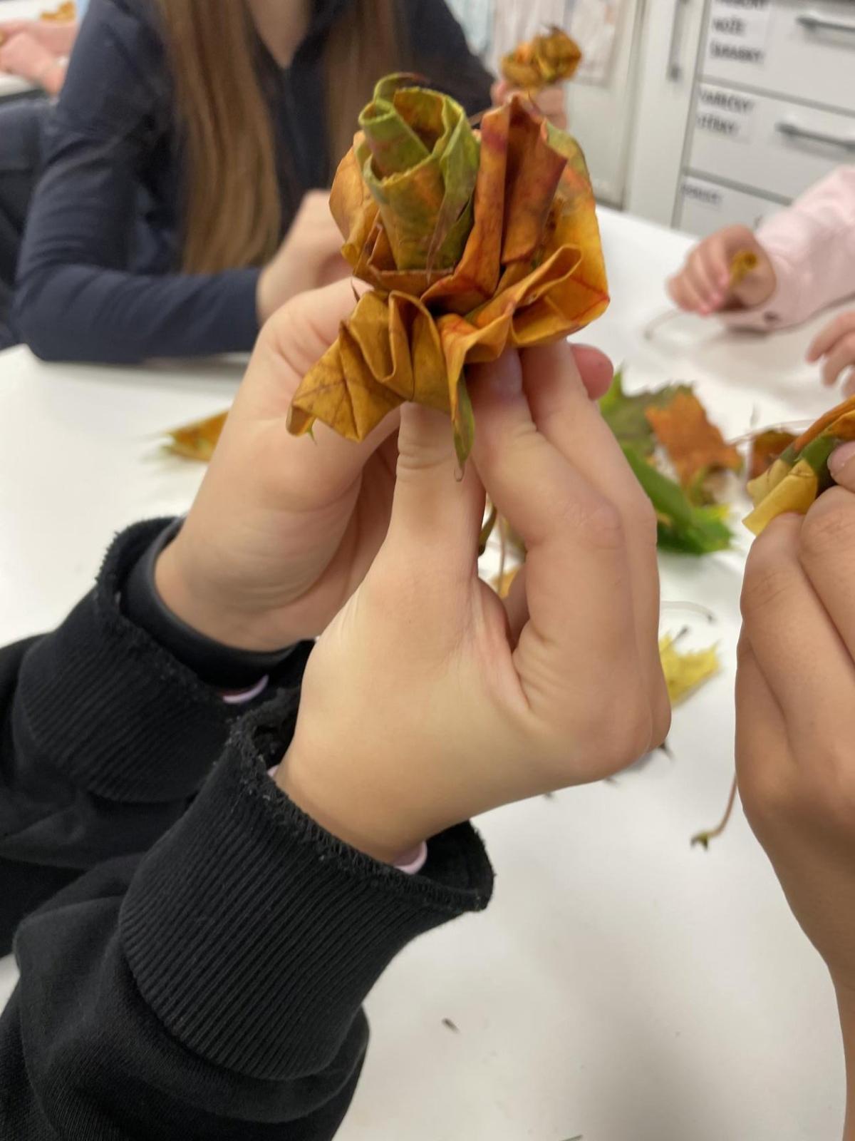 Dnes jsme využili při tvoření barevné podzimní listí javoru, který roste přímo pod okny třídy 6.b. Paní asistentka Jitka ukázala dětem, jak z listů vytvoří růžičky a pak je uváží do většího pugetu. Já jsem celý proces tvoření zdokumentovala. Ačkoliv 1. uvázání kytičky každému nešlo tak, jak by si představoval, finální dílo se vydařilo. Díky barevnosti podzimních listů každá růže byla originálem. Děti z nich naaranžovaly podzimní dekoraci do košíku, kterou si vyzdobily svoji třídu.