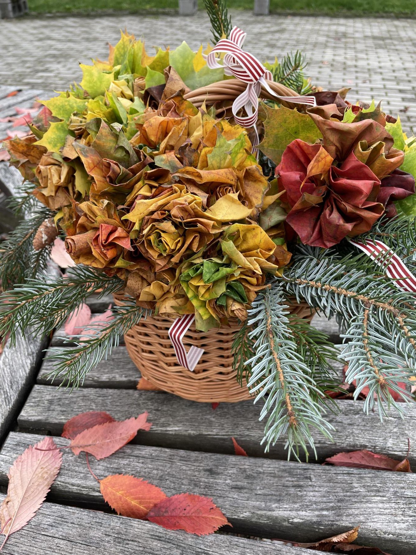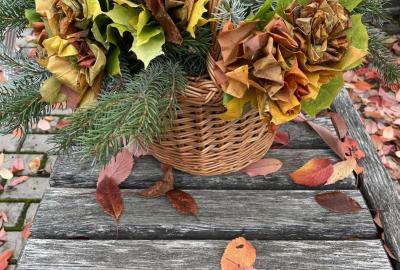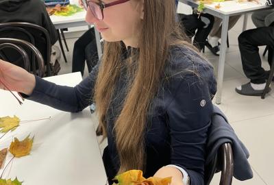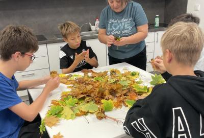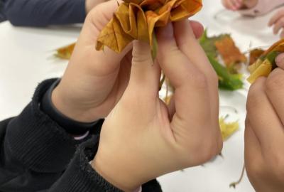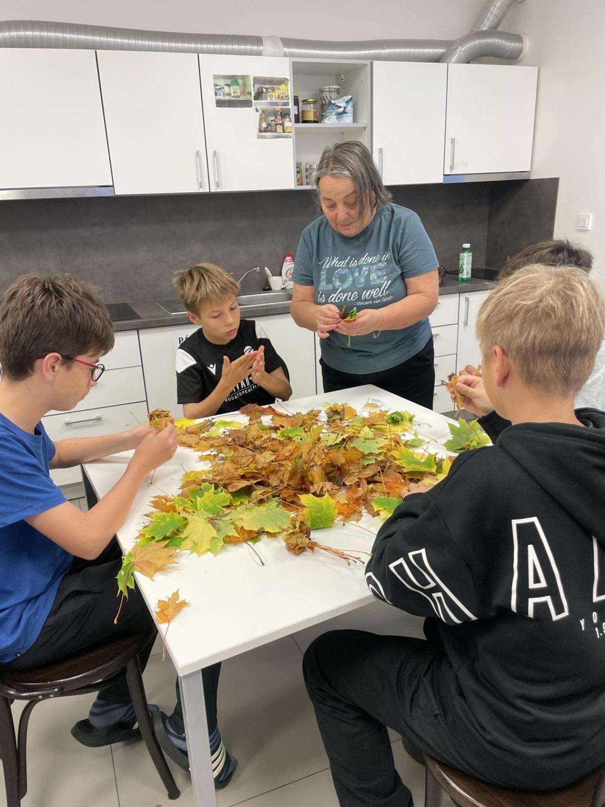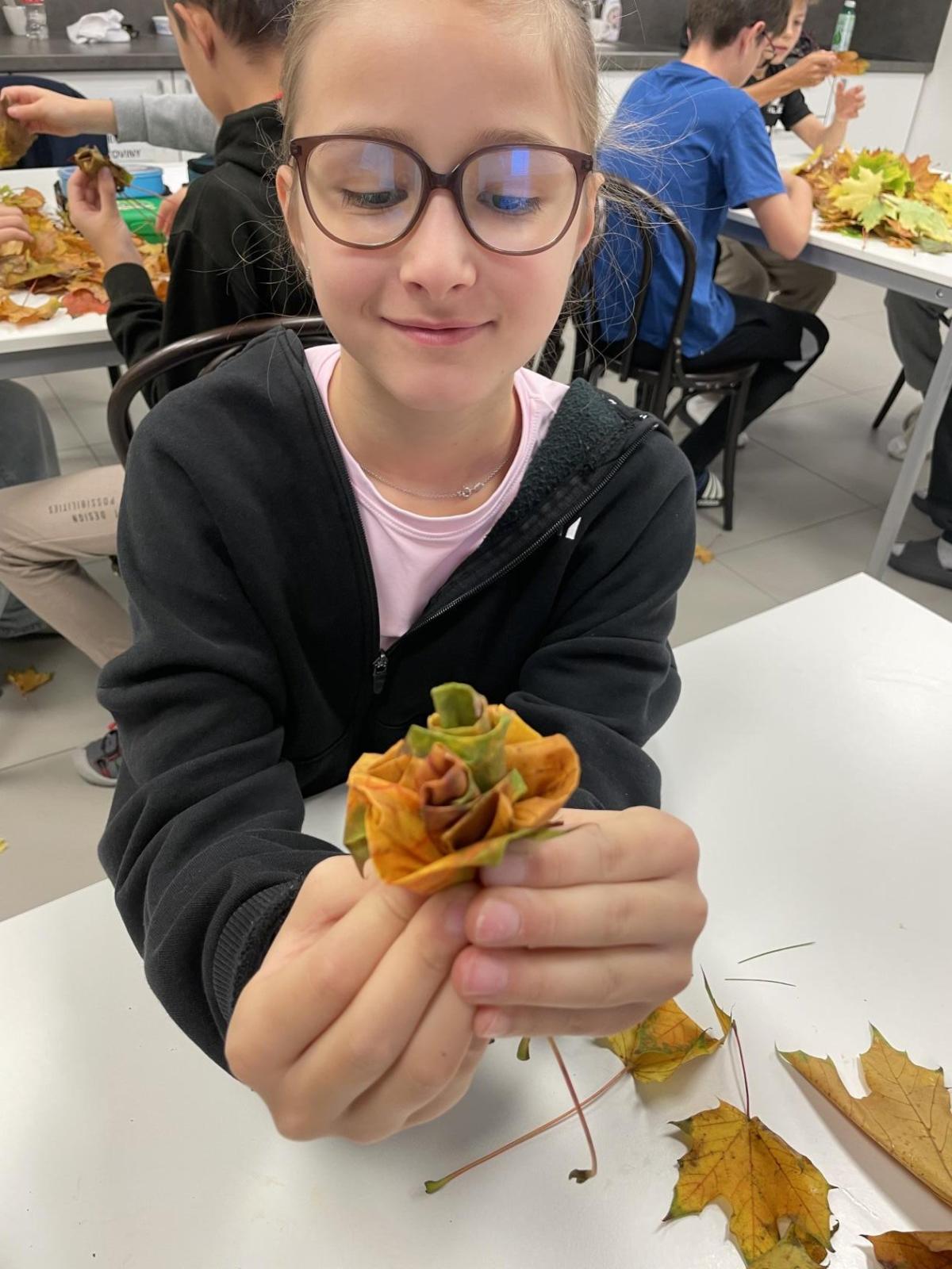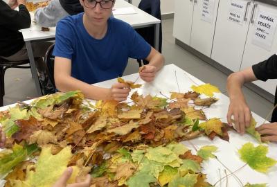 Dnes jsme využili při tvoření barevné podzimní listí javoru, který roste přímo pod okny třídy 6.b. Paní asistentka Jitka ukázala dětem, jak z listů vytvoří růžičky a pak je uváží do většího pugetu. Já jsem celý proces tvoření zdokumentovala. Ačkoliv 1. uvázání kytičky každému nešlo tak, jak by si představoval, finální dílo se vydařilo. Díky barevnosti podzimních listů každá růže byla originálem. Děti z nich naaranžovaly podzimní dekoraci do košíku, kterou si vyzdobily svoji třídu.