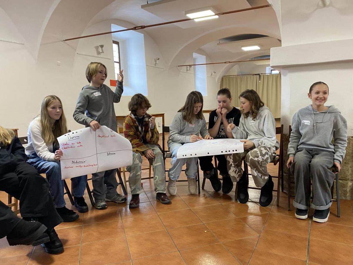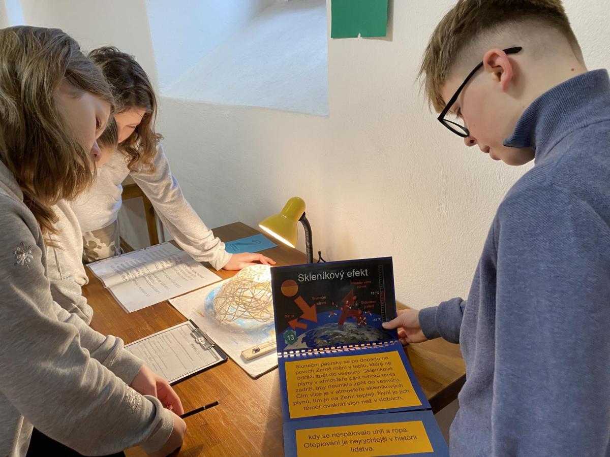 V pátek sedmáci navštívili zajímavý workshop v Toulcově dvoře. Program nazvaný Klimatická mozaika je určený starším dětem v řadě zemí po celém světě. Žáci se nejprve ve skupinkách pokusili odpovědět na otázky týkající se změny klimatu. Svou odpověď pak ověřovali klimatickým pokusem, jehož výsledky zaznamenali do "průvodky". Následovala obrázková karetní hra, která dětem umožnila pochopit souvislosti a zpřehlednit základní informace o změně klimatu. Na závěr pak navrhovali vlastní řešení, jak klima ochránit.