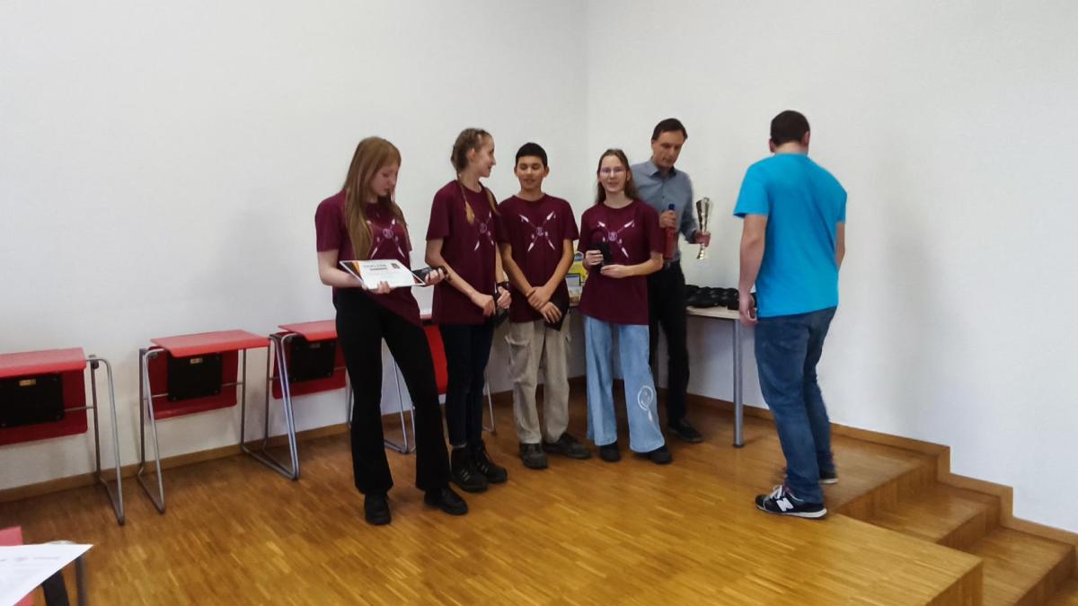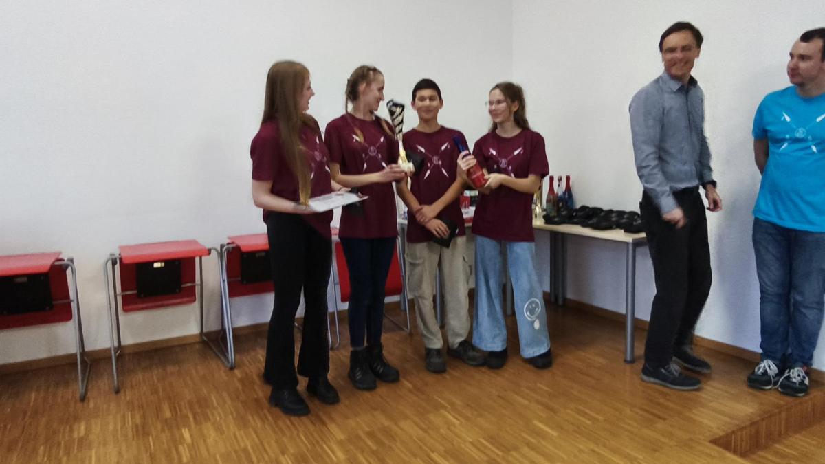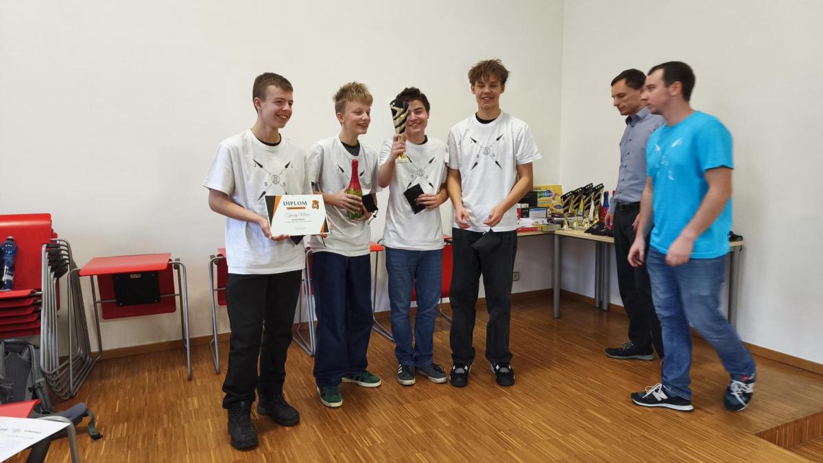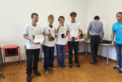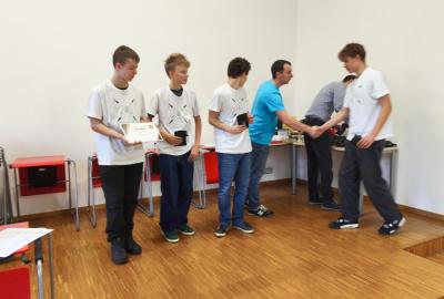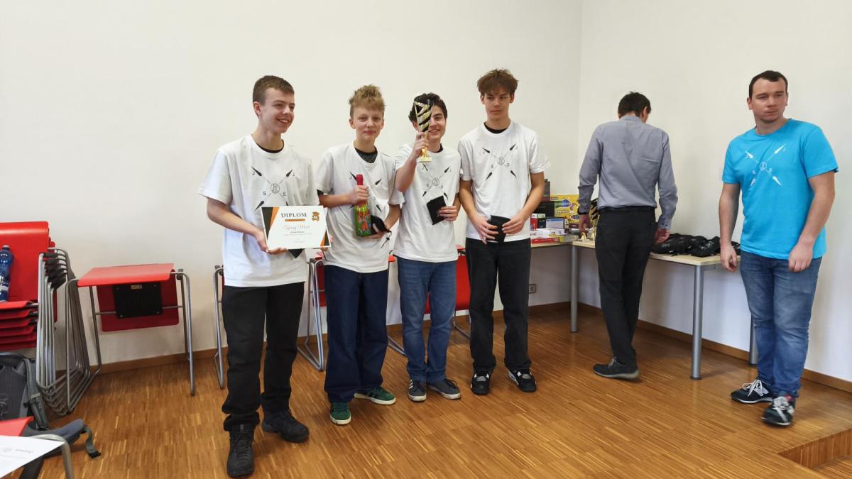 Ve středu jsme pak vyrazili na gymnázium Na Jarošce a po prezenci a objasnění pravidel už začala vlastní hra. Tým Metvětice & Gumítek (ve složení Anička Halbichová, Kačka Kopalová, Terka Voříšková a Vilém Havlíček) již od začátku hry dominoval a bylo jasné, že těm začátek hry lépe sednout nemohl. Naopak pro náš tým (ve složení Vojta Vrňata, Honza Škrob, Martin Řezníček a Jenda Kovařík) to nevypadalo první dvě hodiny vůbec ideálně, ale nakonec se nám za posledních 20 minut podařilo vyřešit neuvěřitelných 5 úloh za 16 bodů a povedlo se nám dotáhnout na stupně vítězů. Průběh soutěže byl totiž první dvě hodiny zveřejňován na tabuli v aule, kde jsme soutěžili. Na posledních 30 minut ale organizátoři vše vypnuli. Do závěrečného vyhlašování výsledků jsme tedy netušili, jak nakonec naše výprava dopadne. Tajně jsme doufali, že si jeden pohár odvezeme.