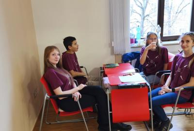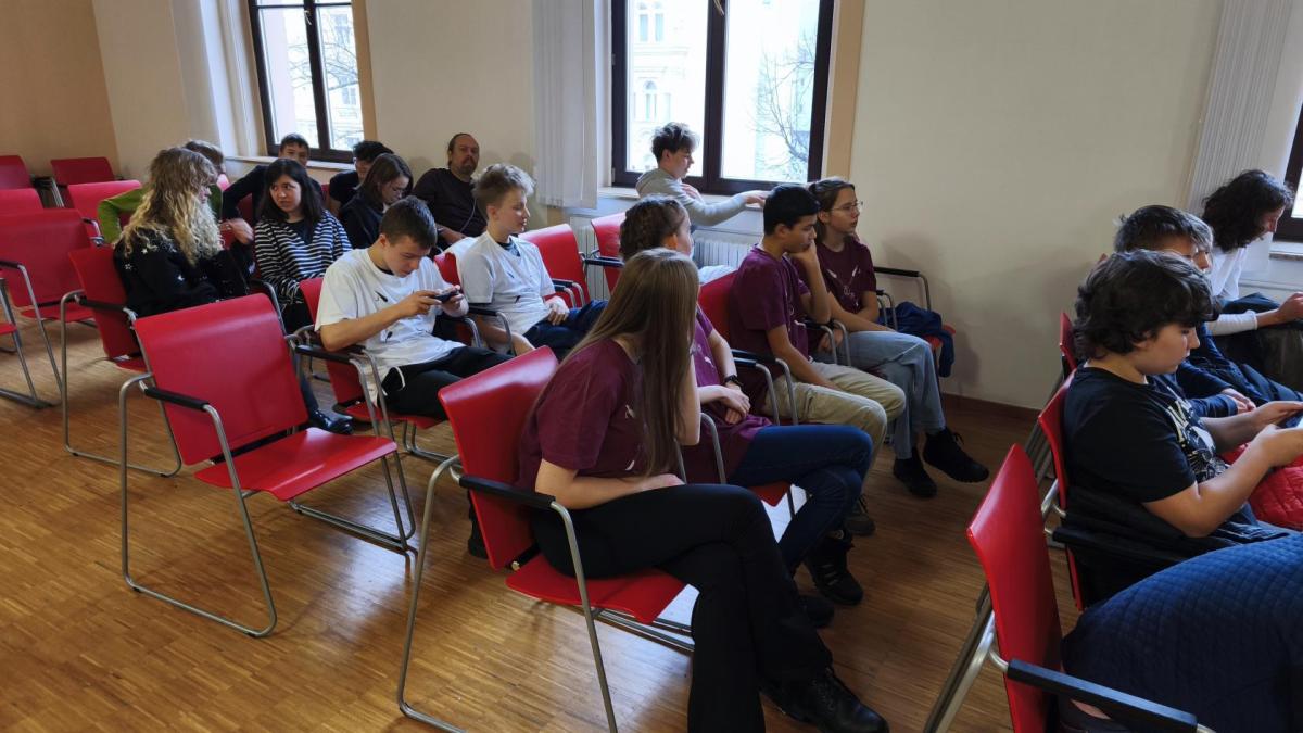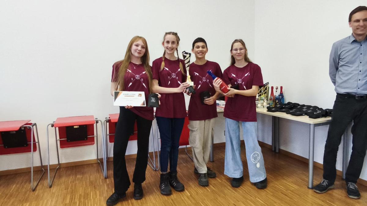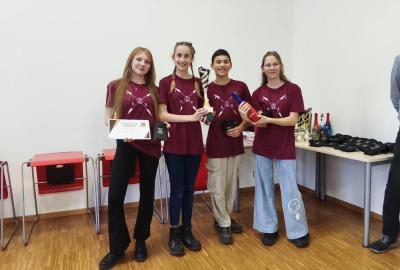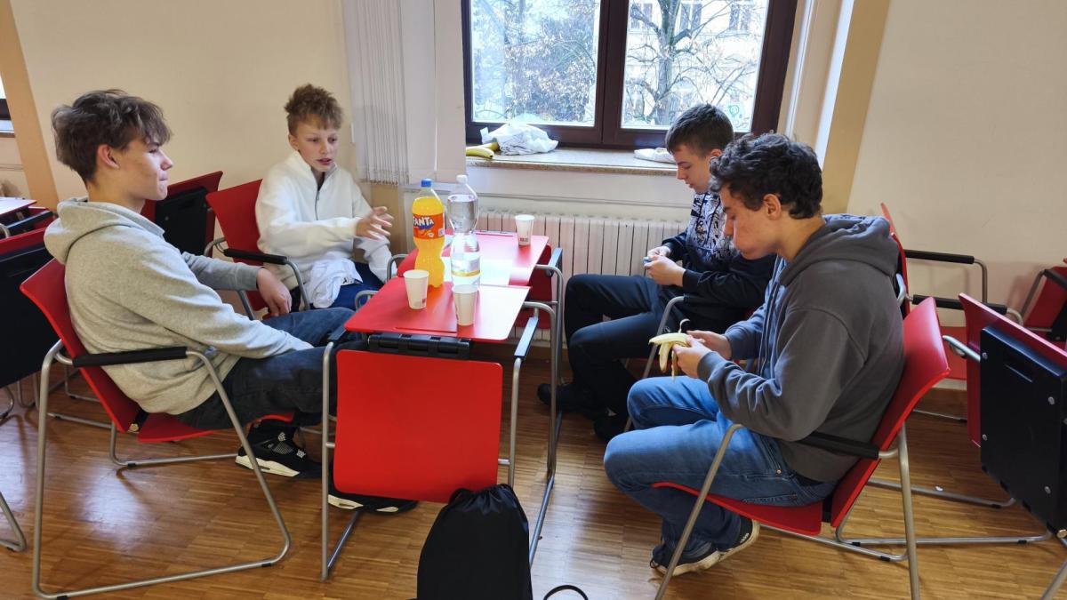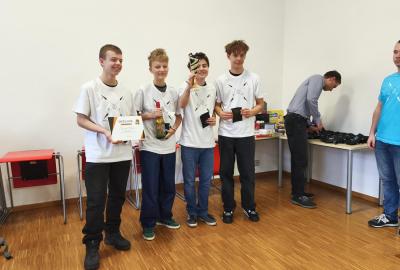 Ve středu jsme pak vyrazili na gymnázium Na Jarošce a po prezenci a objasnění pravidel už začala vlastní hra. Tým Metvětice & Gumítek (ve složení Anička Halbichová, Kačka Kopalová, Terka Voříšková a Vilém Havlíček) již od začátku hry dominoval a bylo jasné, že těm začátek hry lépe sednout nemohl. Naopak pro náš tým (ve složení Vojta Vrňata, Honza Škrob, Martin Řezníček a Jenda Kovařík) to nevypadalo první dvě hodiny vůbec ideálně, ale nakonec se nám za posledních 20 minut podařilo vyřešit neuvěřitelných 5 úloh za 16 bodů a povedlo se nám dotáhnout na stupně vítězů. Průběh soutěže byl totiž první dvě hodiny zveřejňován na tabuli v aule, kde jsme soutěžili. Na posledních 30 minut ale organizátoři vše vypnuli. Do závěrečného vyhlašování výsledků jsme tedy netušili, jak nakonec naše výprava dopadne. Tajně jsme doufali, že si jeden pohár odvezeme.