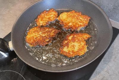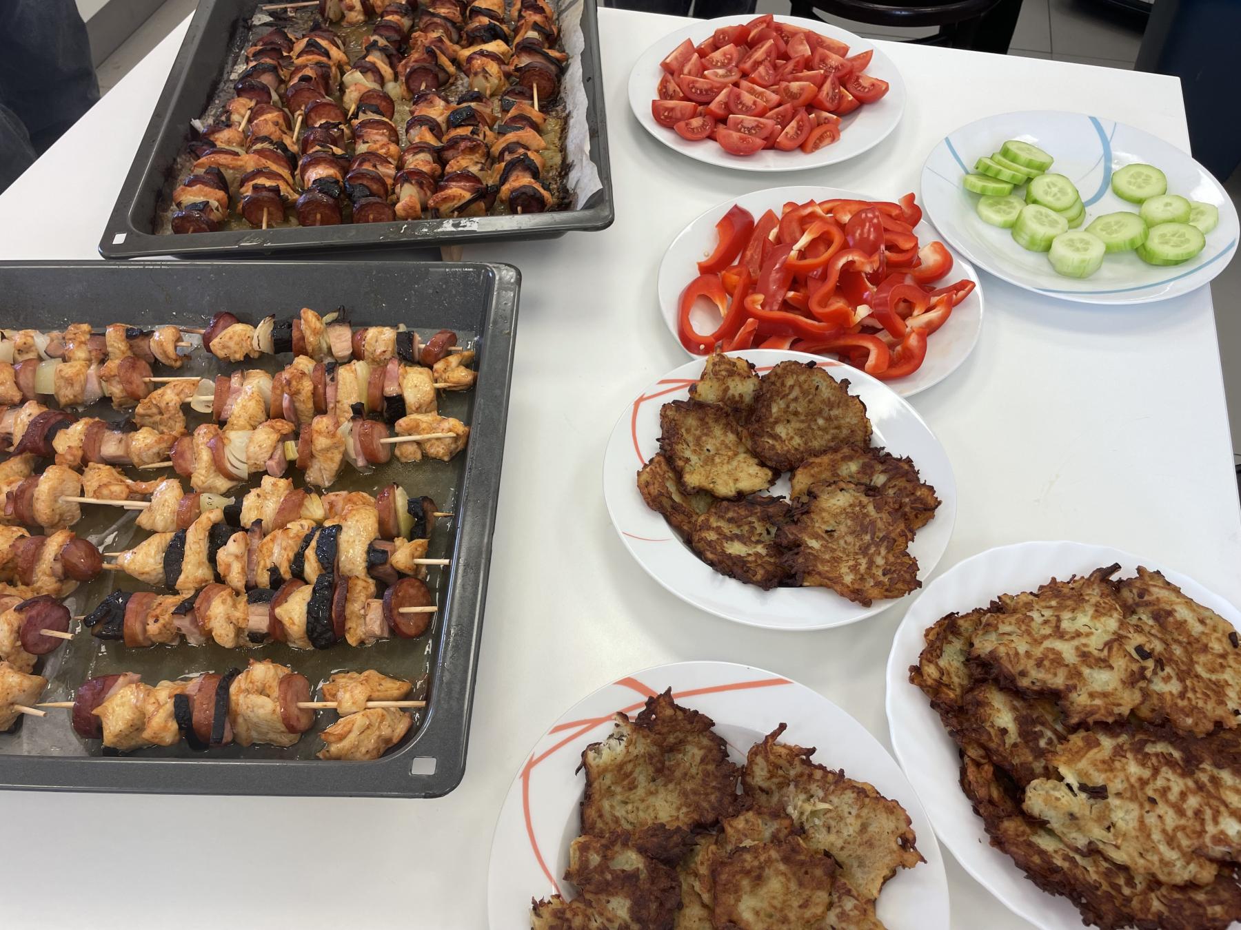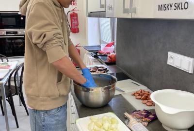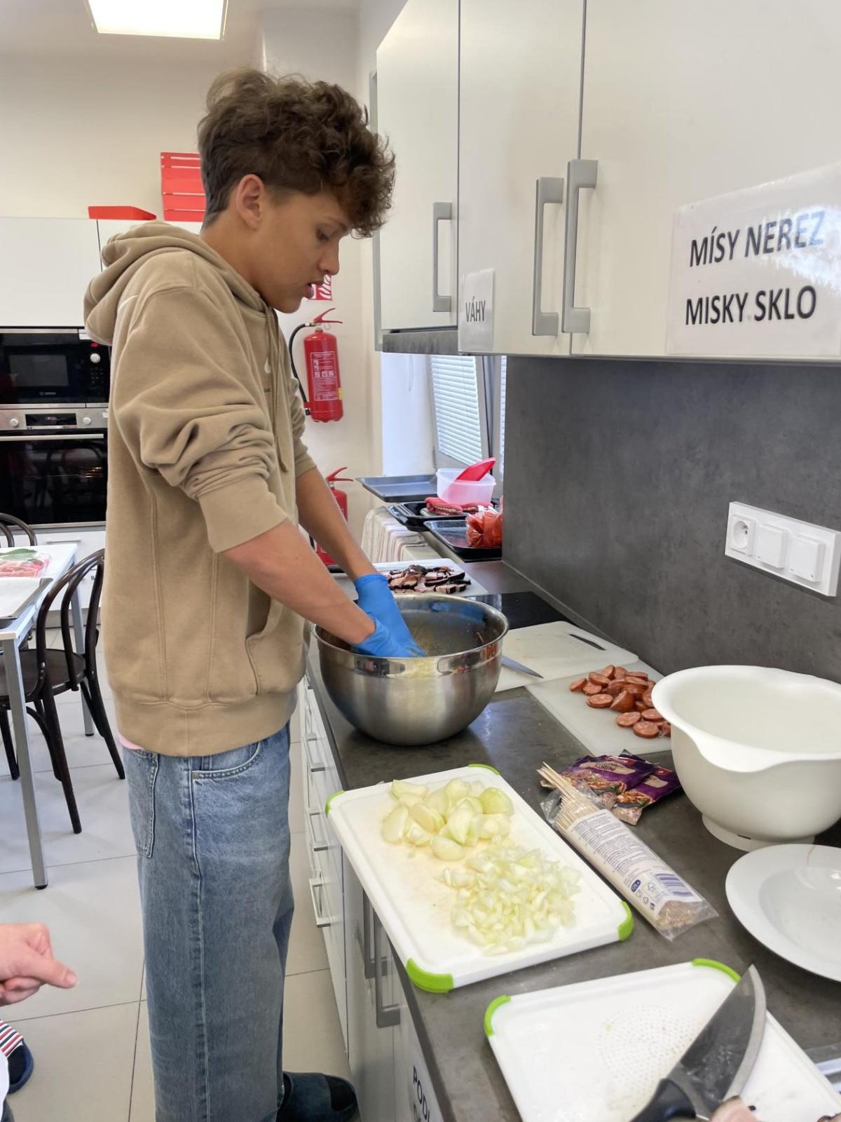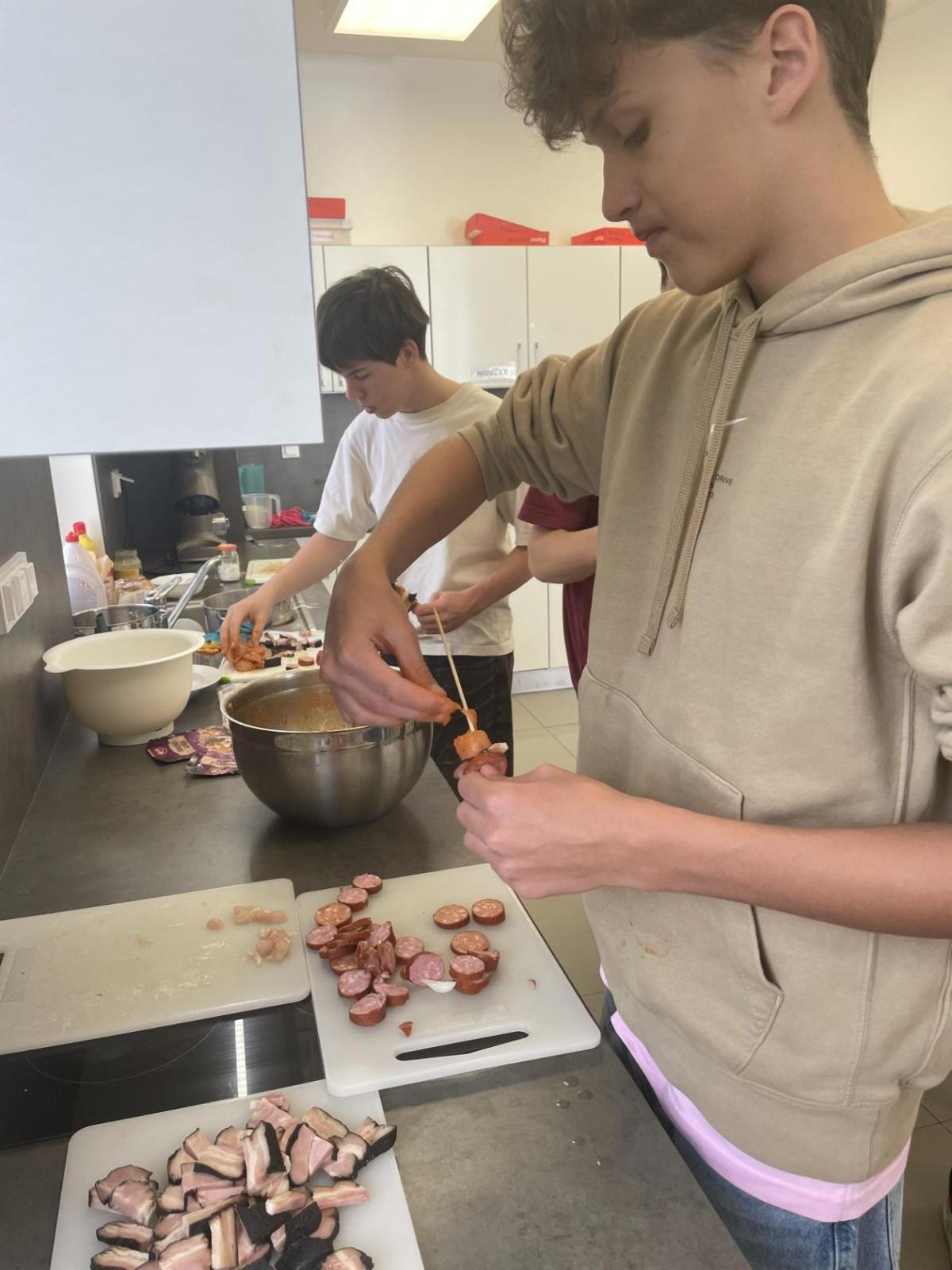 Maso rádi připravuji chlapci, takže krájeli maso, klobásu, anglickou slaninu a cibuli, aby připravené suroviny střídavě napichovali na špejle. Špízy pak upekli v troubě. Děvčata vytvořila z brambor a všech ingrediencí těsto na bramboráky.