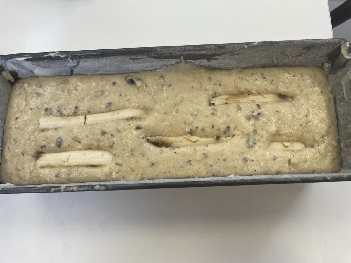 kuřecí špízy, bramboráky, zeleninová obloha, banánový chlebíček
