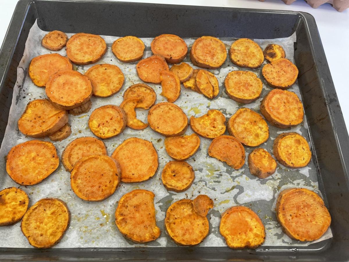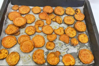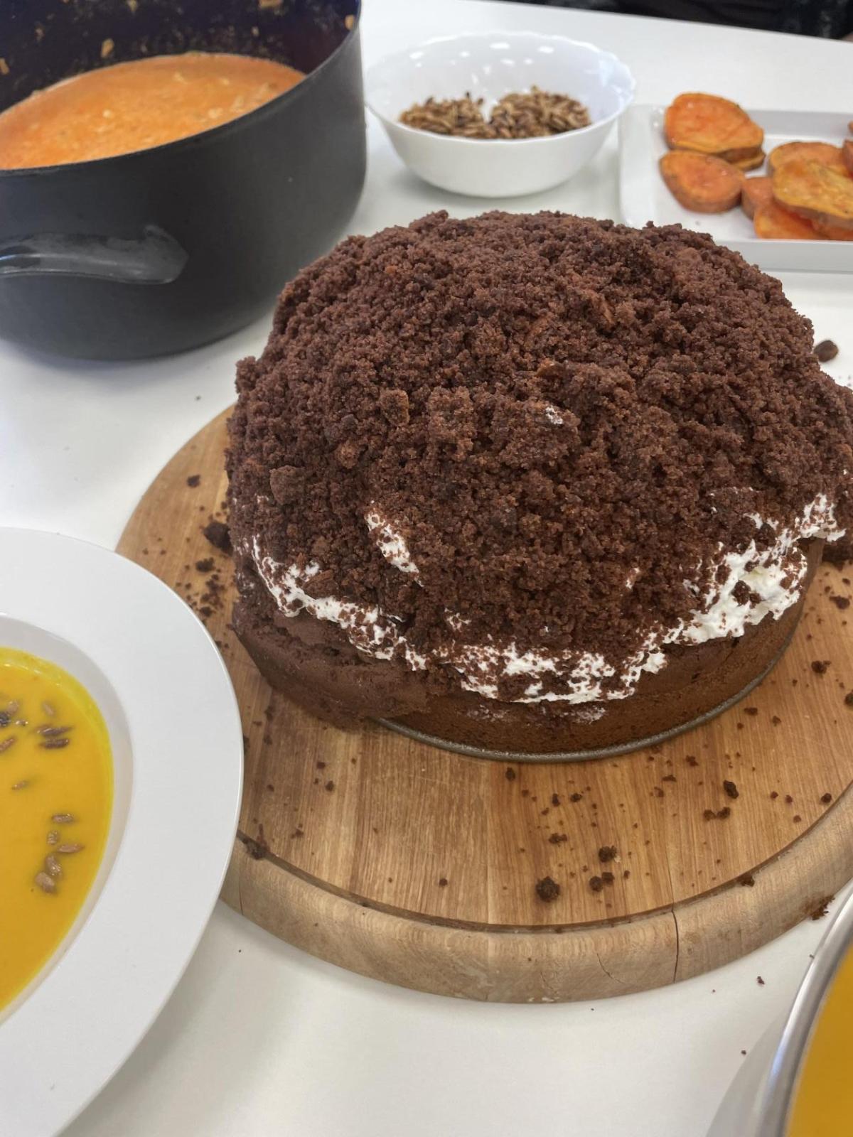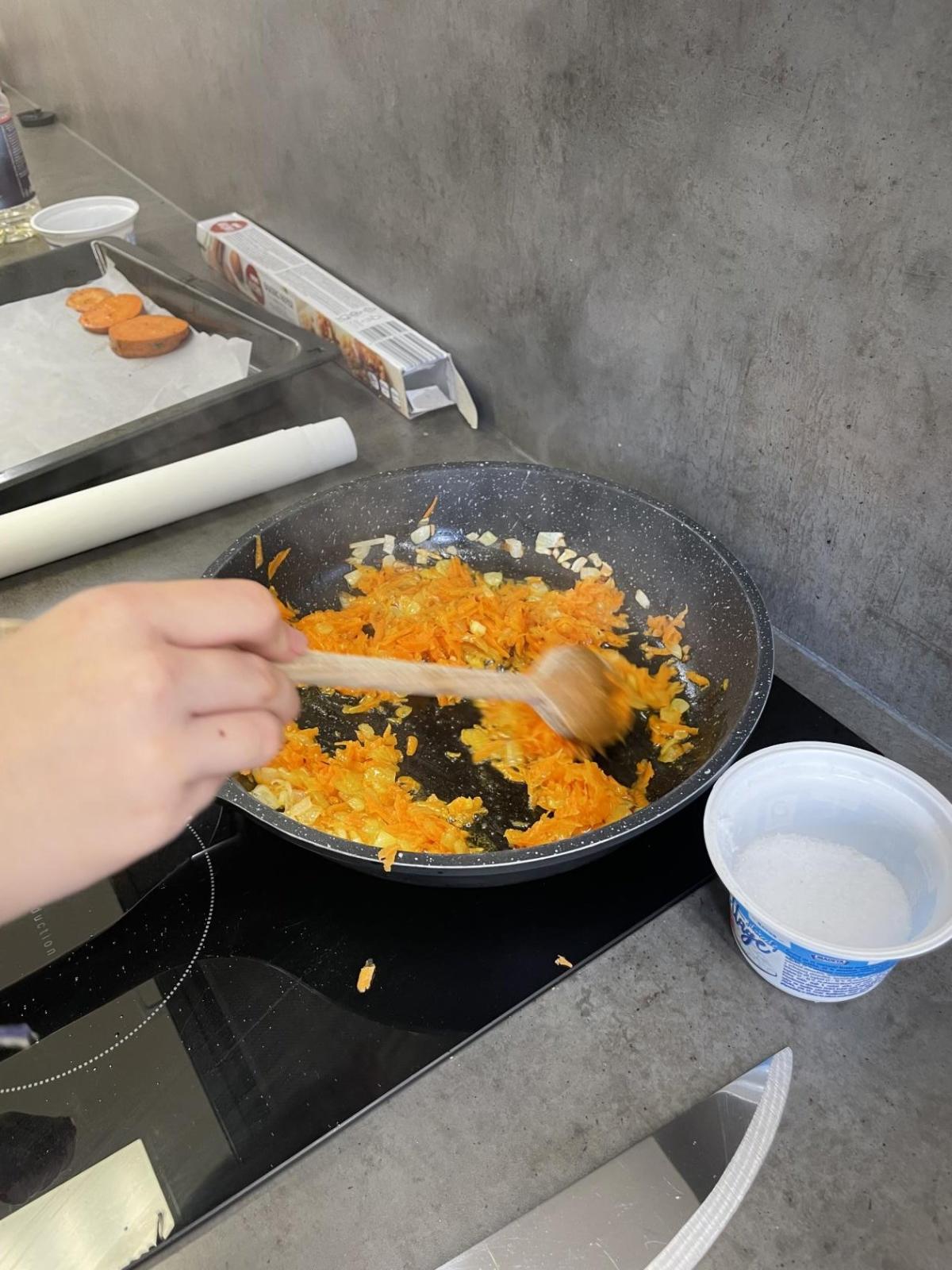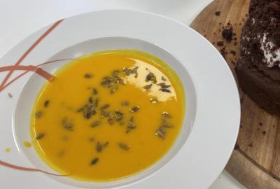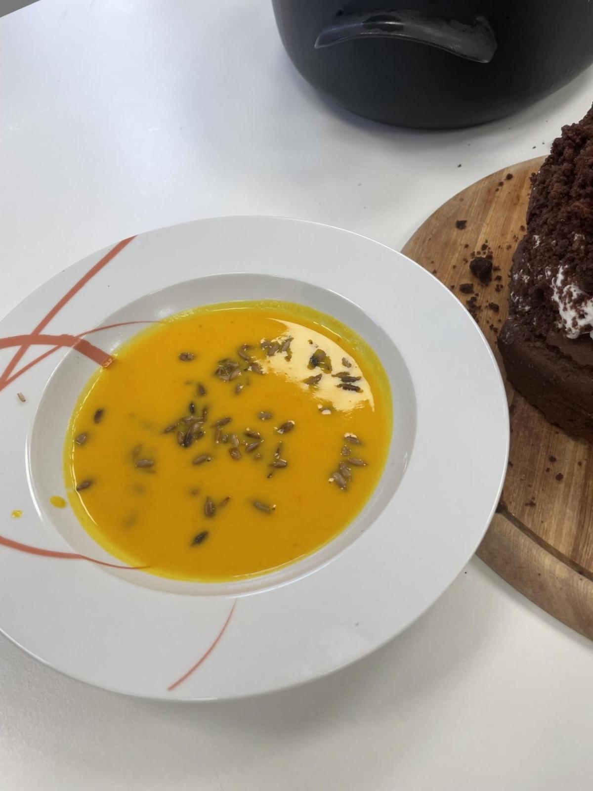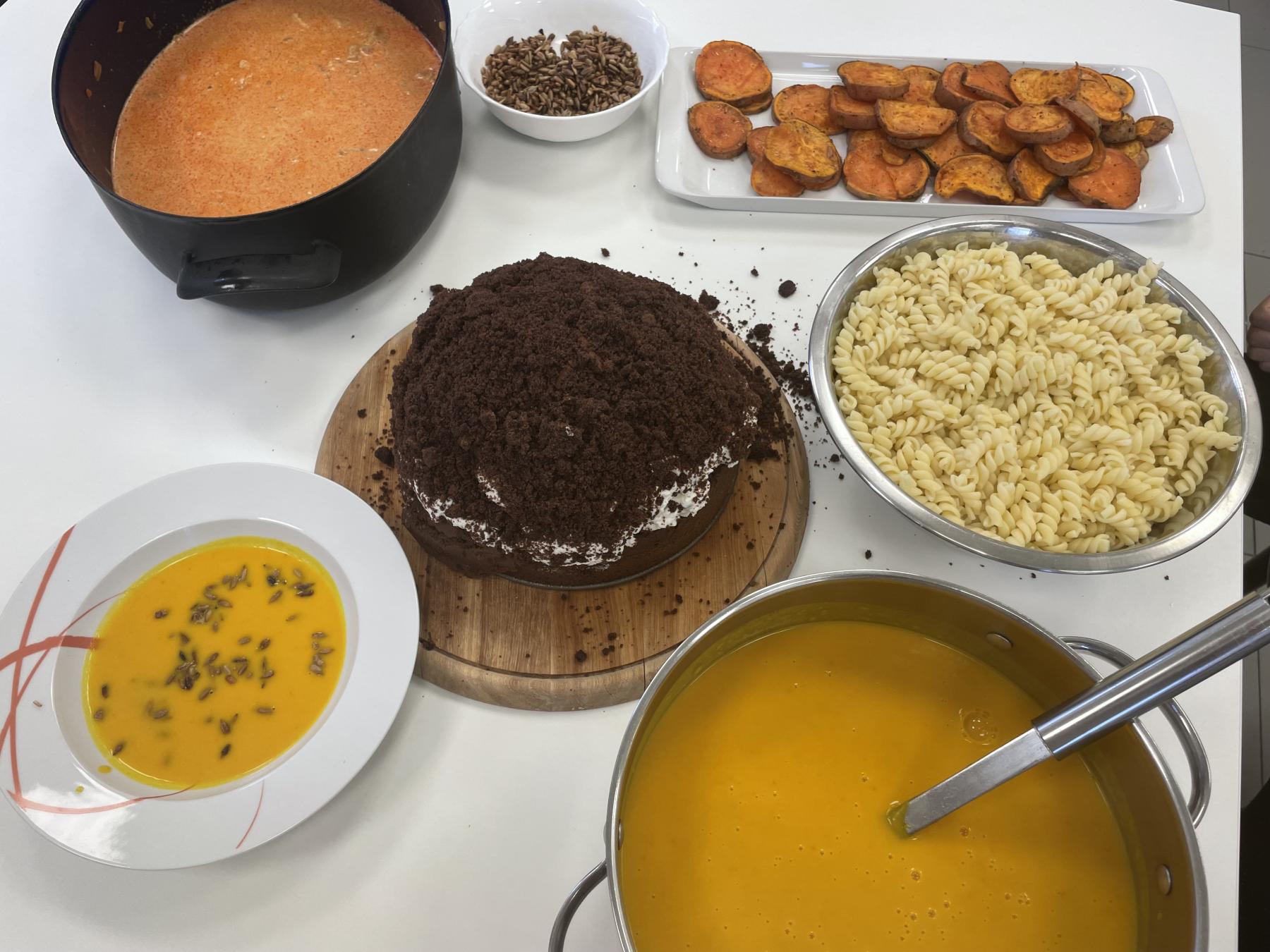 Dýňová polévka, kuřecí na paprice s těstovinami, Krtkův dort, batáty, banánový šejk