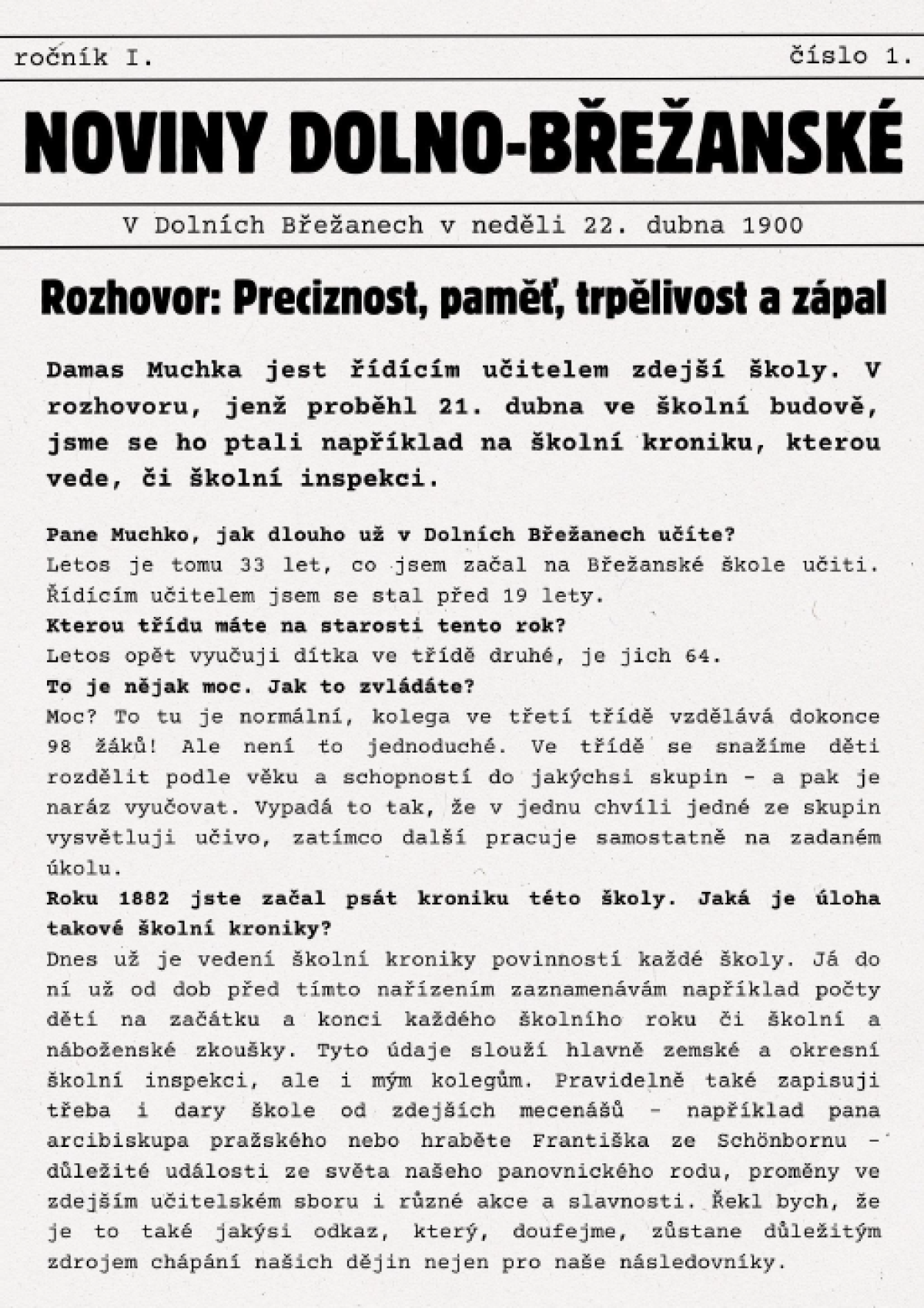 Osobnost Damase Muchky a jeho odkaz inspirují i naše současné žáky. V minulém školním roce si jej jako téma v rámci celostátního kola Dějepisné olympiády vybrala Dominika Macáková z 9. třídy. V návaznosti na zadání práce udělala s panem řídícím učitelem Muchkou fiktivní rozhovor pro "Dolno-Břežanské noviny". Rozhovor, ač je fiktivní, čerpá fakta právě ze školní kroniky a dále přibližuje fungování a atmosféru školy v tehdejší době.